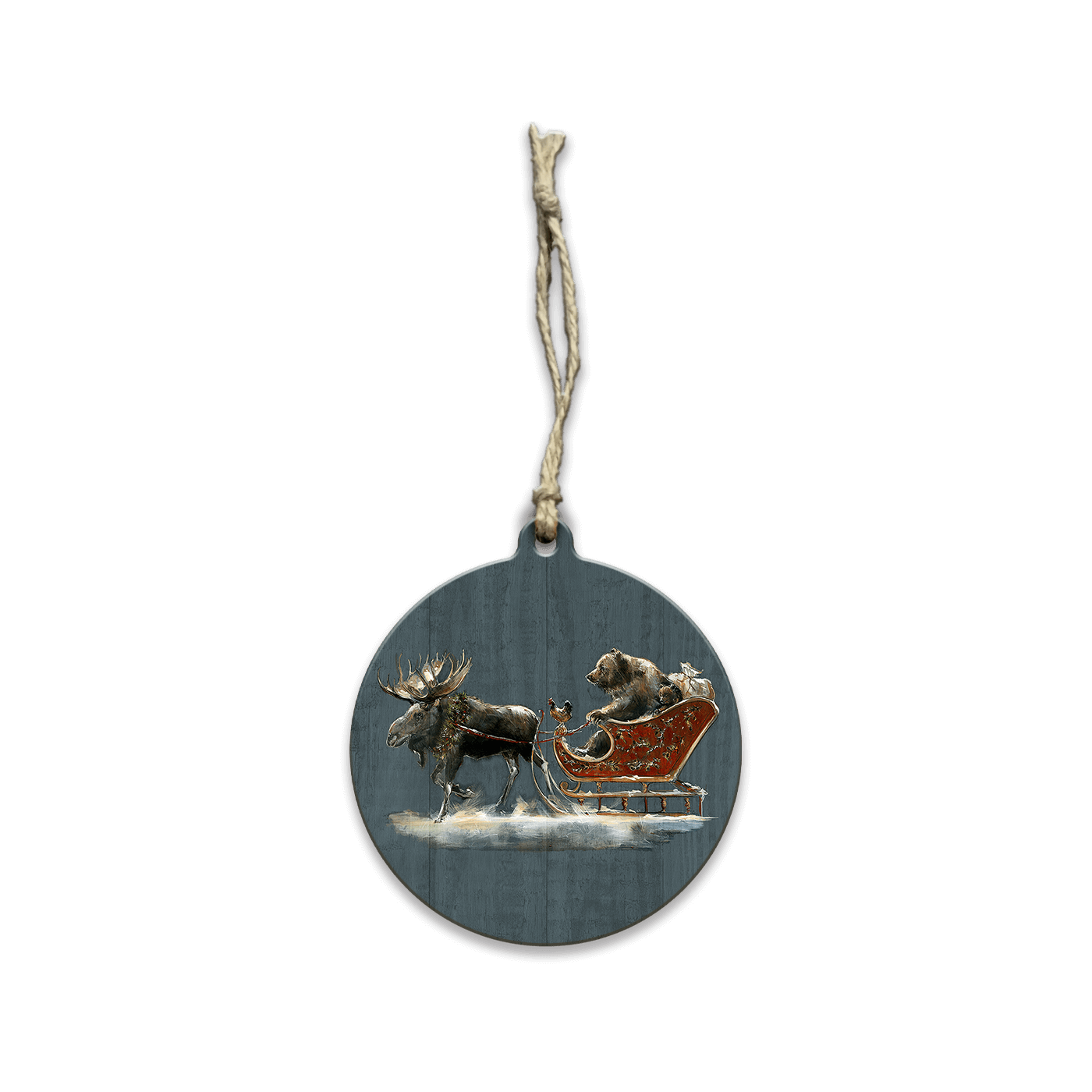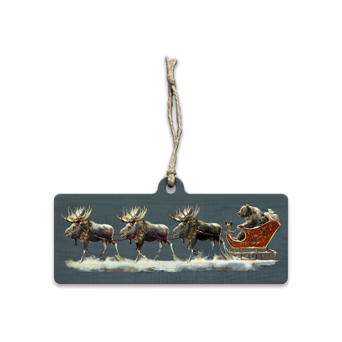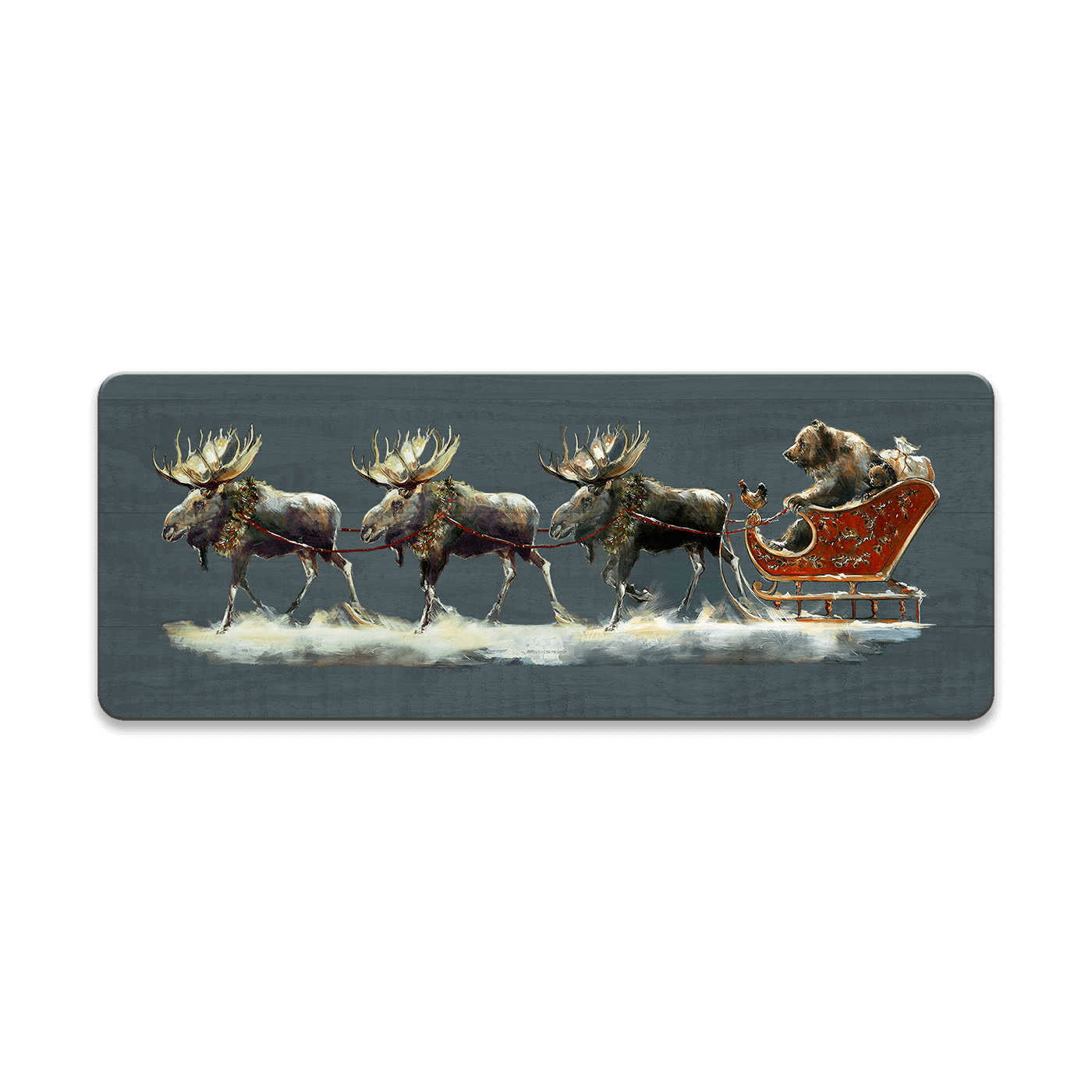 Embark on a festive journey with this whimsical Christmas artwork, perfect for infusing your space with the spirit of the holidays! This unique piece showcases a trio of majestic moose, adorned with holiday flair, pulling a vintage sleigh driven by a jolly ol' grizzly bear, creating a playful take on the classic sleigh and reindeer imagery. This artwork is an ideal choice for anyone looking to elevate their holiday home with a touch of enchantment and a dash of woodland charm.
