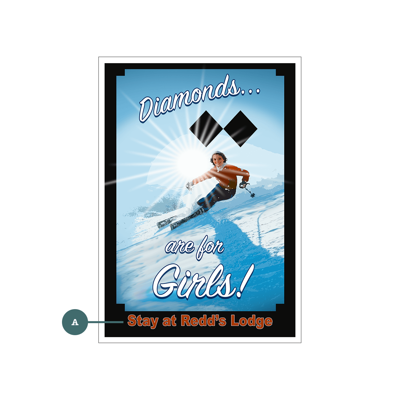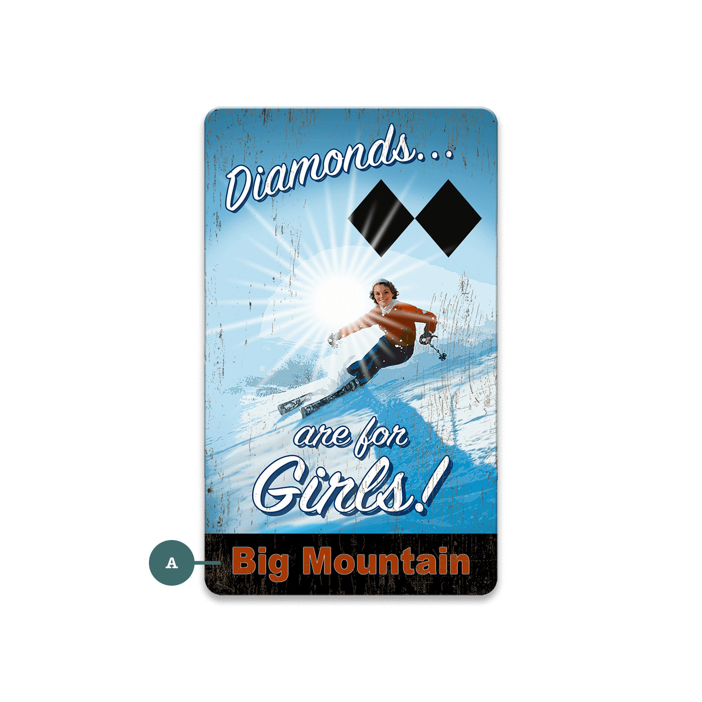 This playful ski-themed artwork celebrates women who love tackling challenging slopes. Featuring a vintage-style skier navigating a steep run with double black diamond symbols, it exudes a fun, empowering vibe. The rustic, weathered look adds charm, making it a great addition to any ski lodge, cabin, or winter sports-themed space. Personalization options allow for custom text, adding a unique touch to this spirited piece.