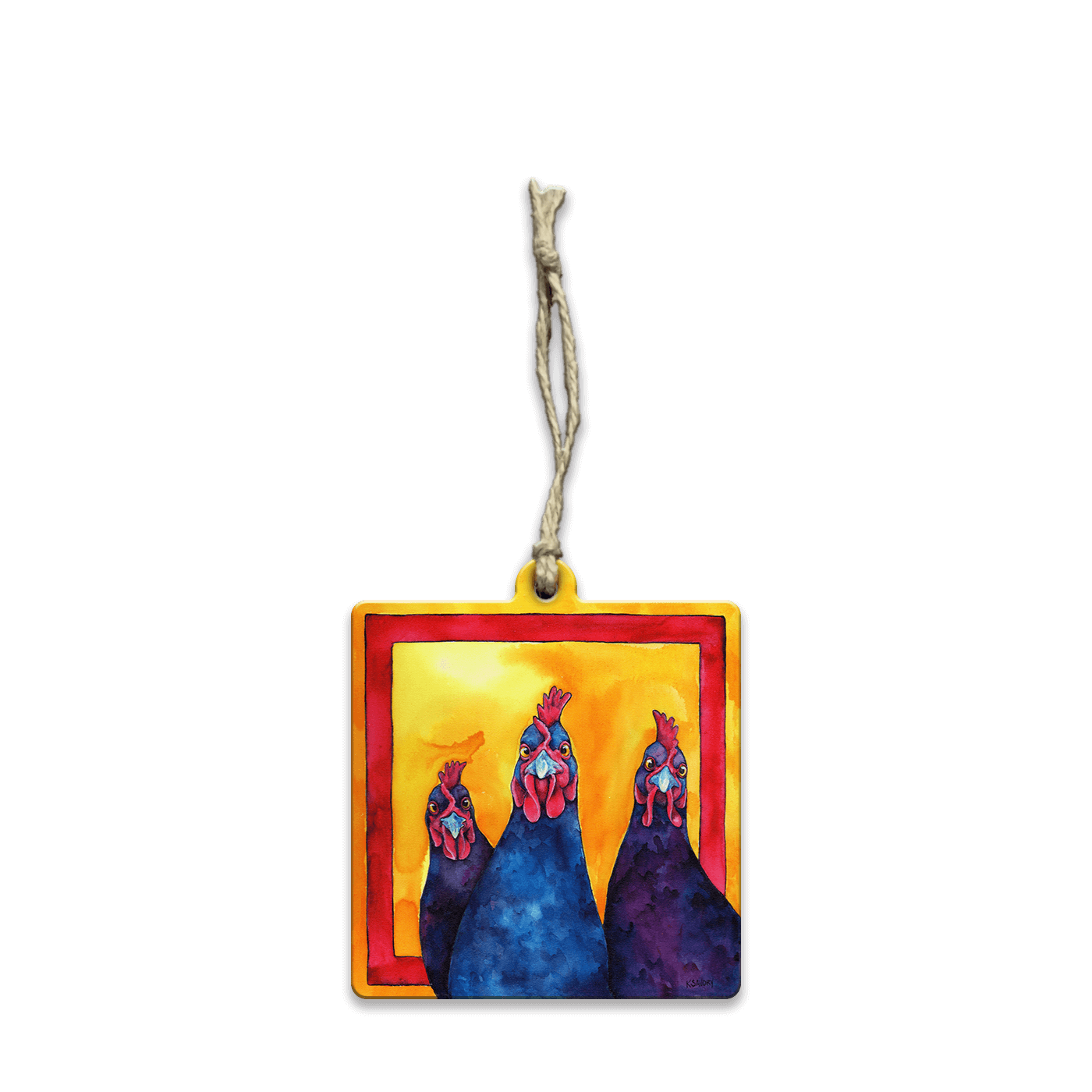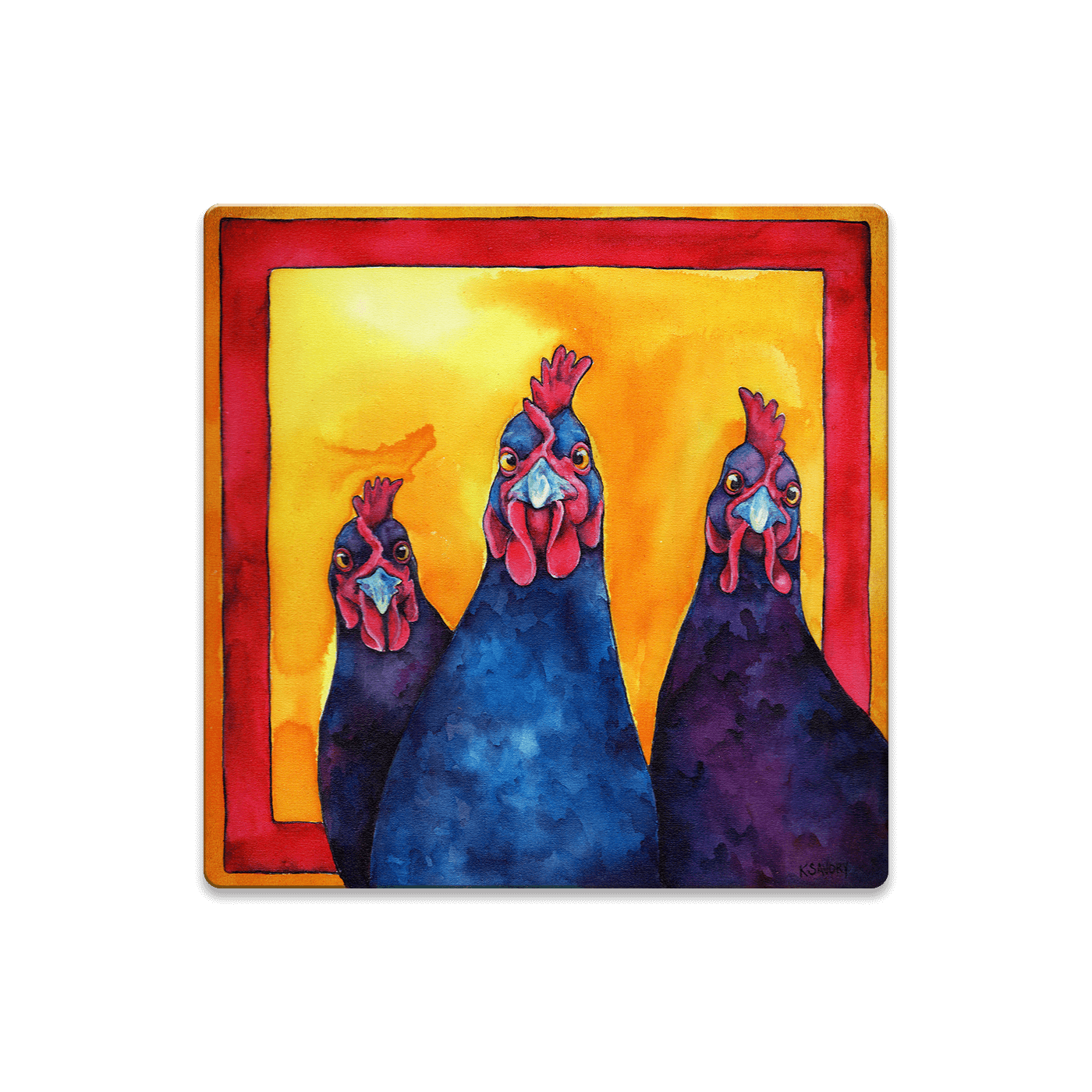 This vibrant and expressive artwork features three hens set against a brilliant yellow background, capturing their unique personalities and quirky charm. The rich, deep blues and purples of the hens contrast beautifully with the vivid backdrop, highlighting their detailed features and comical expressions. This piece is perfect for adding a playful and colorful touch to any room, particularly kitchens or dining areas. It celebrates the often overlooked beauty and character of farm animals, making it a delightful addition for both art collectors and those who appreciate a touch of humor and whimsy in their decor.