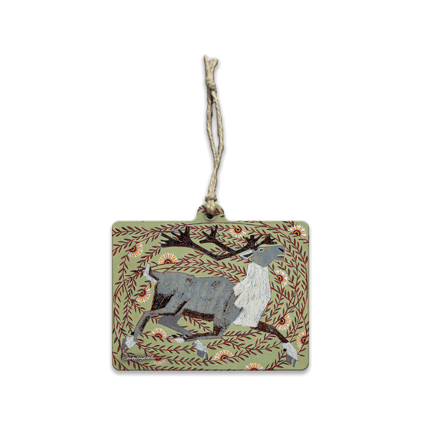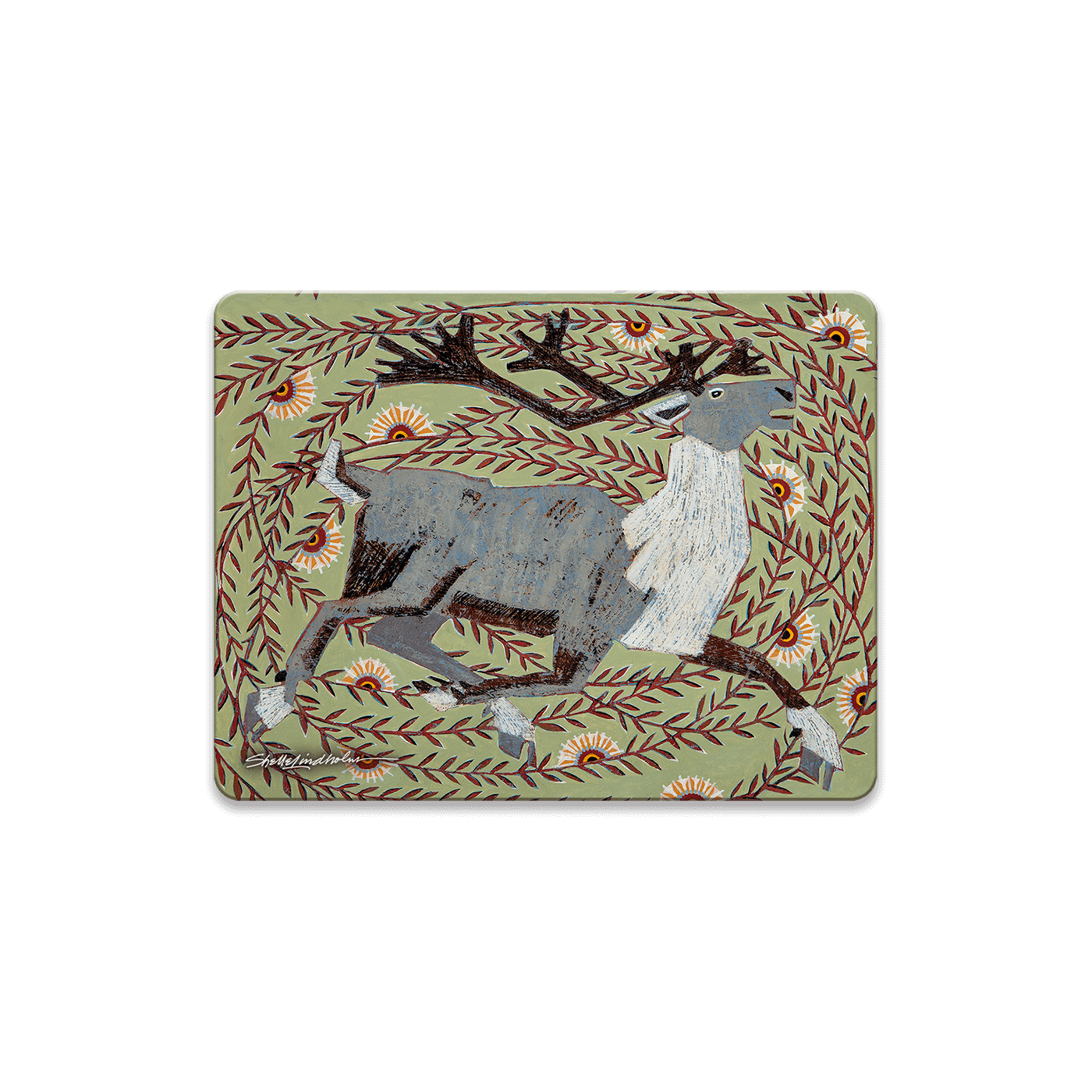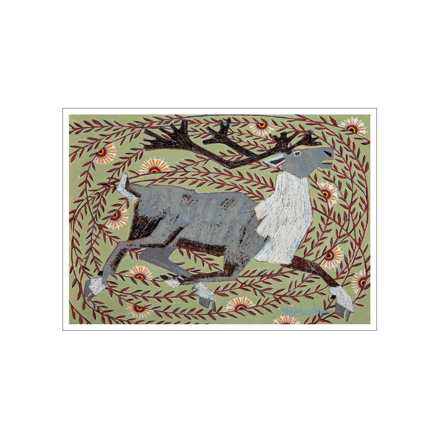 This vibrant artwork showcases a majestic caribou surrounded by a lively pattern of foliage and flowers. The piece's dynamic movement and intricate detailing capture the energy and beauty of the natural world. With its earthy tones and whimsical design, this caribou artwork is perfect for nature lovers and those who appreciate wildlife-themed décor. Whether displayed in a home or office, this artwork adds a touch of the wild outdoors and serves as a unique, eye-catching piece for any space.