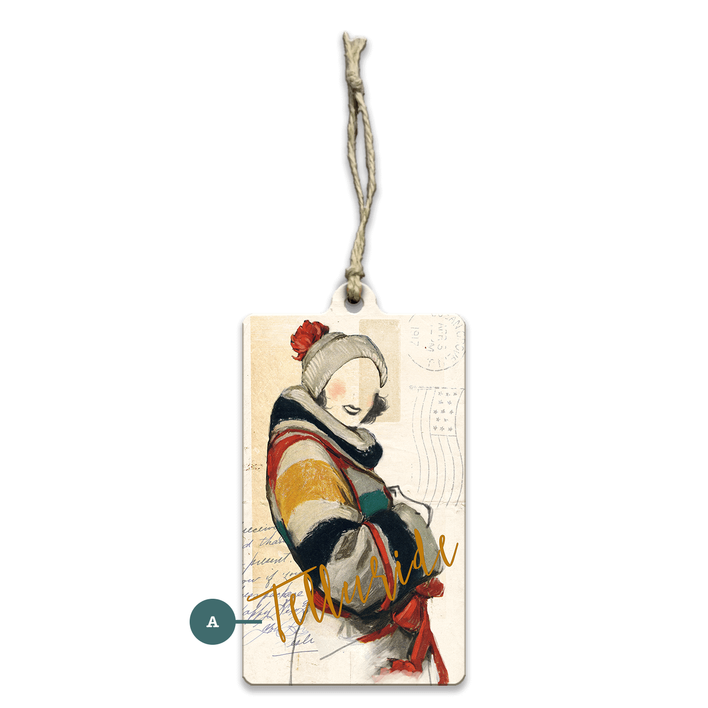 Wrapped in a cozy, oversized striped coat and matching pom-pom beanie, this stylized skier radiates après-ski confidence and vintage charm. The softly textured background features handwritten script, faded stamps, and postal markings that give the piece a nostalgic, well-traveled feel. With her rosy cheeks, relaxed stance, and warm layers in bold retro tones, she’s ready for a mountain town stroll or fireside unwind. A tribute to winter warmth, effortless style, and timeless alpine fashion.