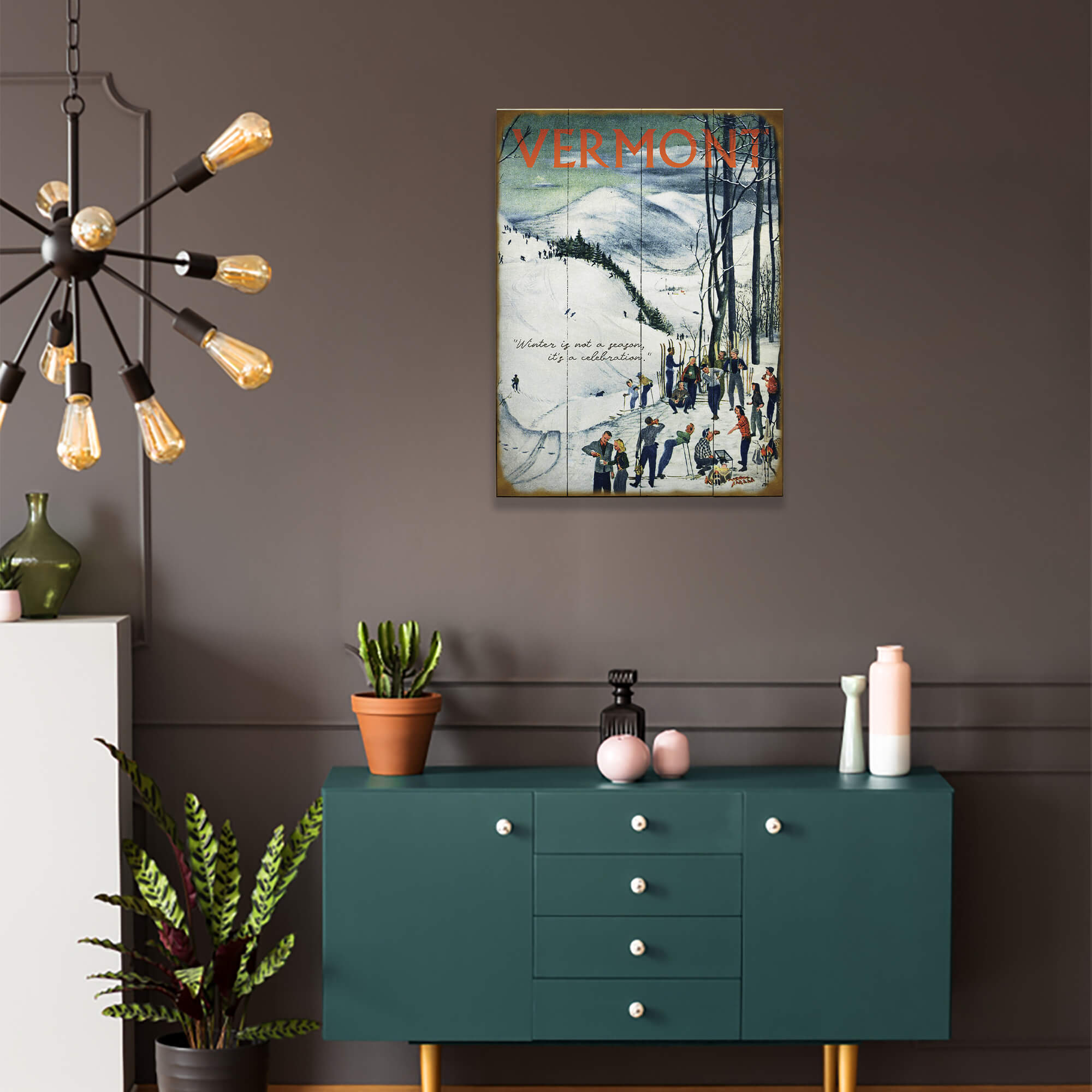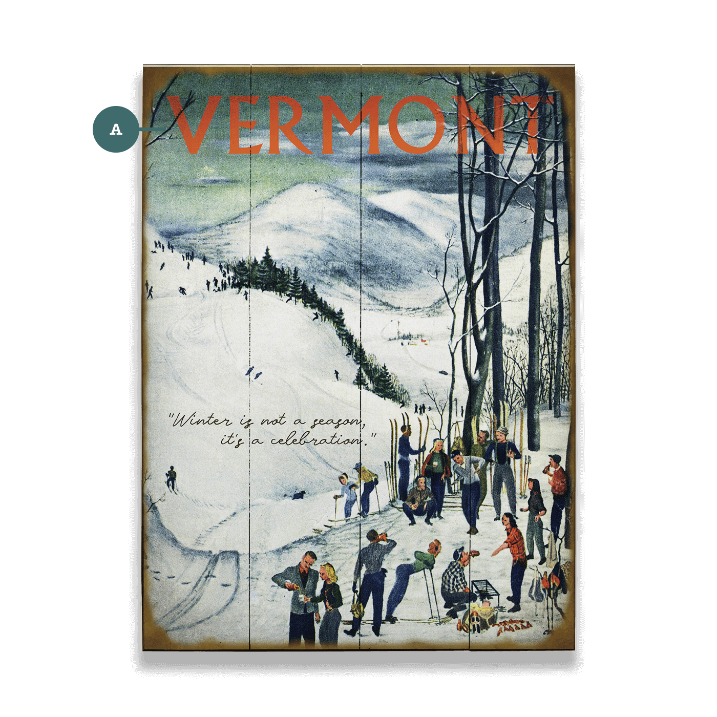 A flurry of skiers gather around a fire, celebrating a classic day in the mountains with hot drinks, food, and lively conversation, while ski trails wind through snow-draped hills in the distance. This festive winter scene captures the joyful spirit of alpine recreation with vintage charm—where fresh powder and old friends come together for one perfect snowy afternoon. A timeless nod to the camaraderie, crisp air, and snowy adventure that define winter at its best.