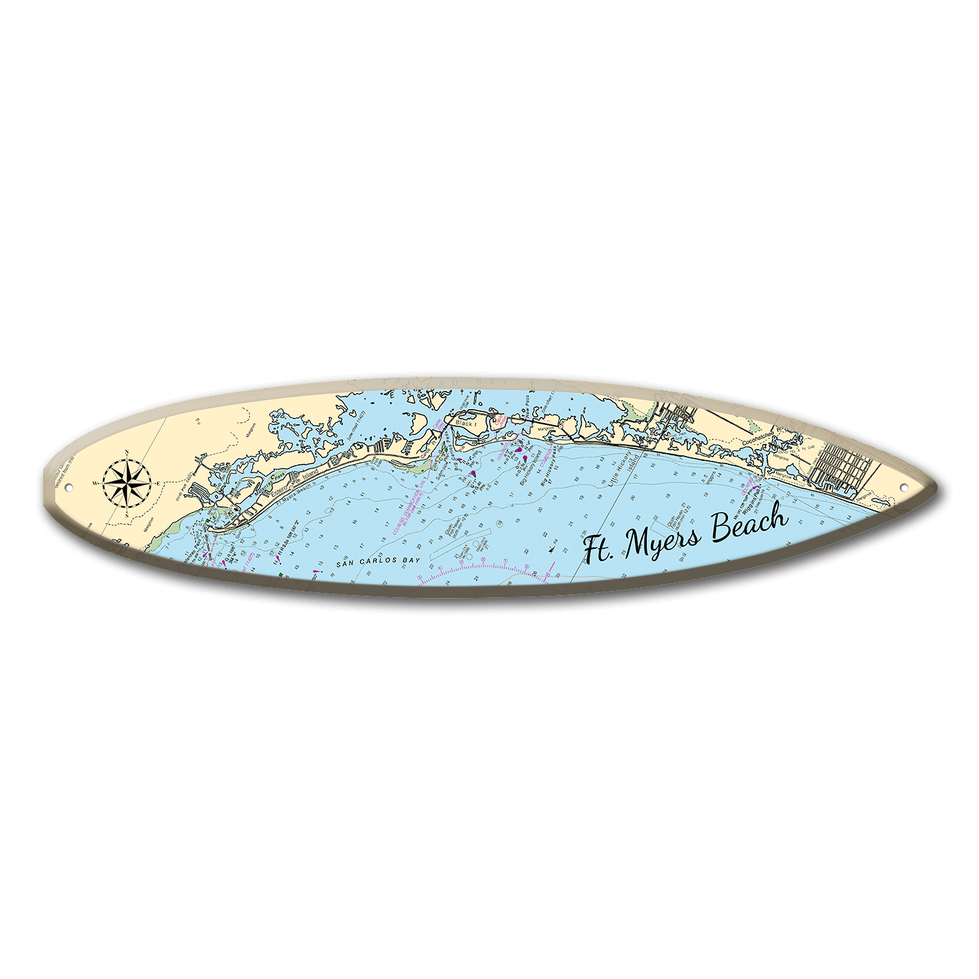 This artwork features a nautical chart of Fort Myers Beach, Florida, presented in a sleek surfboard-shaped design that highlights the island’s coastal setting along San Carlos Bay and the Gulf. The chart details the waterways, channels, and surrounding shoreline, complemented by a decorative compass rose that adds to its maritime appeal. Known for its sugar-white sand beaches, boating culture, and lively waterfront, Fort Myers Beach is a favorite destination for anglers, sailors, and beachgoers alike. Perfect for coastal-themed decor, this piece combines nautical precision with a modern surfboard silhouette, creating a unique way to celebrate life on the water.