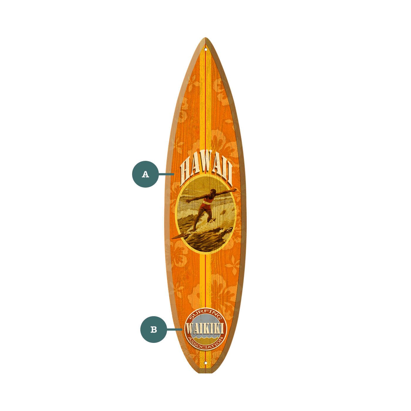 Relive the golden days of surfing with this Vintage Hawaii Surfboard Wall Décor. Featuring a hibiscus-patterned woodgrain background and a retro surfer riding the waves, this piece pays tribute to Waikiki’s rich surfing heritage. The elongated surfboard design makes it stand out, while the warm tones blend beautifully with both modern and rustic interiors.