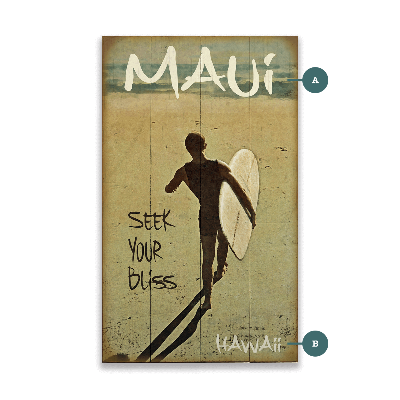 Immerse yourself in the tranquil vibes of Maui with this serene wall art featuring a surfer silhouette against a vintage beach backdrop. Titled "Seek Your Bliss," this piece embodies the spirit of Hawaiian surf culture, encouraging viewers to pursue their passions and find their own bliss. The rustic, weathered look and evocative silhouette combine to create a captivating visual that speaks to both the adventurer and the dreamer. Perfect for any room that needs a touch of inspiration and a reminder of the peaceful shores of Hawaii.