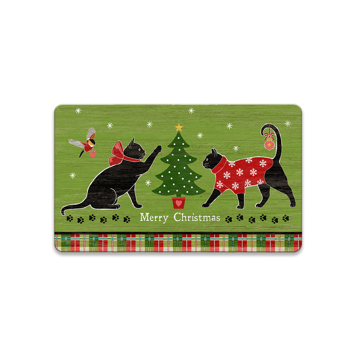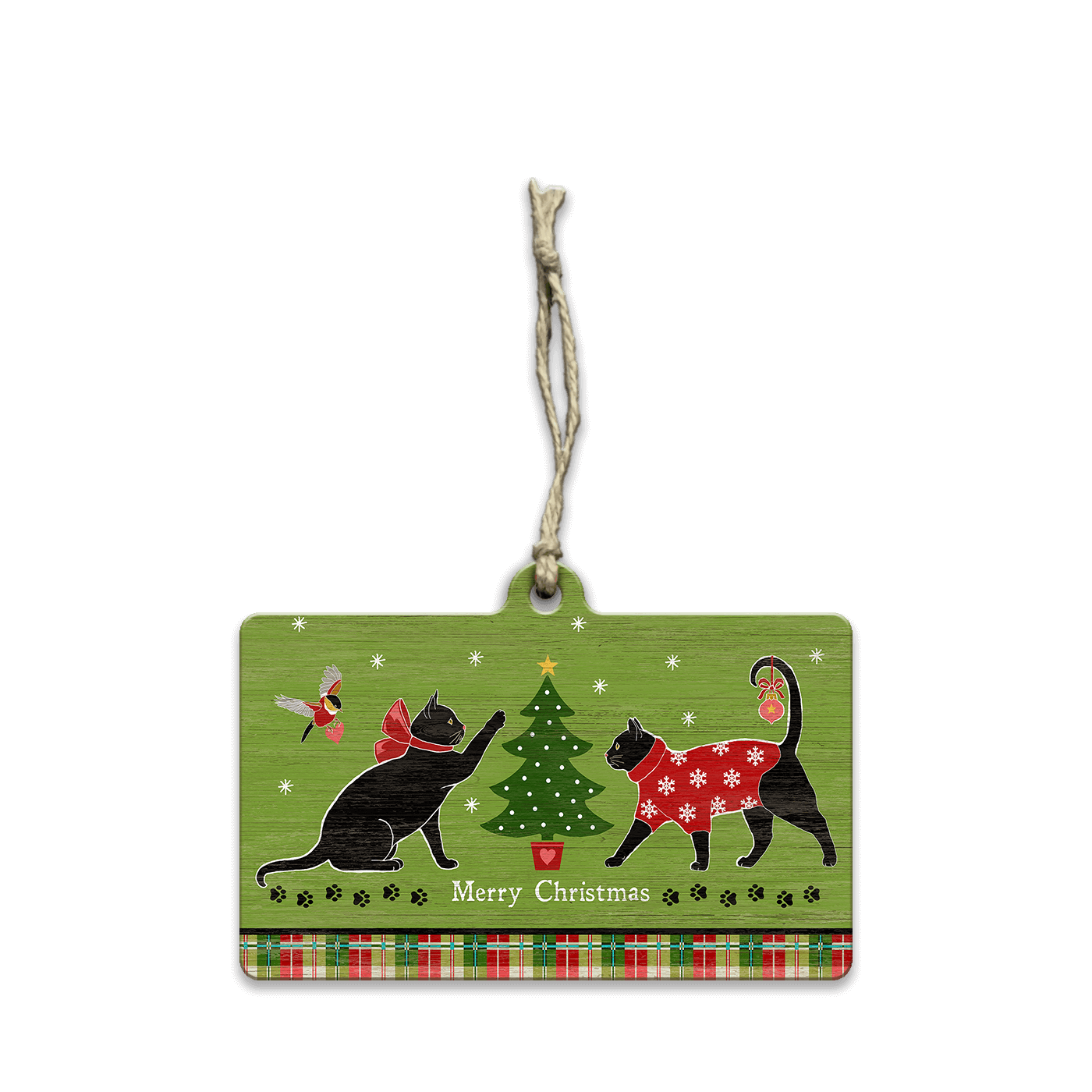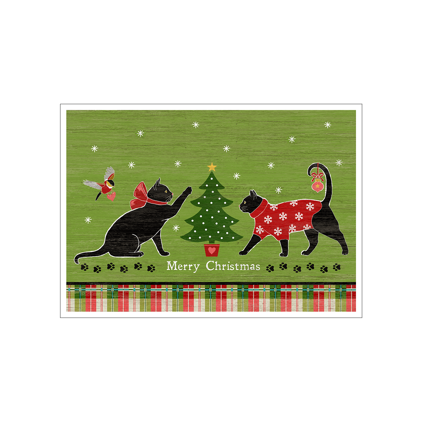 This festive holiday artwork showcases two playful cats dressed in adorable winter outfits, surrounded by a decorated Christmas tree and a cheerful bird. Set against a vibrant green background with plaid accents and the message "Merry Christmas," this piece brings a whimsical touch to your seasonal decor. Perfect for cat lovers and those who enjoy adding fun, lighthearted elements to their holiday decorations, this artwork is ideal for creating a cozy and joyful atmosphere during the Christmas season.