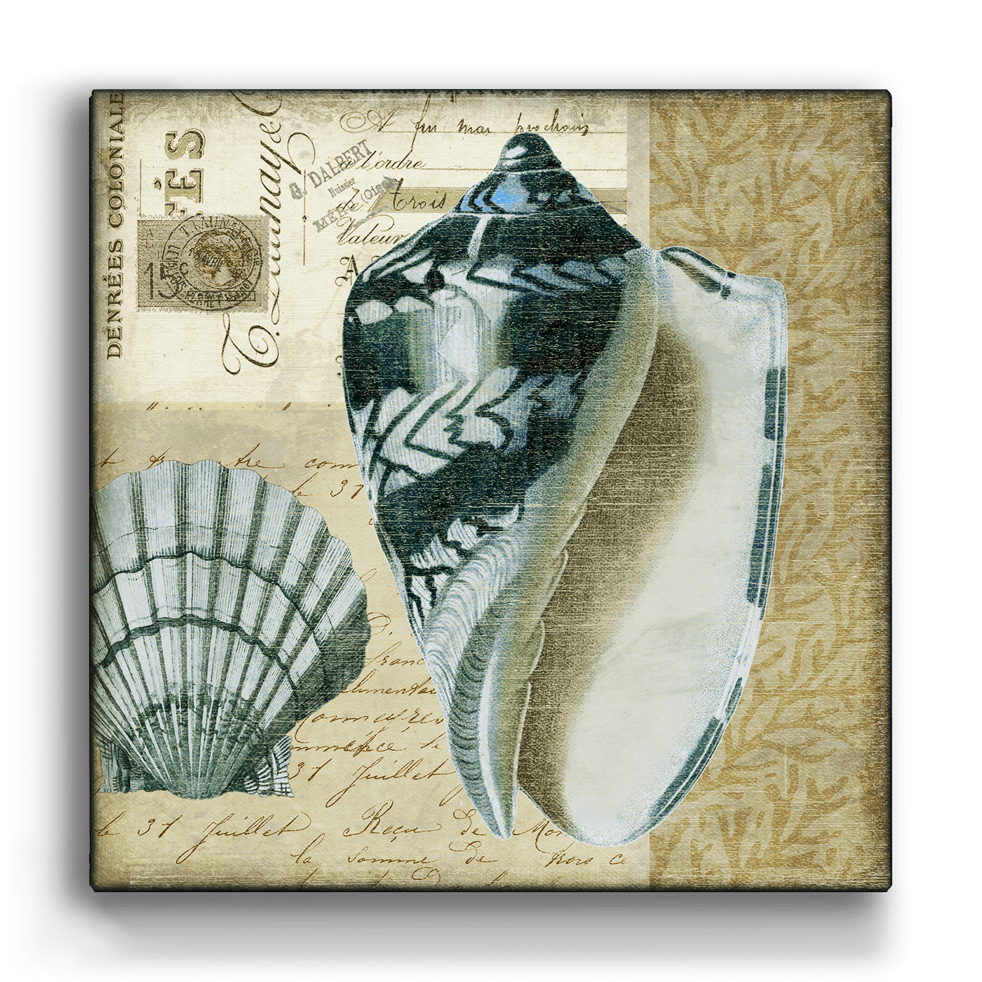 Delve into the serene beauty of the ocean with our 'Indigo Shells: Scallop and Olive' artwork, featuring an exquisitely detailed Scallop and an Olive shell. Perfect for bringing a touch of the sea’s tranquility to your living space, this piece combines the elegance of marine life with a vintage-inspired backdrop. Ideal for coastal decor enthusiasts or as a thoughtful gift for sea lovers, this artwork adds a peaceful, yet intriguing element to any room.
