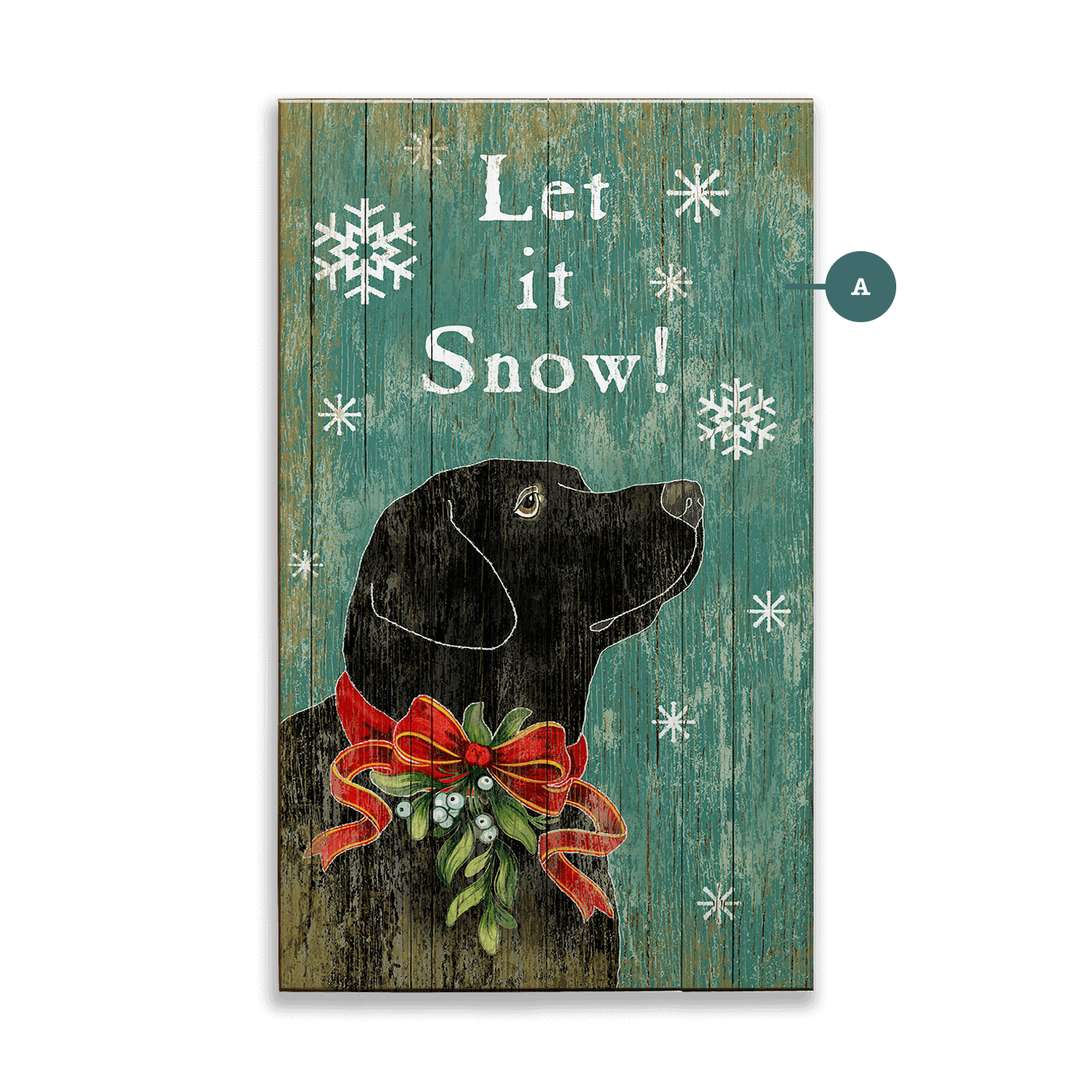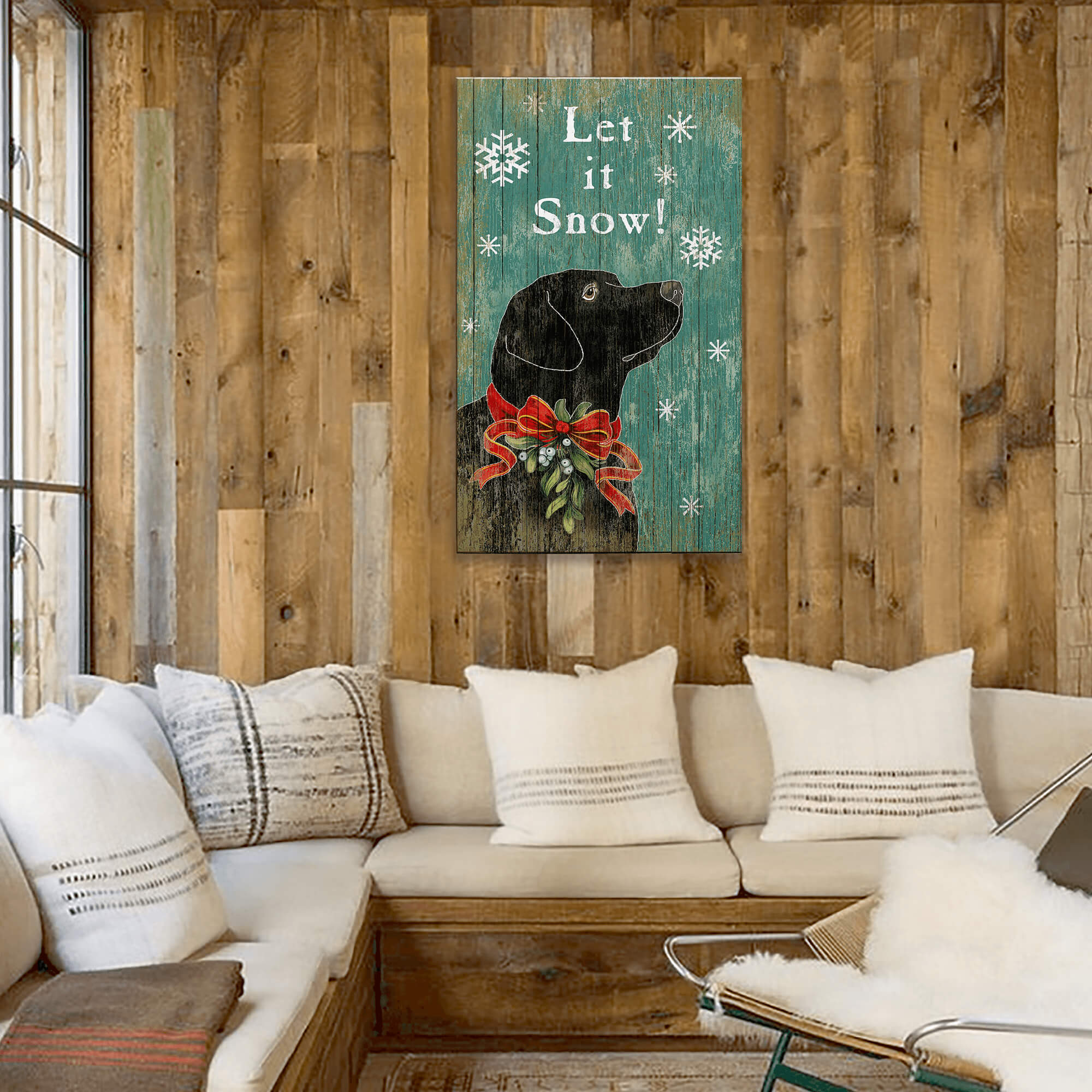 This festive holiday artwork features an adorable black dog adorned with a holiday bow and mistletoe, surrounded by falling snowflakes and the joyful message, "Let it Snow!" The rustic, textured background and charming design make this piece a perfect addition to your seasonal decor. With its heartwarming appeal, this artwork brings a touch of whimsy and warmth to any space, making it ideal for dog lovers and those looking to add a playful, wintery feel to their home during the holidays.