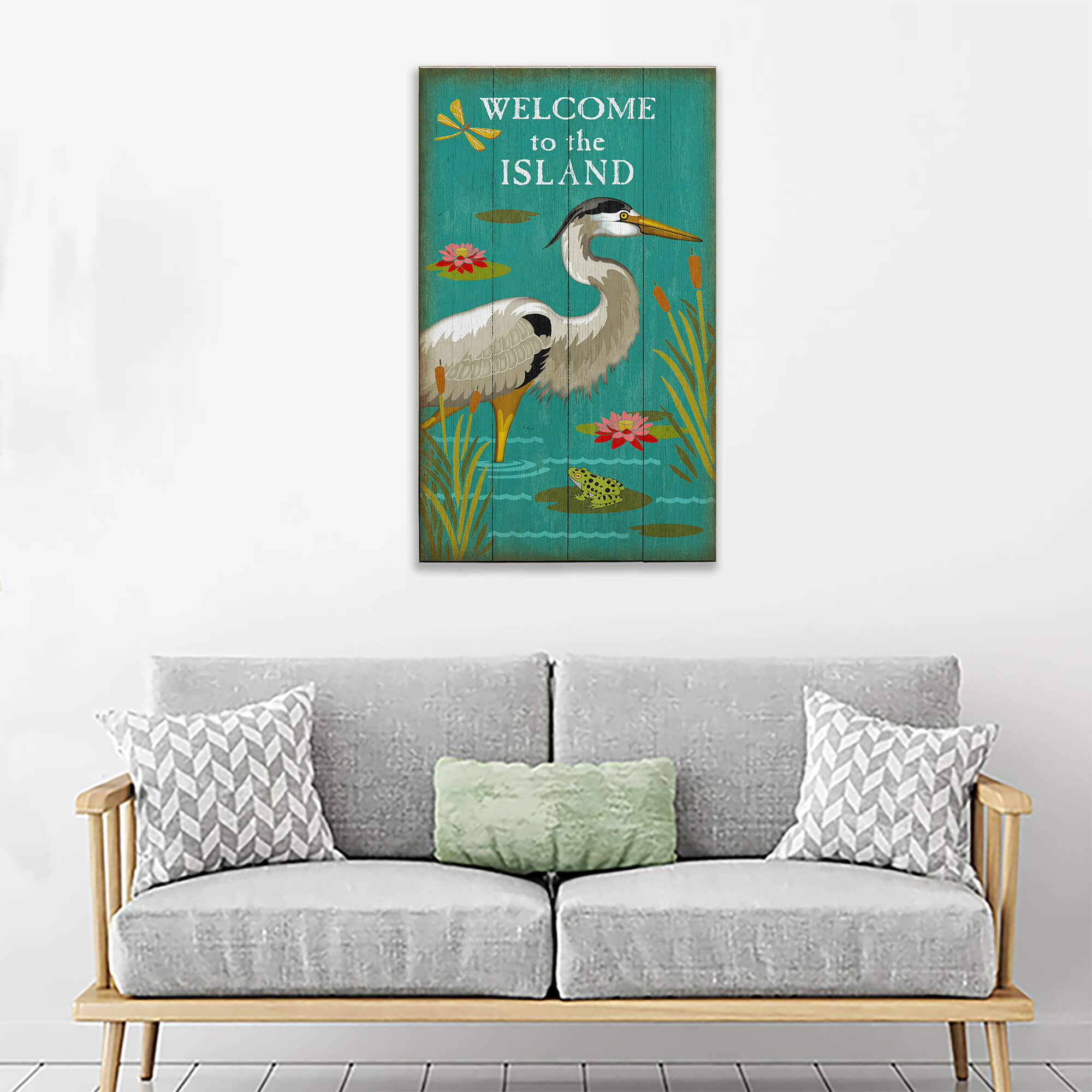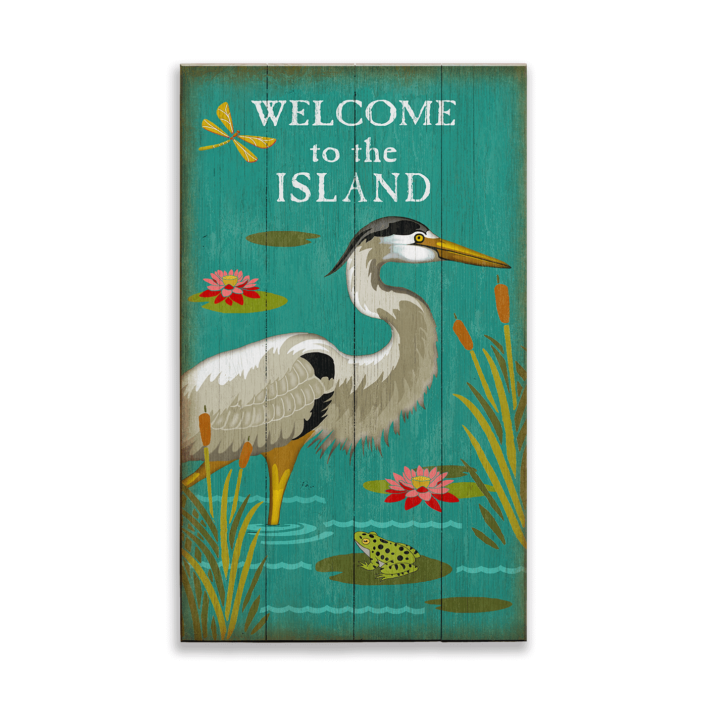 This vibrant wall art features a serene scene with a heron surrounded by water lilies, cattails, and a friendly frog, all set against a rustic teal background. The bold "Welcome to the Island" message adds a charming and inviting touch, making this piece perfect for entryways, patios, or any space in need of a tropical or nature-inspired accent. This artwork combines durability with a playful, welcoming design, ideal for adding a touch of island life to your home décor.