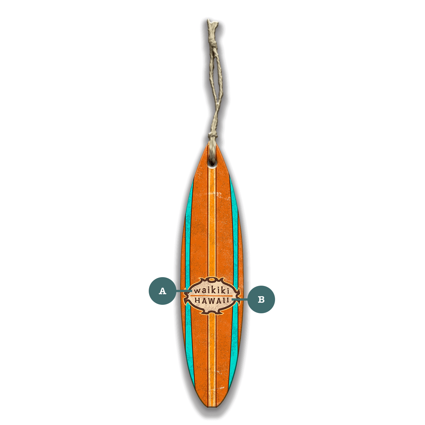 Bring timeless surf culture into your space with this Waikiki Hawaii Surfboard Wall Sign. With its bold turquoise and orange striping, distressed wood finish, and vintage lettering, this piece feels like it came straight from the shores of Oahu. It’s a versatile surfboard wall décor accent that pairs well with tropical, rustic, or coastal themes.