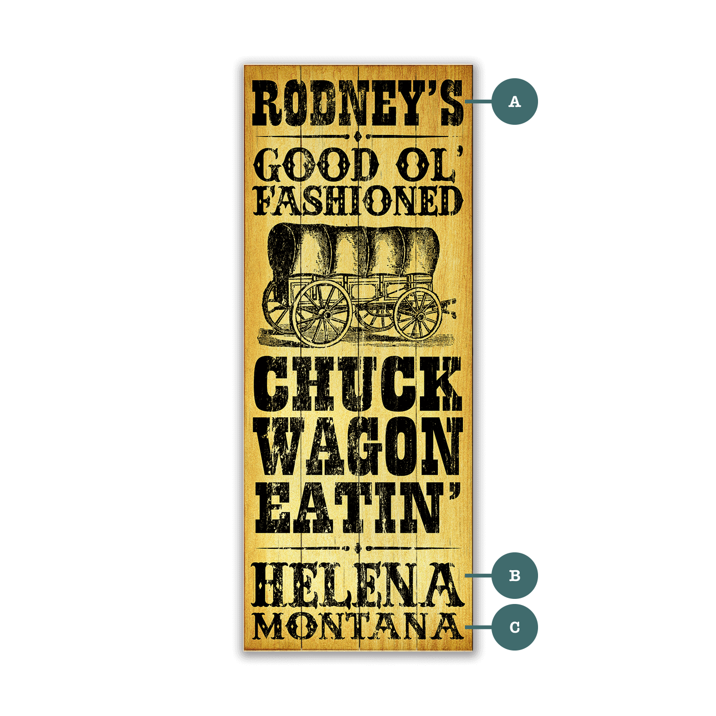 This rustic sign celebrates the nostalgia of old-fashioned chuck wagon dining, evoking the era when hearty meals were cooked over open fires on the frontier. Featuring a detailed illustration of a classic covered wagon, the design captures the spirit of the West and the communal experience of cowboy cookouts. With bold, distressed lettering and a warm, aged finish, this piece is perfect for anyone who appreciates the tradition of rugged, home-cooked meals and the camaraderie of the open range.
