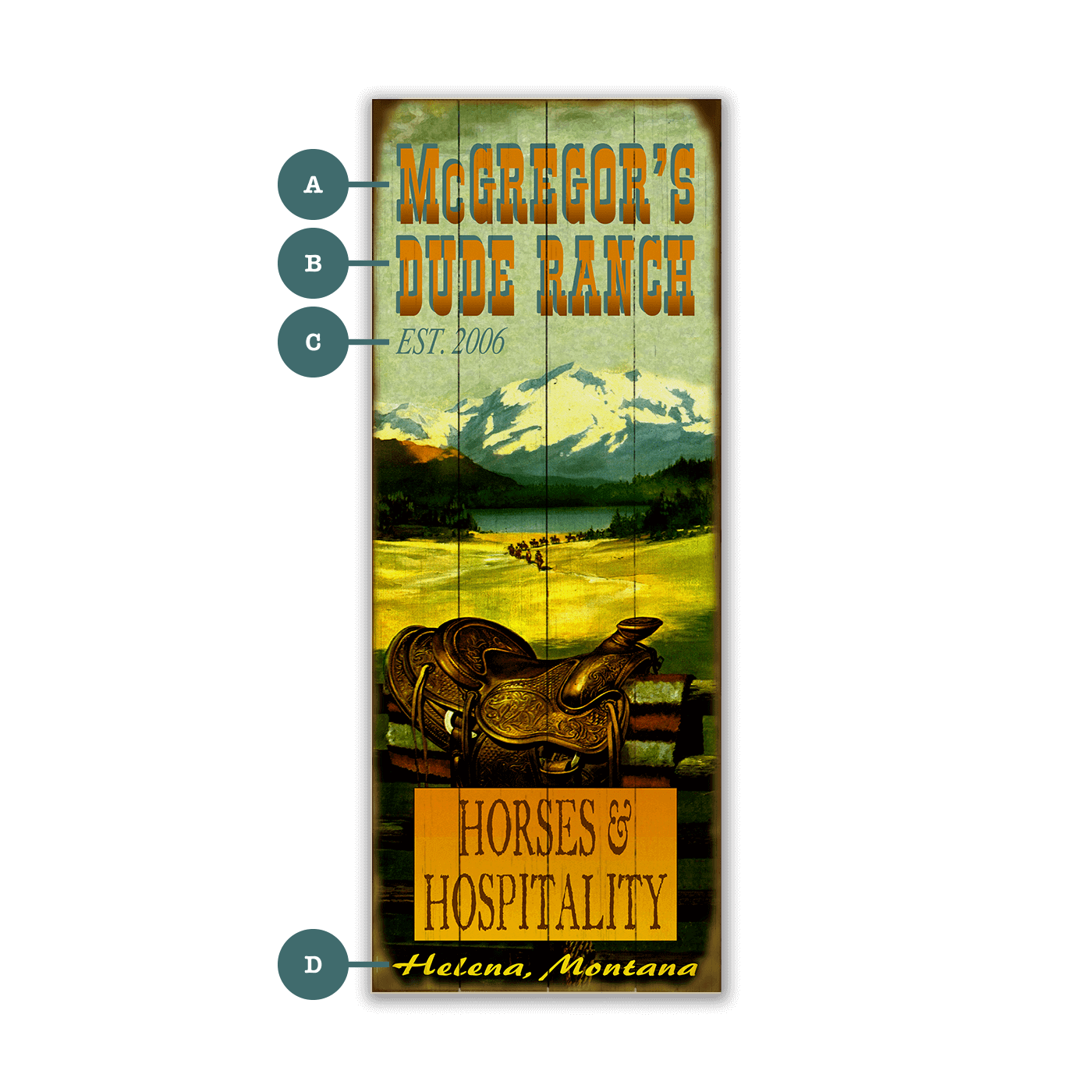 This vintage-inspired artwork captures the essence of a classic dude ranch experience, blending rustic charm with the beauty of the great outdoors. Featuring an intricately tooled saddle resting on a wooden fence, the scene opens up to a distant trail ride winding through vast open fields and majestic snow-capped mountains. The warm, earthy tones and distressed finish evoke a nostalgic, timeworn appeal, highlighting the traditions of western hospitality and horsemanship. Ideal for ranch enthusiasts, equestrian lovers, or those who appreciate western heritage, this piece brings a touch of the frontier spirit to any space.