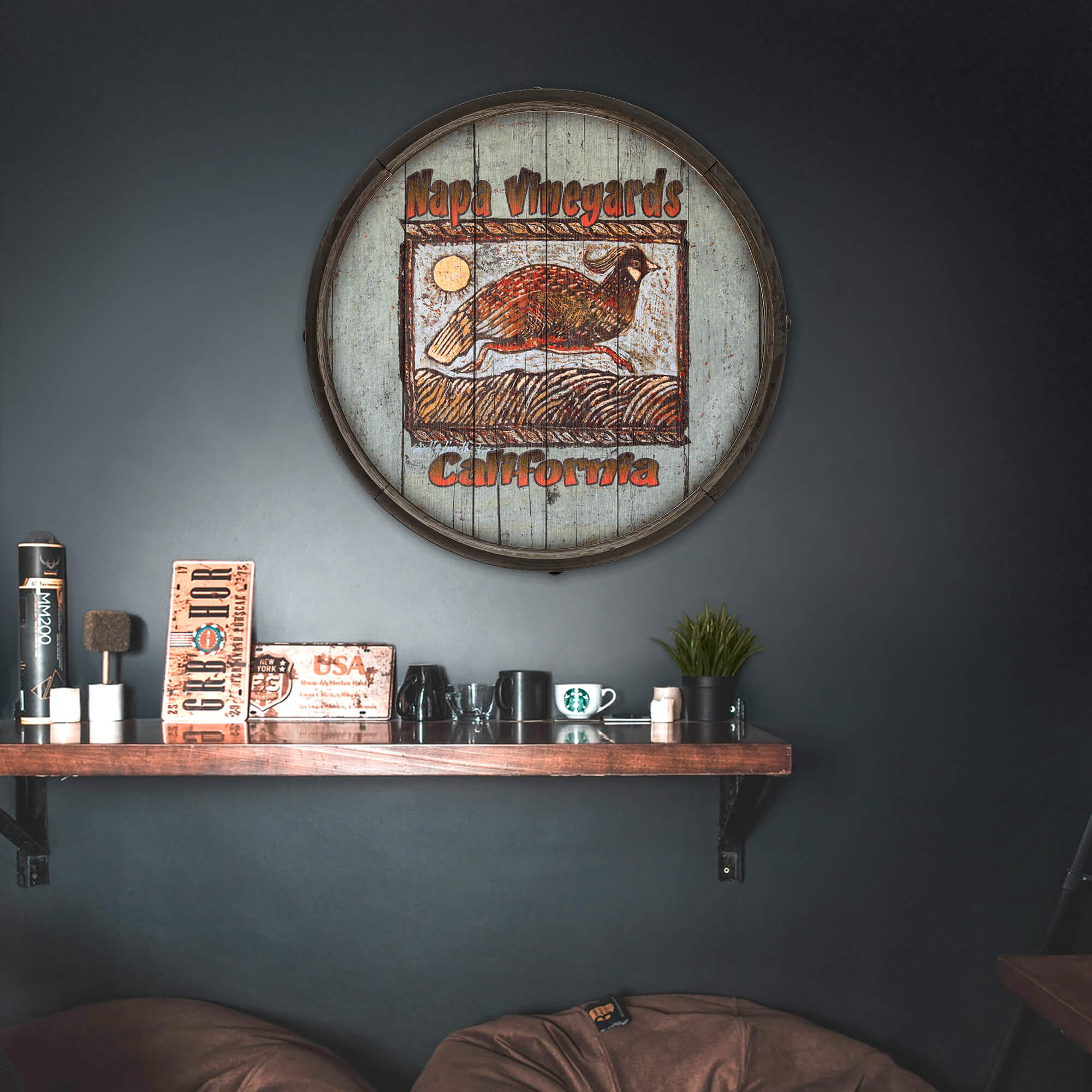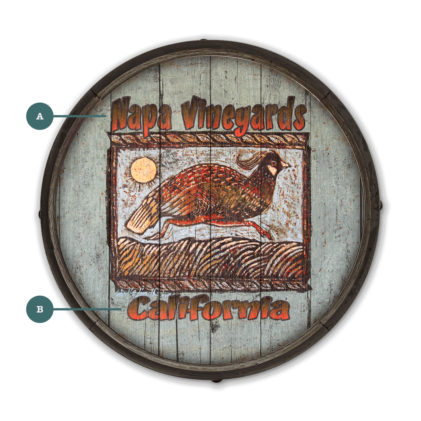 This vibrant barrel end wall art captures the rustic charm of vineyard life with a striking illustration of a quail running amidst a sunlit landscape. The piece features bold, hand-text and a rich color palette that evokes the warmth and beauty of nature. The weathered wood background adds a touch of vintage appeal, making it a perfect addition to any space that celebrates the rustic elegance of winemaking.