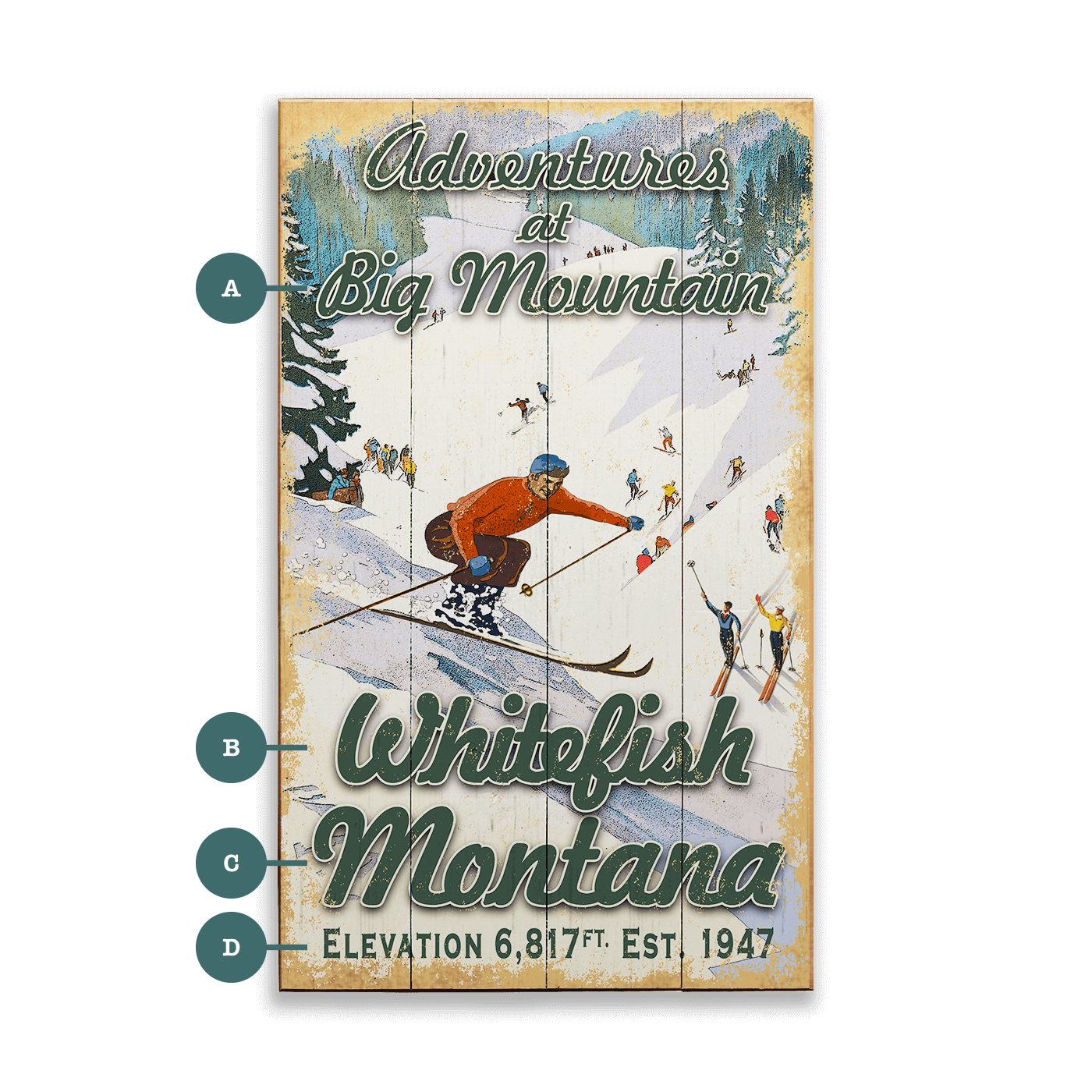 Enjoy complimentary personalization for this piece, meticulously handcrafted by our graphic design team. Specify your desired text for points A, B, C, and D. To ensure perfection in your custom piece, please verify your text carefully. Missing personalization information will revert to our default design as shown. To remove all text from a field, type "Remove" in that field.