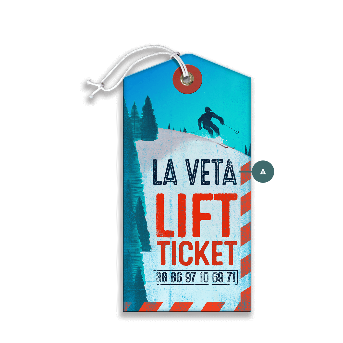 Step onto the slopes with this inviting lift ticket design, showcasing a vibrant blue and red color palette paired with bold typography and striking striped accents. The silhouette of a skier carving down a snowy slope adds an adventurous touch, while the forested backdrop enhances the alpine charm. Perfect for winter enthusiasts, this artwork beautifully combines retro aesthetics with the thrill of the slopes.