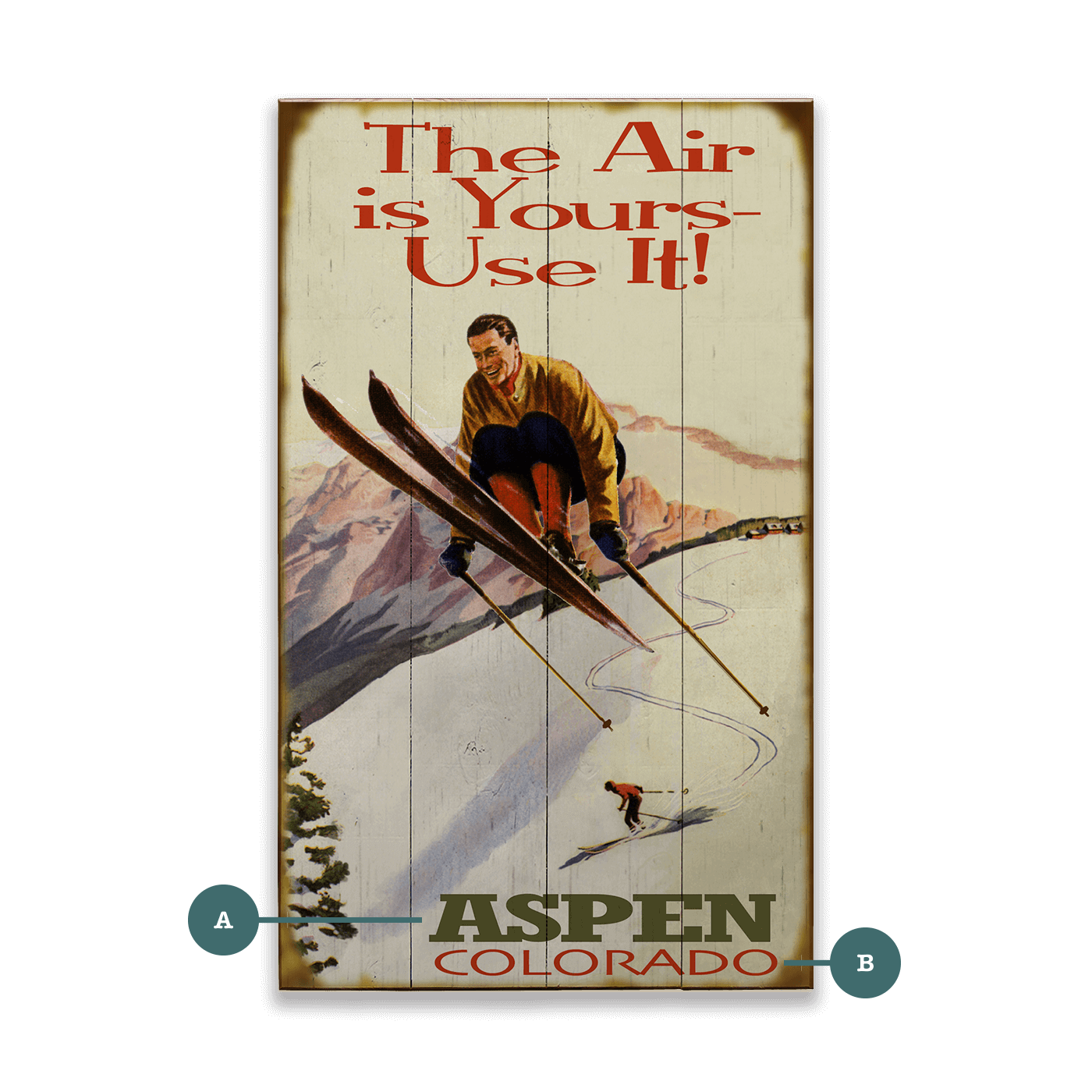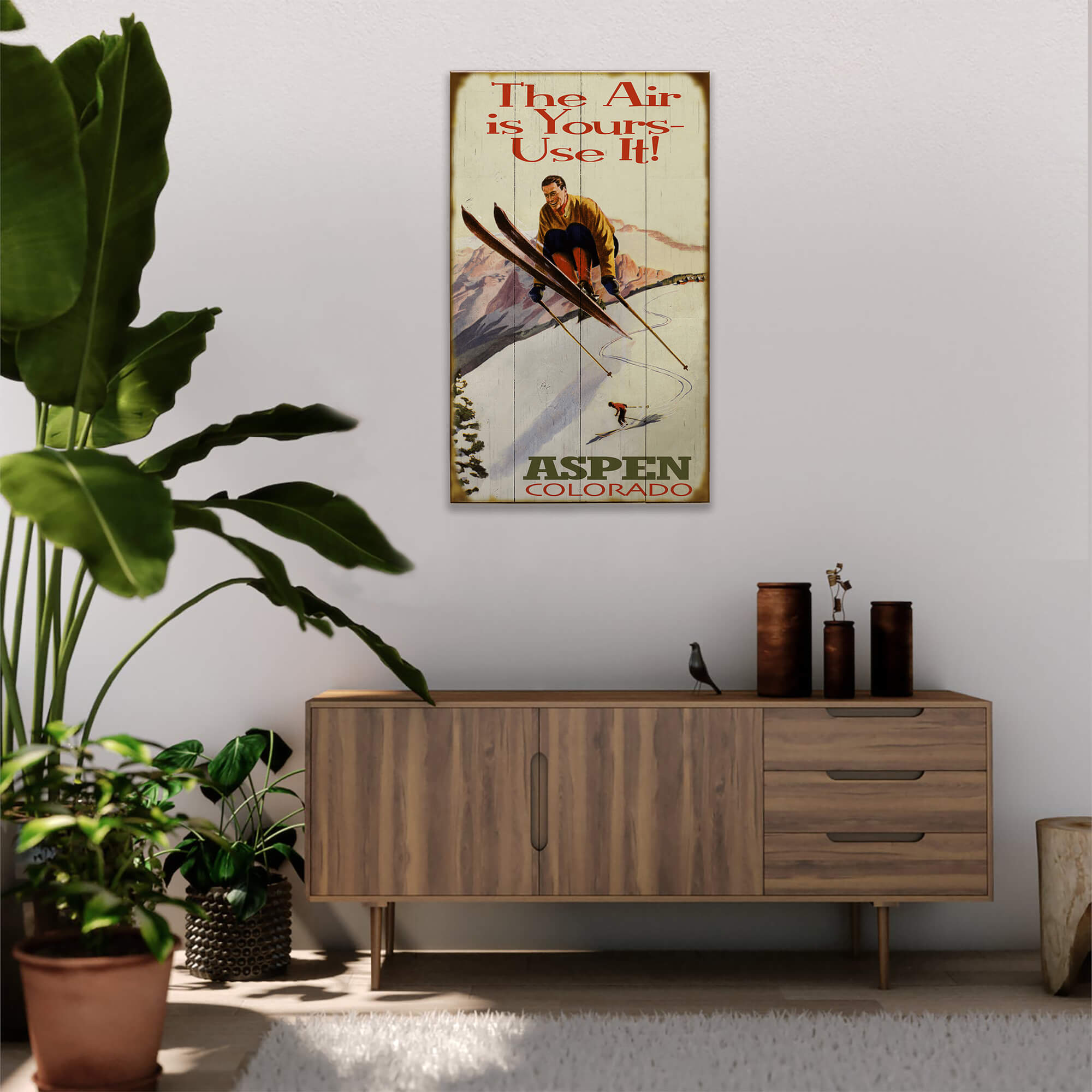 Capture the thrill of high-flying adventure with this vintage skiing artwork. Featuring a dynamic skier soaring through the air, this piece brings the excitement and freedom of winter sports to life. The retro design and bold slogan make it perfect for adding a touch of nostalgia and energy to any room or lodge décor.