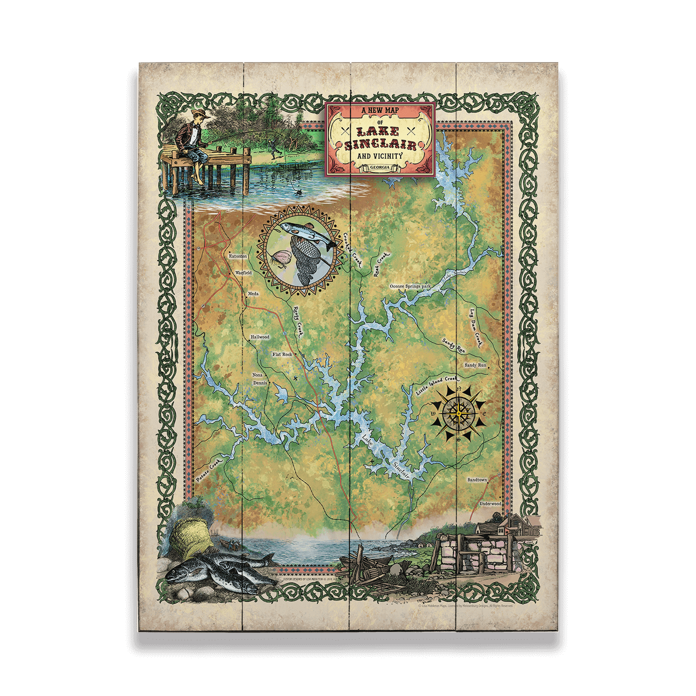 Explore the enchanting charm of Lake Sinclair, Georgia, through this detailed artistic map. This piece beautifully combines geographic precision with whimsical illustrations of local leisure activities. The map is adorned with an intricate compass rose and vibrant scenes that capture the essence of lake life. Perfect for decorating a lakeside cabin, home, or office, this map is a tribute to the serene beauty of Lake Sinclair and a must-have for lovers of the great outdoors and Georgia's natural landscapes.
