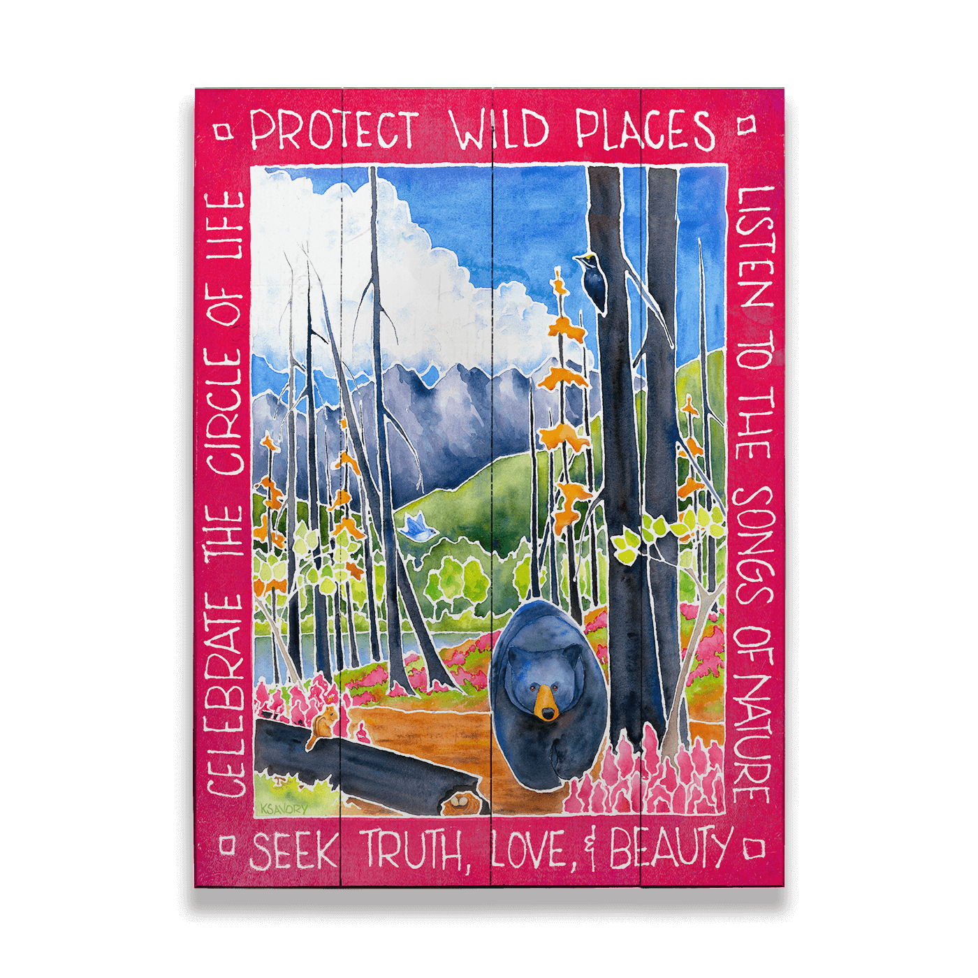 This captivating artwork portrays nature's remarkable ability to heal, showcasing a forest regrowing after a forest fire. Amidst charred tree trunks, vibrant new growth emerges, symbolizing hope and renewal. A serene black bear stands quietly among the rejuvenating landscape, framed by phrases that remind us to appreciate and care for our world. Perfect for conservation enthusiasts and those who appreciate the cycles of nature, this piece brings a message of resilience, beauty, and the importance of protecting our wild spaces.