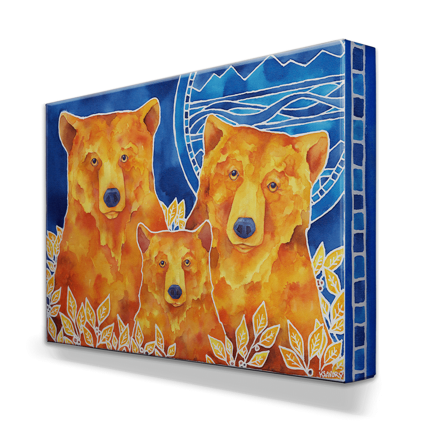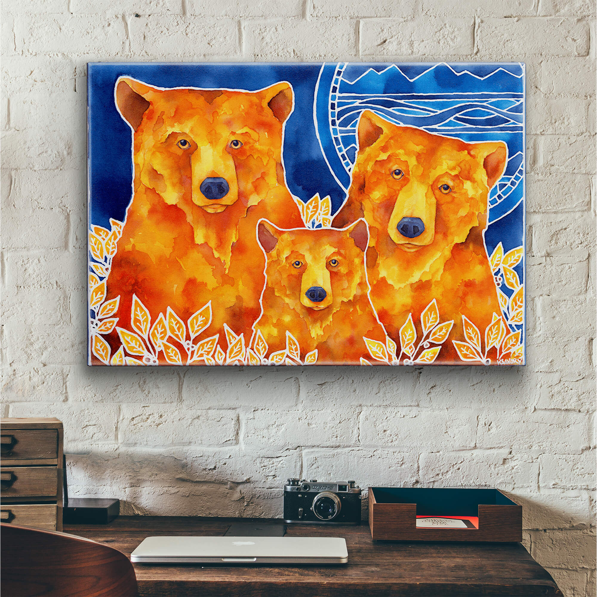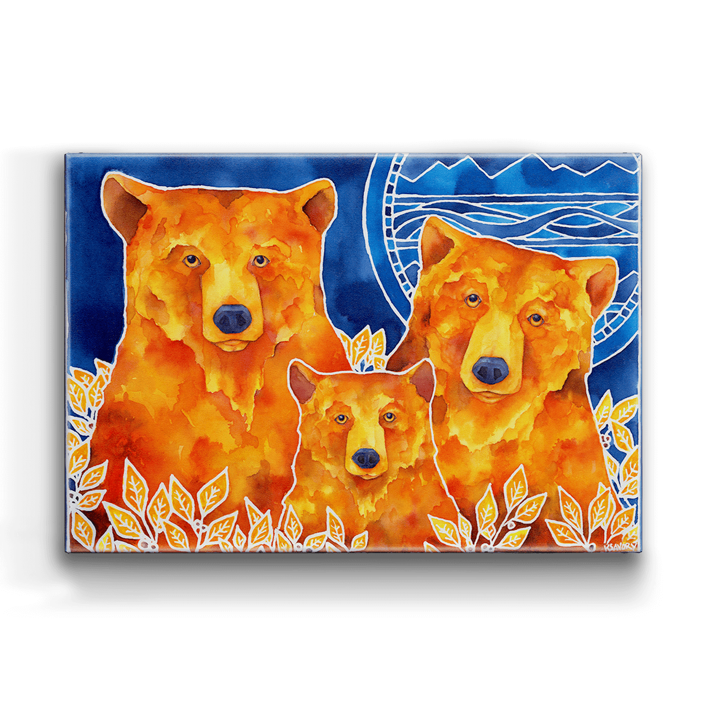 This vibrant artwork showcases a majestic family of bears, set against a bold blue backdrop adorned with intricate patterns and natural elements. The warm orange and golden tones of the bears create a striking contrast, symbolizing strength, unity, and the beauty of family bonds. Surrounded by delicate leaves and framed in a detailed border, this piece is perfect for nature lovers and art enthusiasts who appreciate wildlife-inspired decor.
