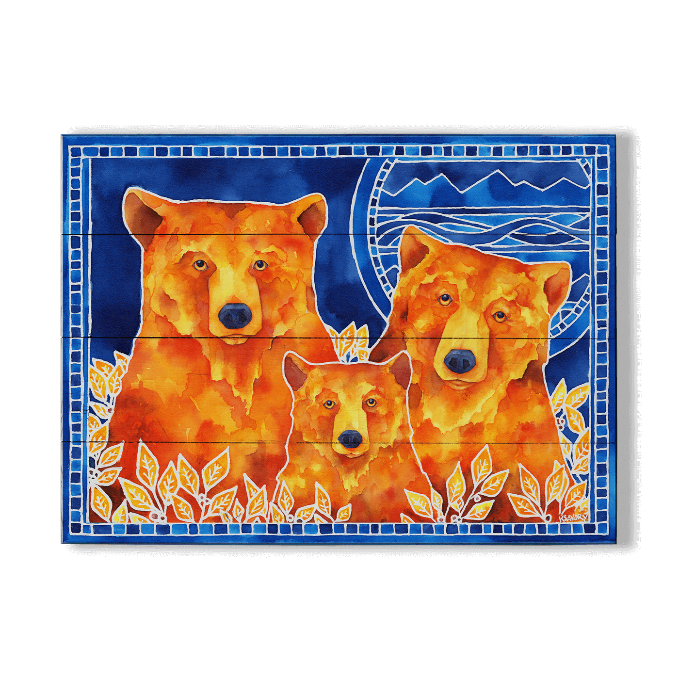 This vibrant artwork showcases a majestic family of bears, set against a bold blue backdrop adorned with intricate patterns and natural elements. The warm orange and golden tones of the bears create a striking contrast, symbolizing strength, unity, and the beauty of family bonds. Surrounded by delicate leaves and framed in a detailed border, this piece is perfect for nature lovers and art enthusiasts who appreciate wildlife-inspired decor.