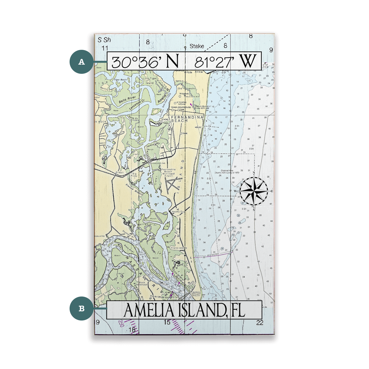 This nautical chart artwork of Amelia Island, Florida, captures the charm of one of Florida’s northernmost barrier islands, featuring the scenic coastline, marshlands, and historic Fernandina Beach. The surrounding waters are rich with maritime history, from pirate lore to Civil War forts, and today serve as a playground for boating, kayaking, and coastal relaxation. With customizable coordinates and title, this piece offers a personalized way to celebrate the island’s unique blend of natural beauty and coastal heritage.