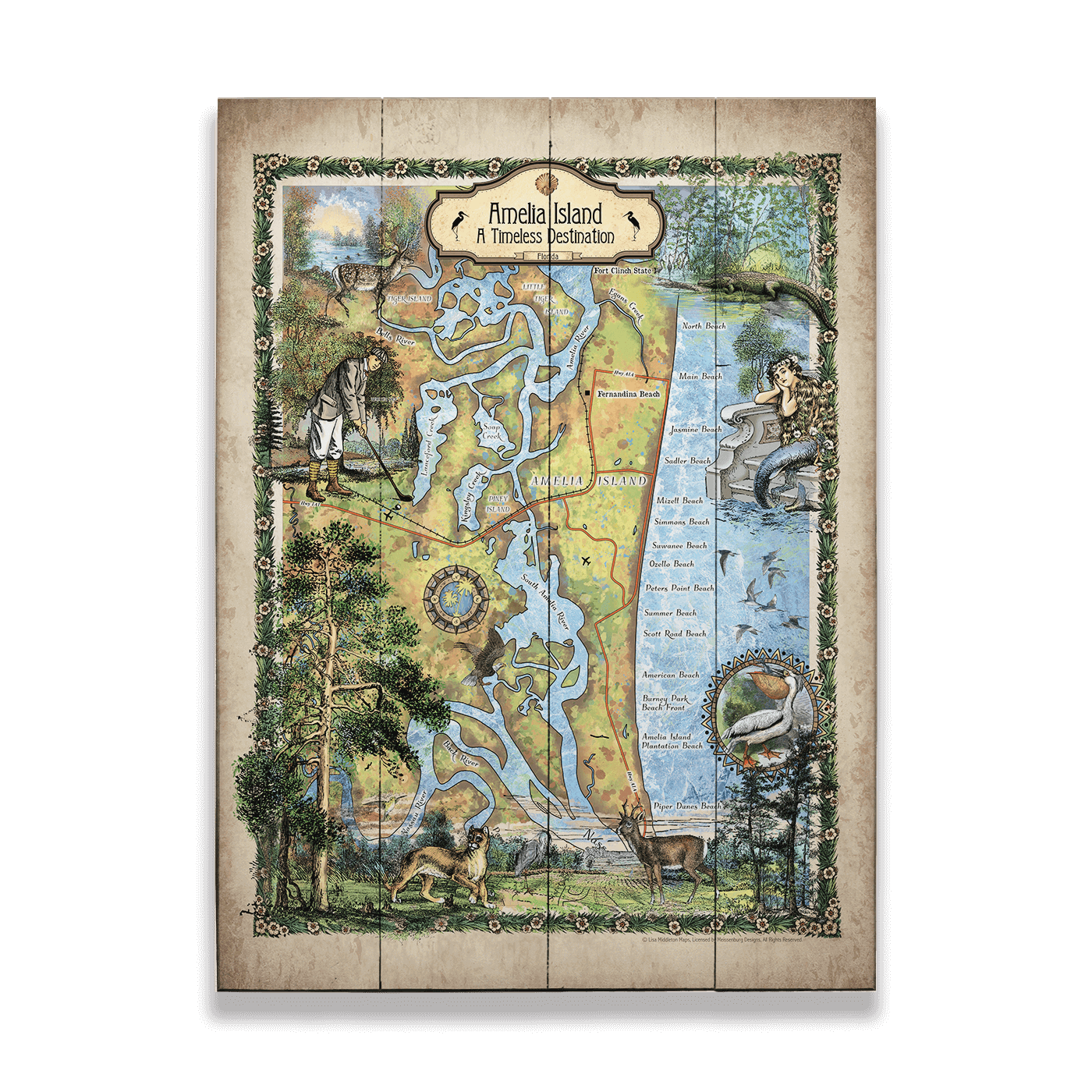 Amelia Island, Florida: Illustrated Map - Wood & Metal Wall Art