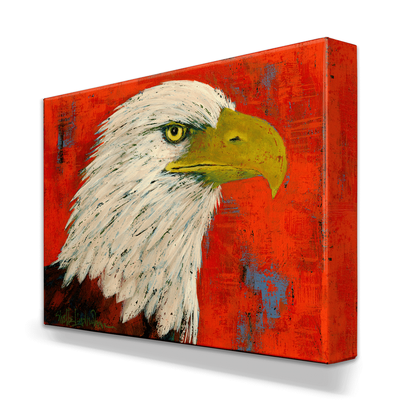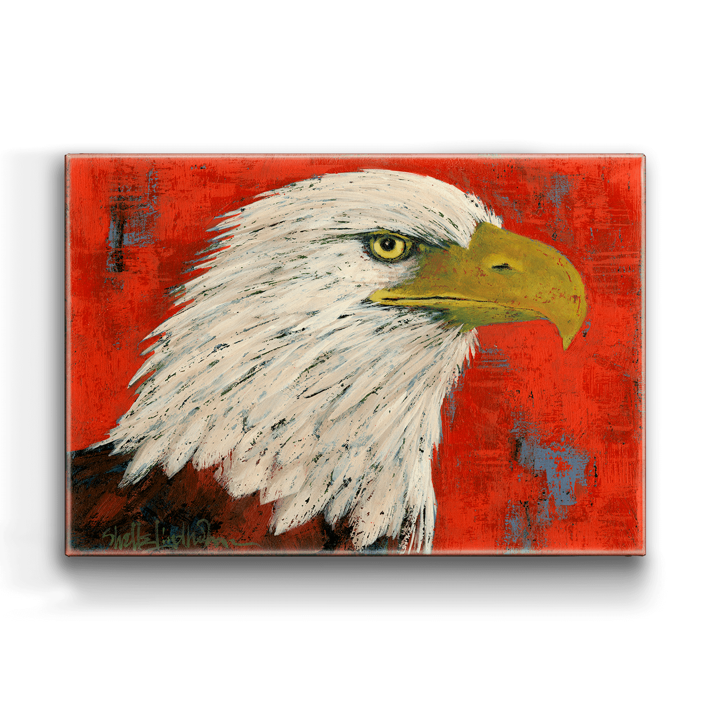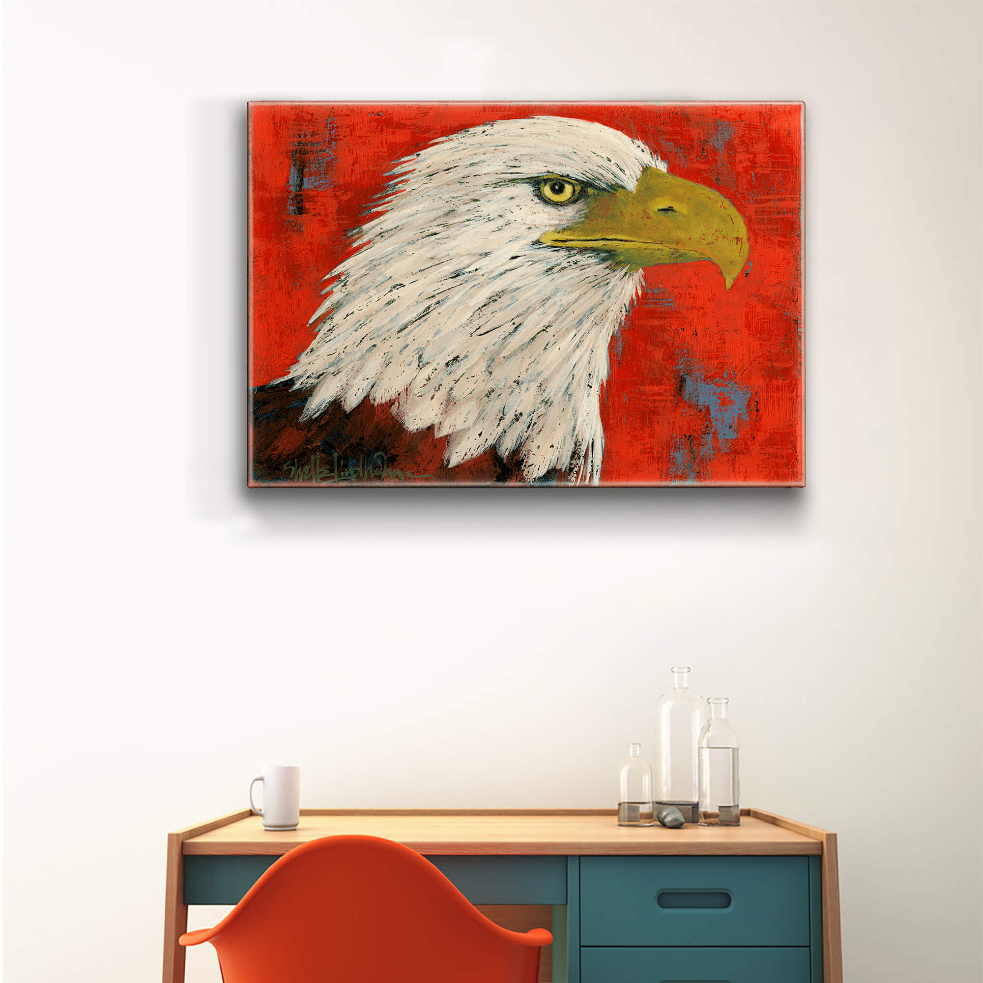 Celebrate strength and majesty with this striking artwork of a bald eagle against a bold red background. The detailed textures in the feathers and piercing gaze capture the eagle’s commanding presence, creating a powerful focal point. Perfect for adding a touch of patriotism or symbolic beauty to your space, this piece exudes confidence and elegance.