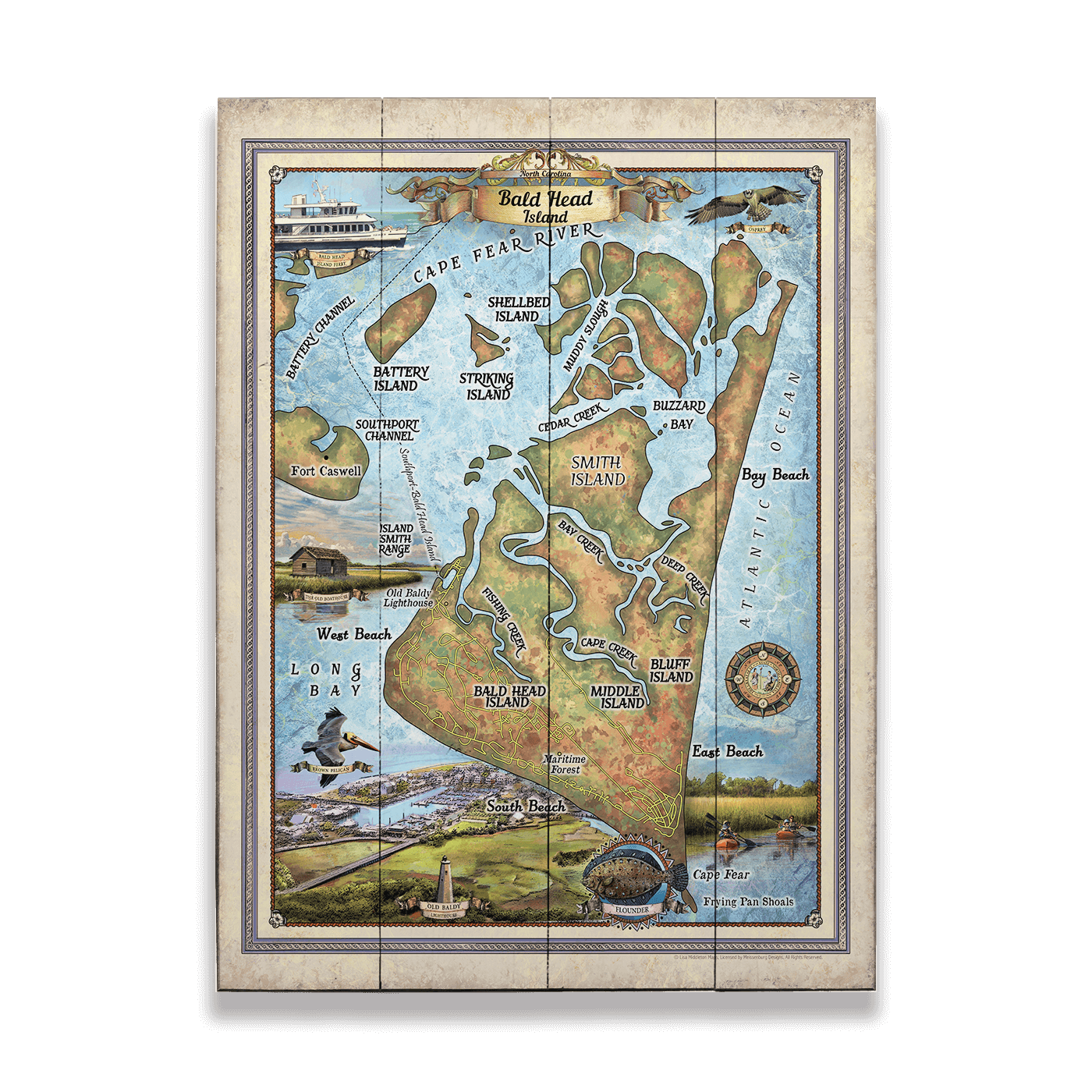 Embark on a visual exploration of Bald Head Island and the Cape Fear River area with this beautifully detailed map. This piece captures the essence of North Carolina’s coastal region, highlighting key landmarks, nautical details, and picturesque landscapes. Perfect for maritime enthusiasts and lovers of coastal geography, the map is richly decorated with artistic elements that bring the charm of Bald Head Island to life. Whether for educational purposes or as a decorative piece, this map serves as a stunning tribute to one of the most scenic and historically rich areas on the Atlantic coast.