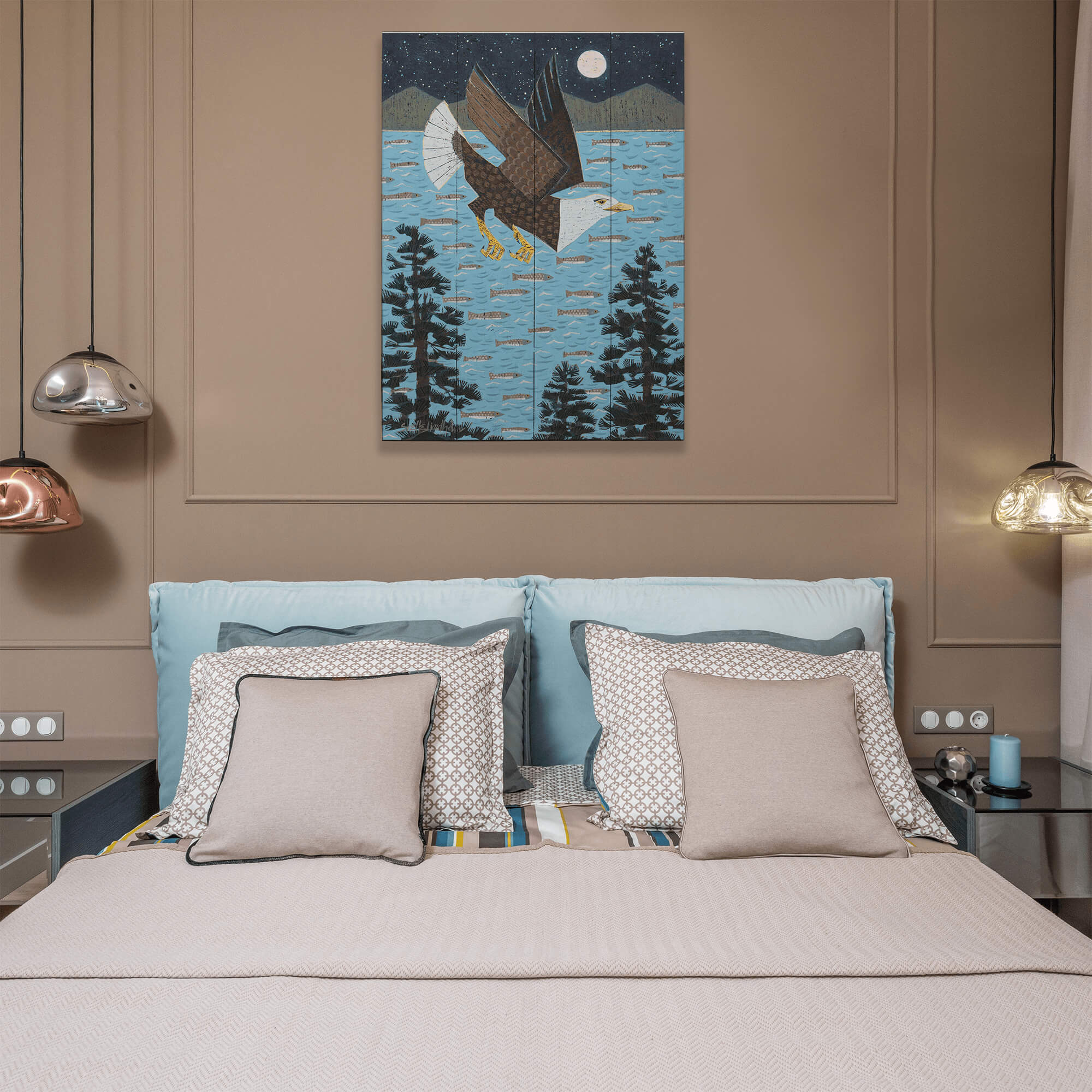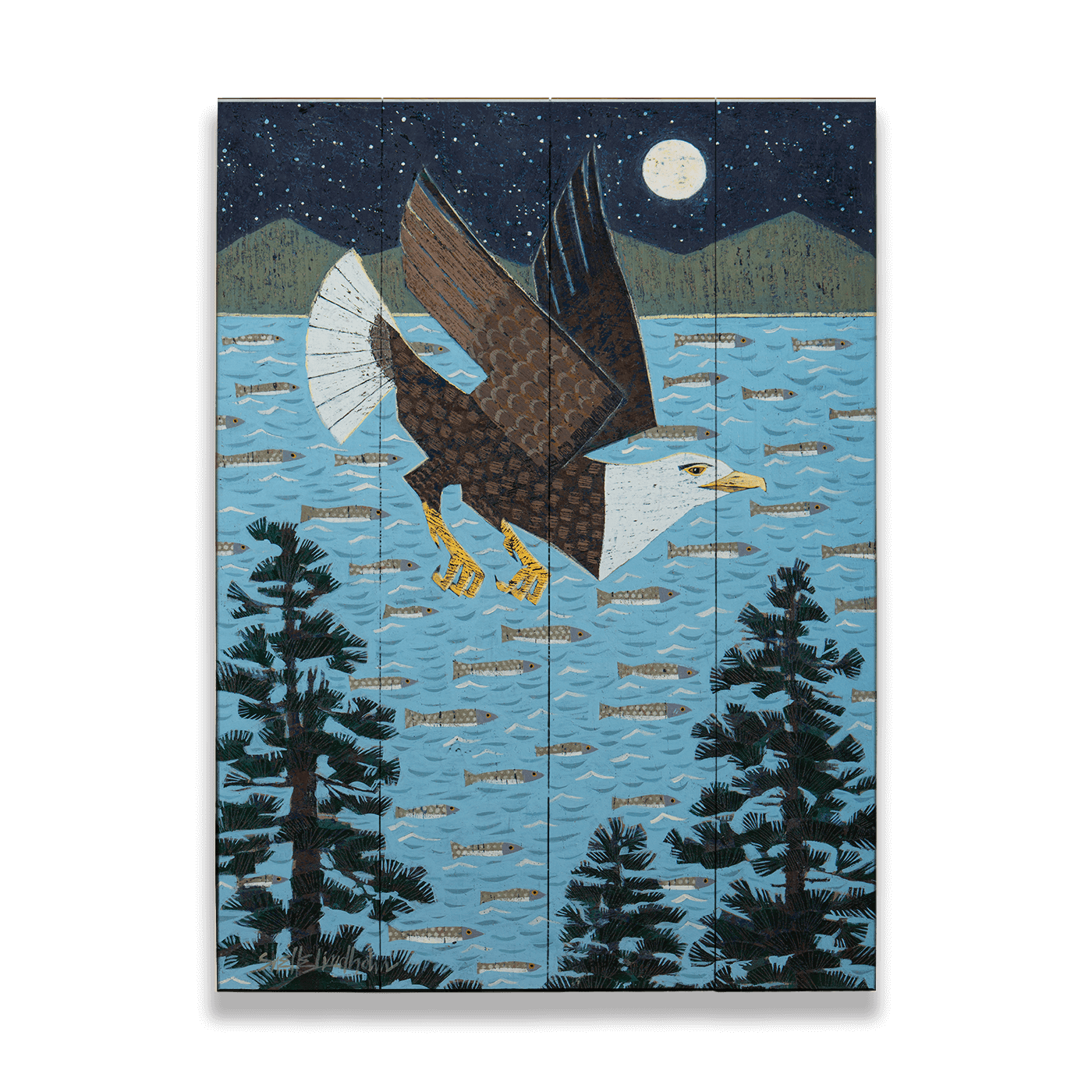 This captivating artwork showcases a majestic bald eagle in flight under a moonlit sky, surrounded by trees and a bay filled with fish. The detailed design and rich textures capture the beauty of nature and the power of the eagle, symbolizing freedom and strength. Perfect for wildlife enthusiasts and nature lovers, this piece adds a sense of serenity and adventure to any space. Ideal for rustic or modern décor, it brings the spirit of the wilderness indoors.