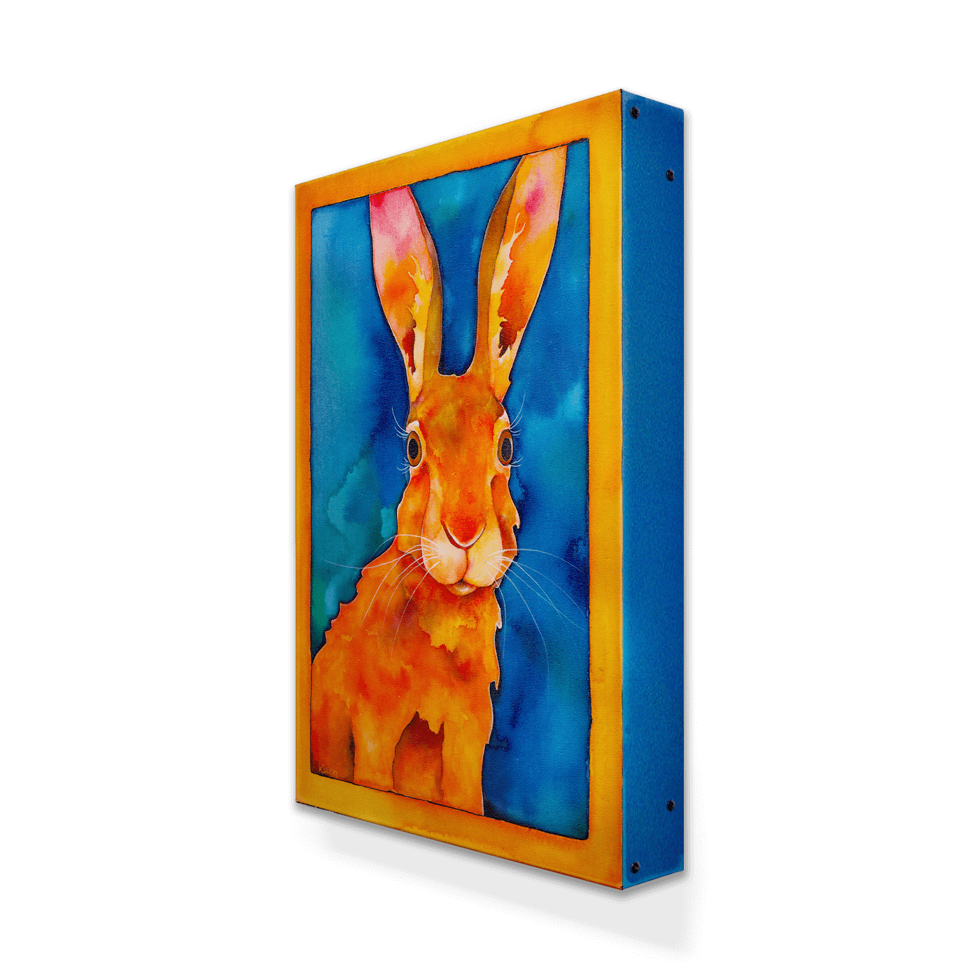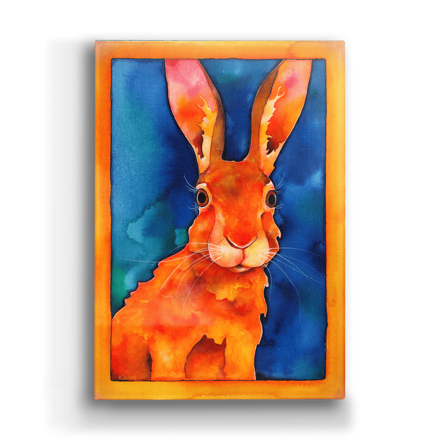 Brighten your space with this vibrant and playful artwork featuring a curious hare. With warm orange tones contrasting against a rich blue background, the hare’s alert gaze and large, expressive ears capture its lively spirit. Framed in a bold border, this piece brings an energetic yet calming presence to any room. Ideal for nature enthusiasts and those who appreciate whimsical animal portraits, this artwork adds a touch of character and charm to your decor, celebrating the beauty and curiosity of wildlife.