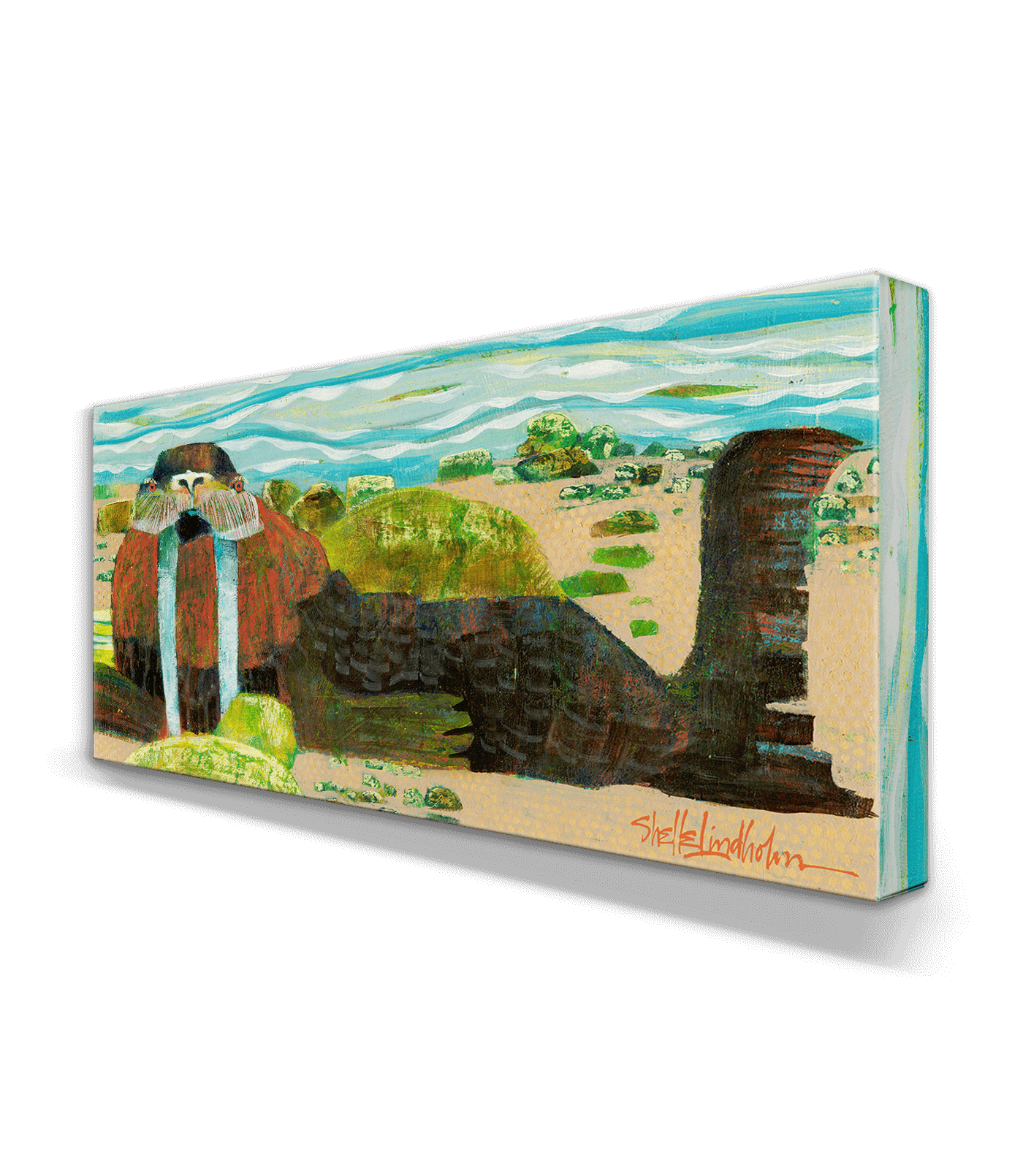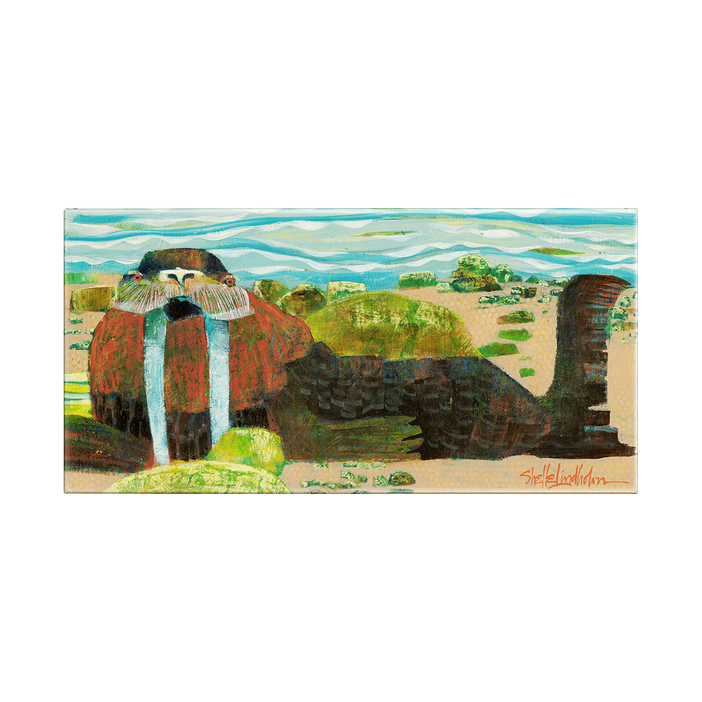 This captivating piece features a lounging walrus with vibrant colors and abstract textures that evoke the rugged beauty of its coastal habitat. The artist’s use of earthy greens and soft blues gives the scene a tranquil yet whimsical feel, making it a perfect addition to any art collection that celebrates wildlife or coastal landscapes.