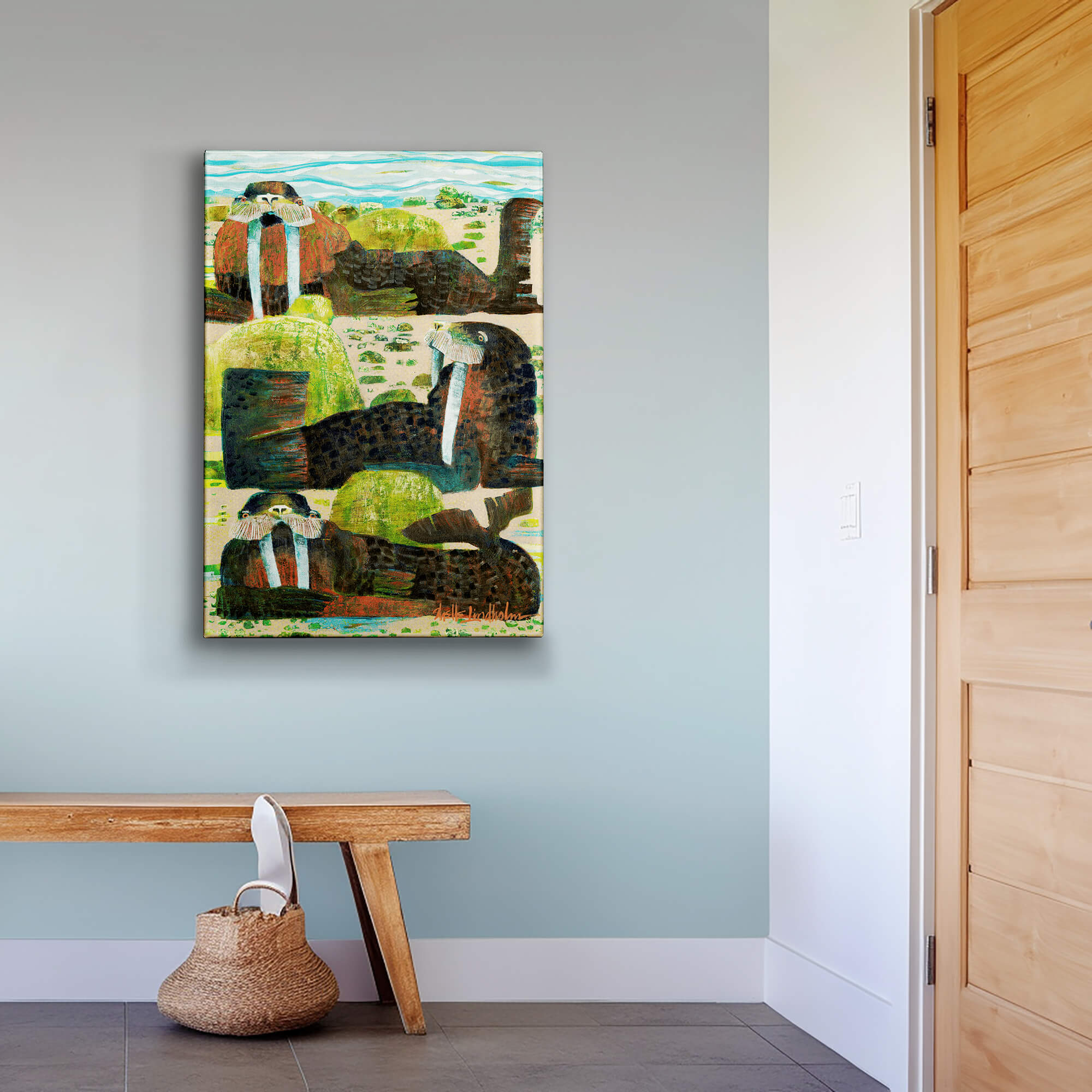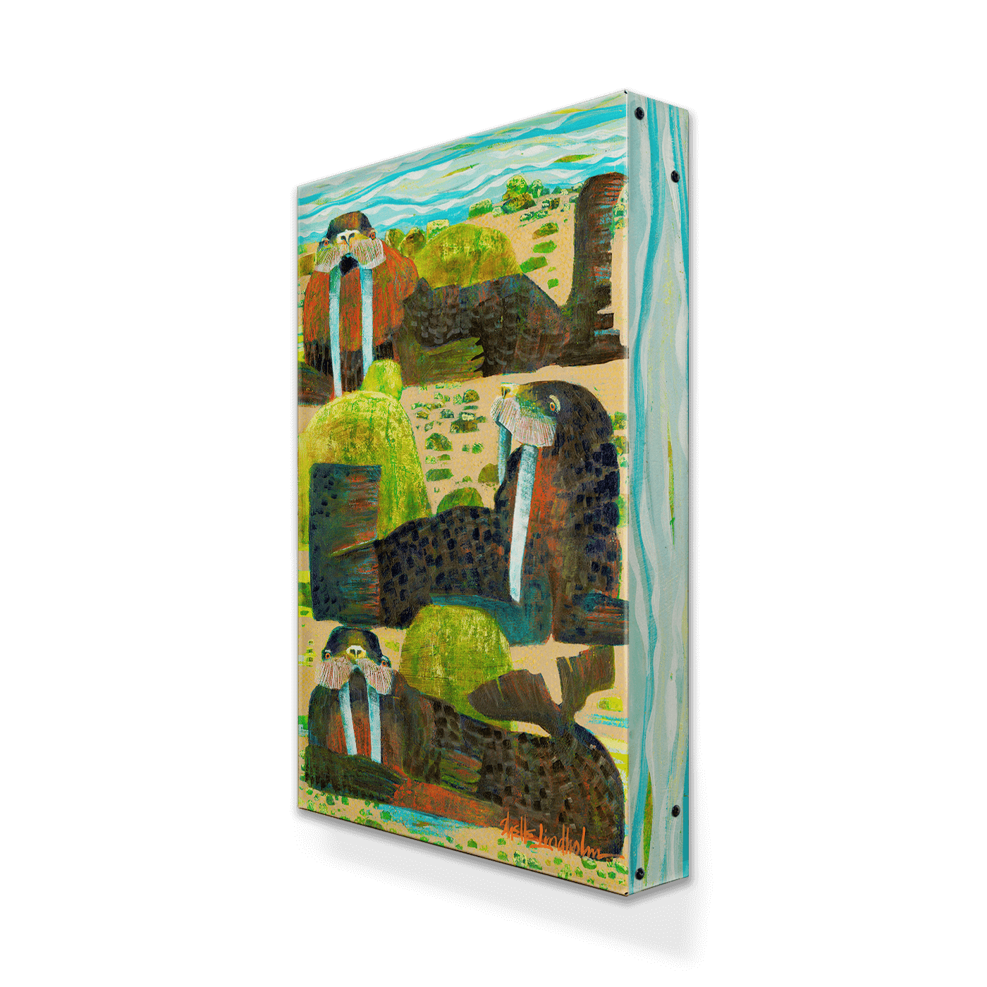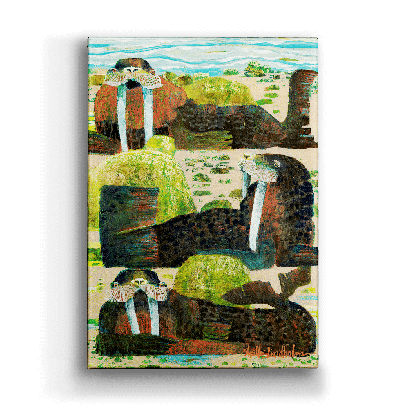 A charming trio of walruses reclines by the shore in this vivid artwork, with intricate brushwork and playful color combinations. The bright hues and dynamic composition bring a sense of movement and warmth, offering an inviting, laid-back atmosphere that complements any modern space with a love for marine life.