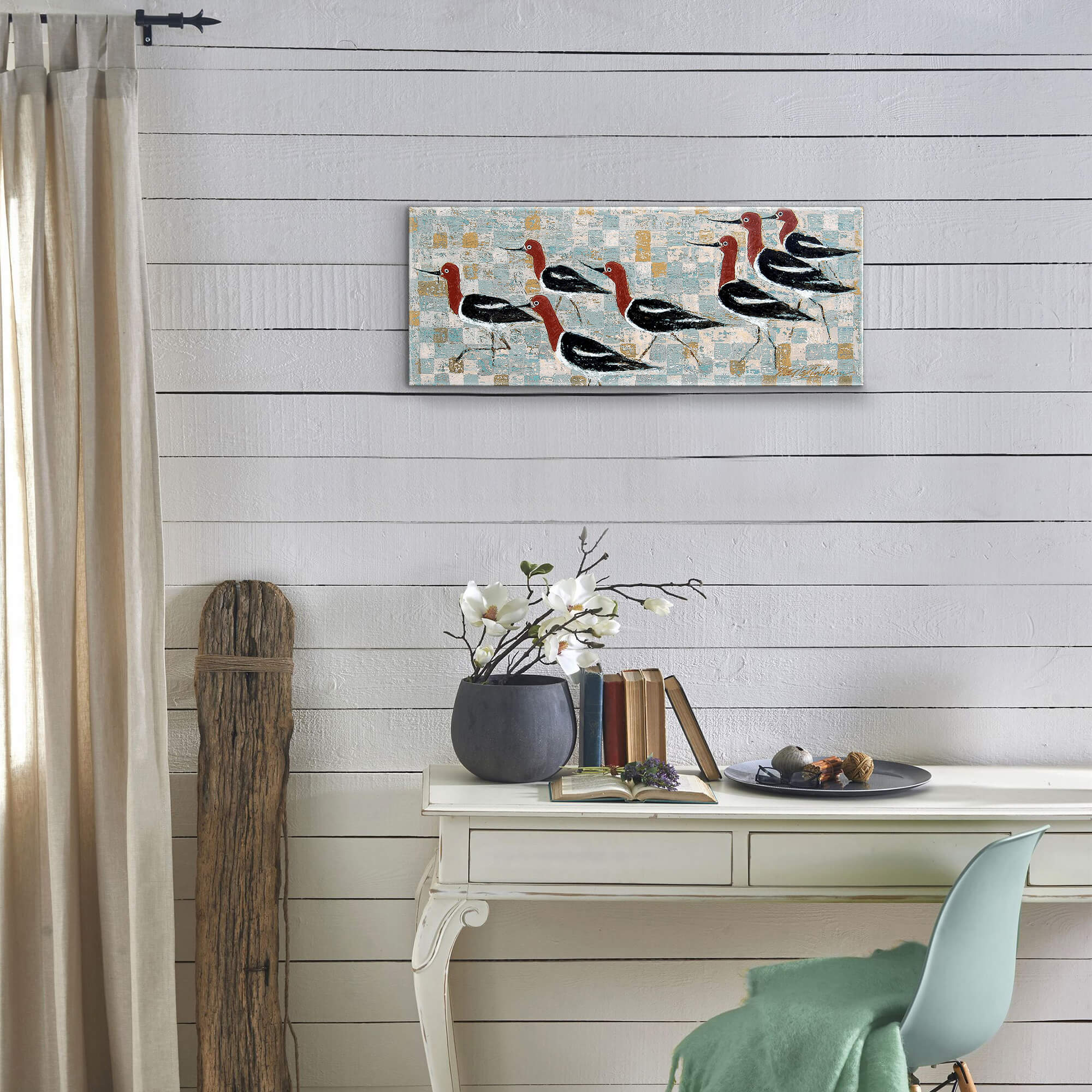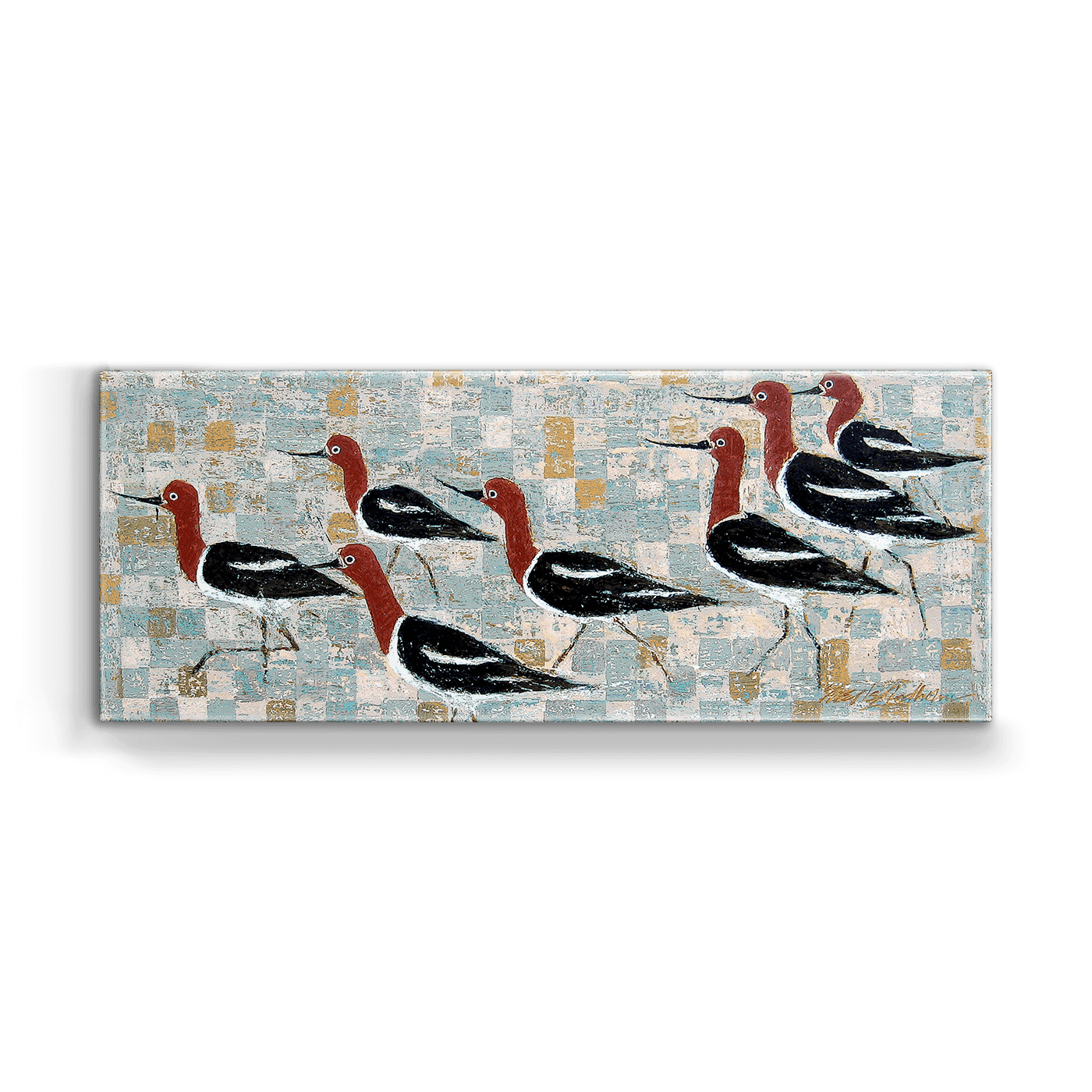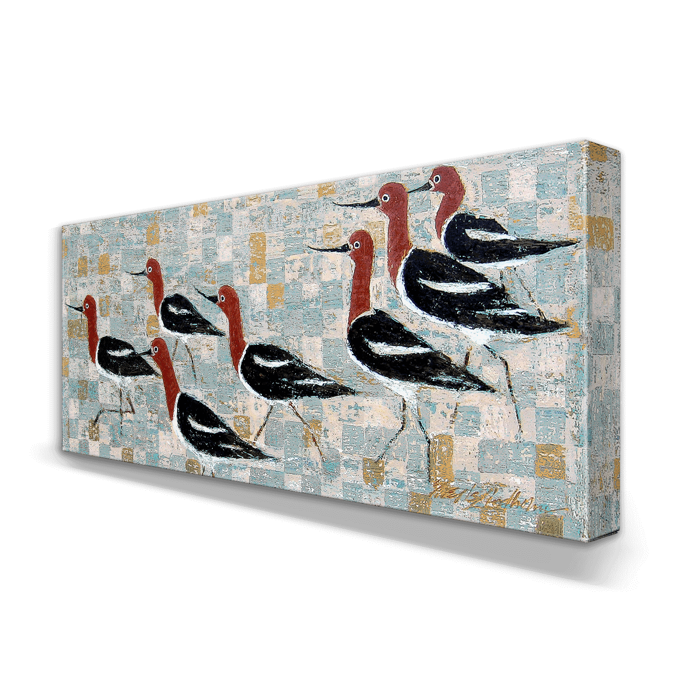 This lively artwork showcases a flock of red-headed avocet birds in graceful formation, their elegant silhouettes brought to life against a textured, patterned backdrop. The interplay of warm and cool tones creates a visually striking contrast, blending structured geometry with naturalistic charm. A celebration of movement and unity in nature, this piece is an ideal addition to any art collection or modern living space. Perfect for bird lovers and design enthusiasts alike!