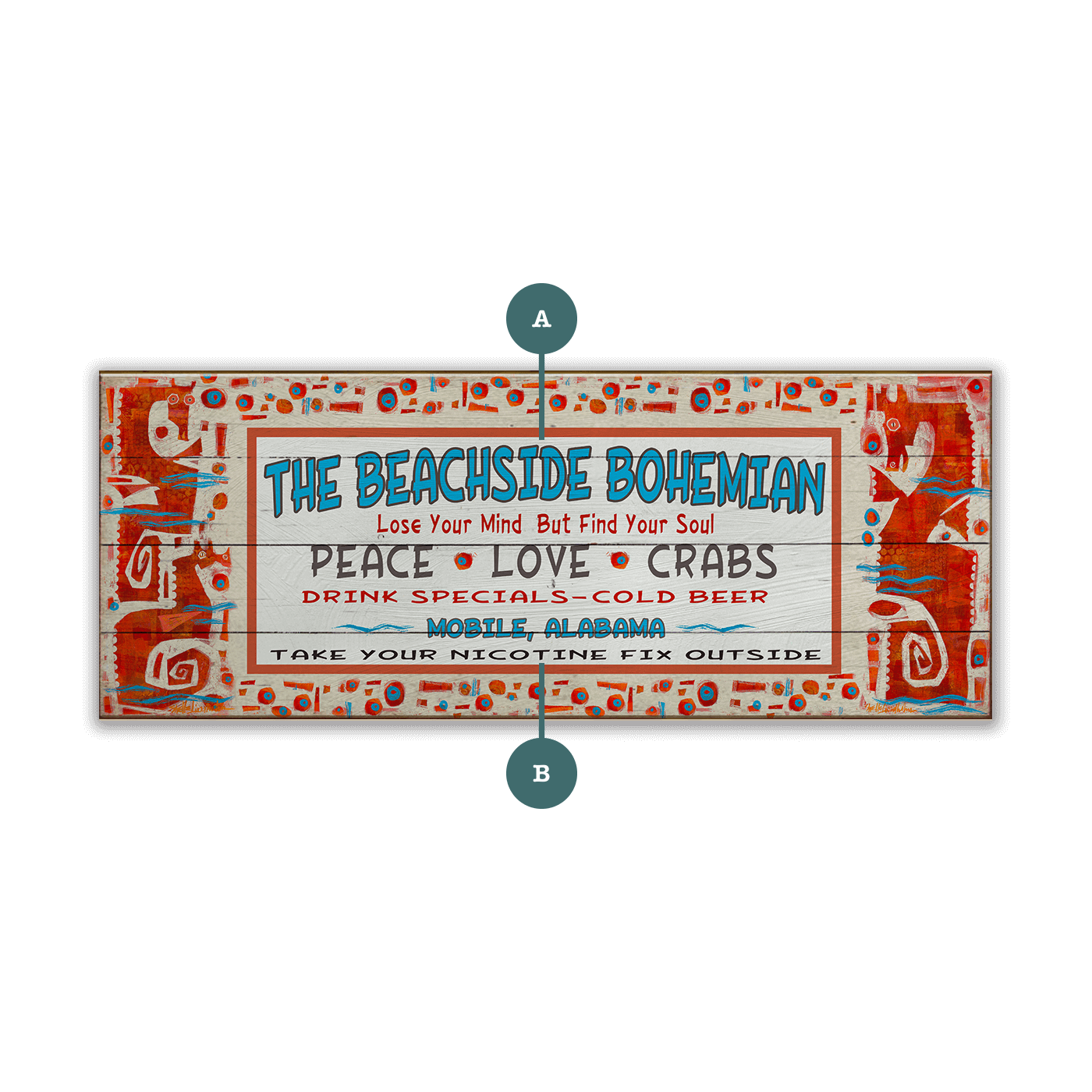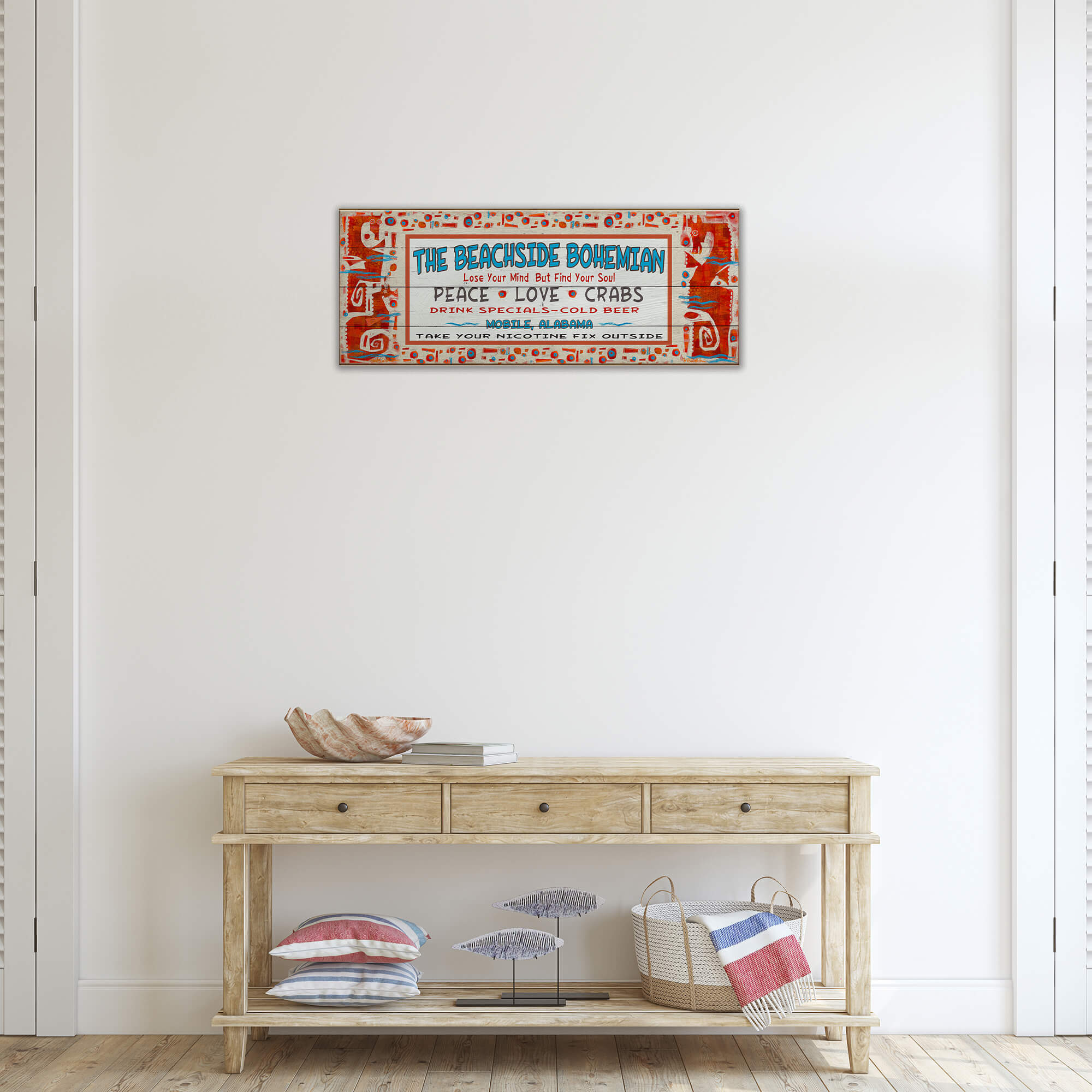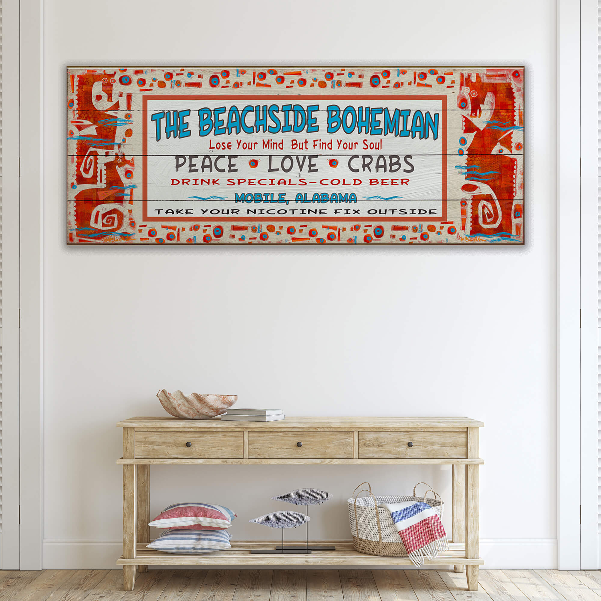 This artwork radiates a vibrant, bohemian energy with its eclectic design and playful patterns. A dynamic mix of swirling red seahorses and colorful motifs with cool blue accents frames the central text, creating a sense of inviting movement and free-spirited charm. Celebrating a blend of relaxation, fun, and a touch of quirky personality, this piece is perfect for those who embrace life’s vibrant and carefree moments.