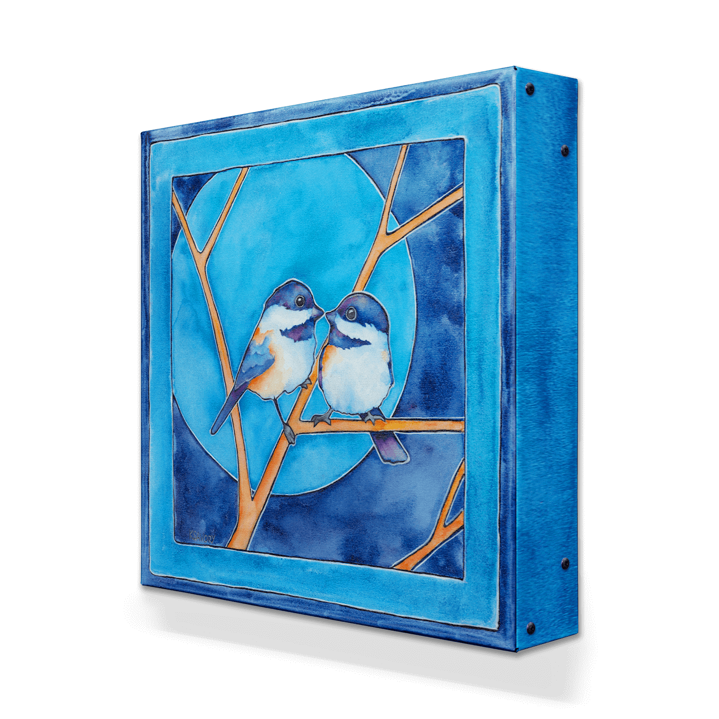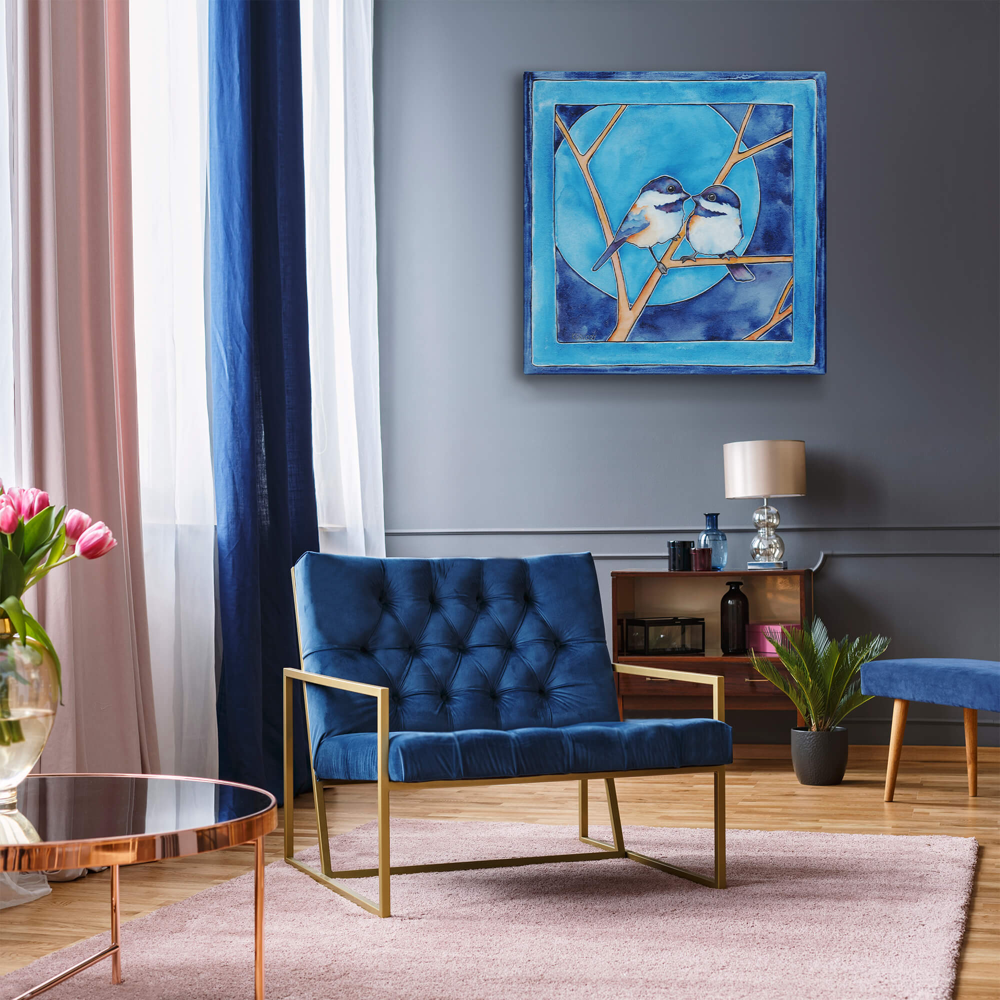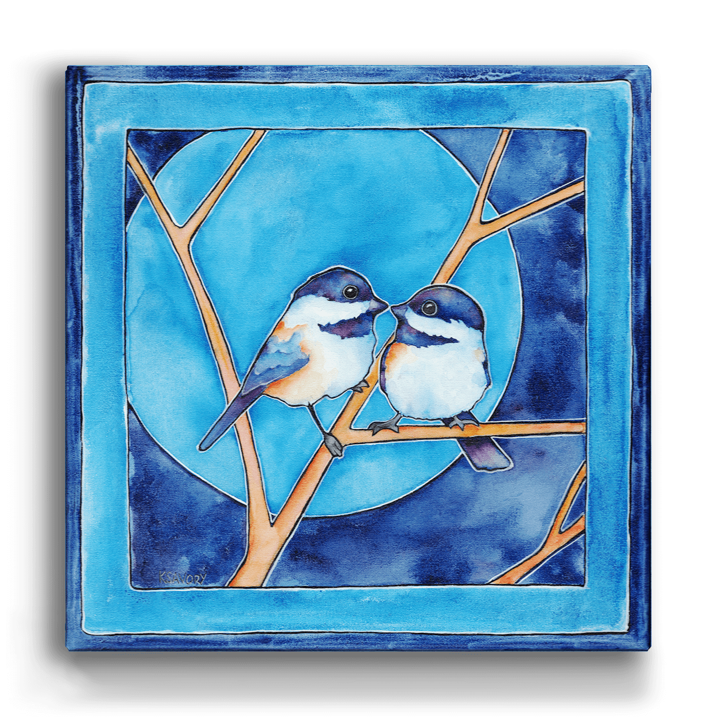 Bring a sense of charm and serenity to your space with this peaceful and timeless artwork featuring two chickadees perched lovingly on bare branches. Framed in calming shades of blue with a soft moonlit glow, this piece exudes tranquility and the quiet beauty of nature. Perfect for bird lovers or those seeking a soothing touch for their home, this artwork captures a tender moment of connection.