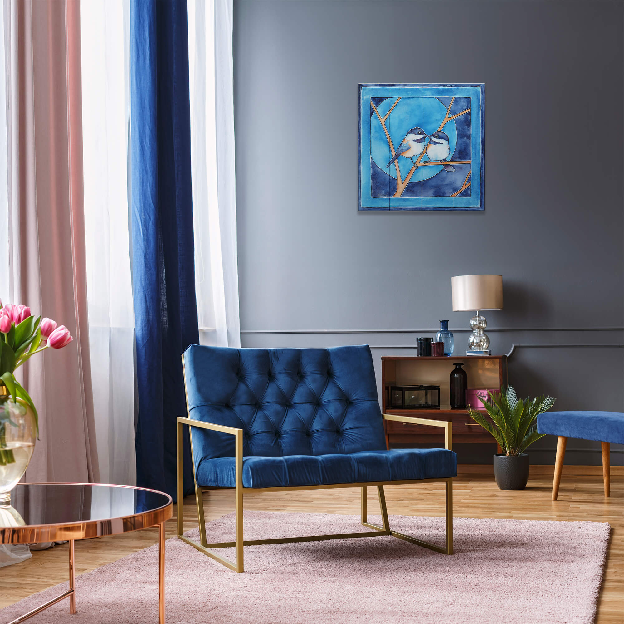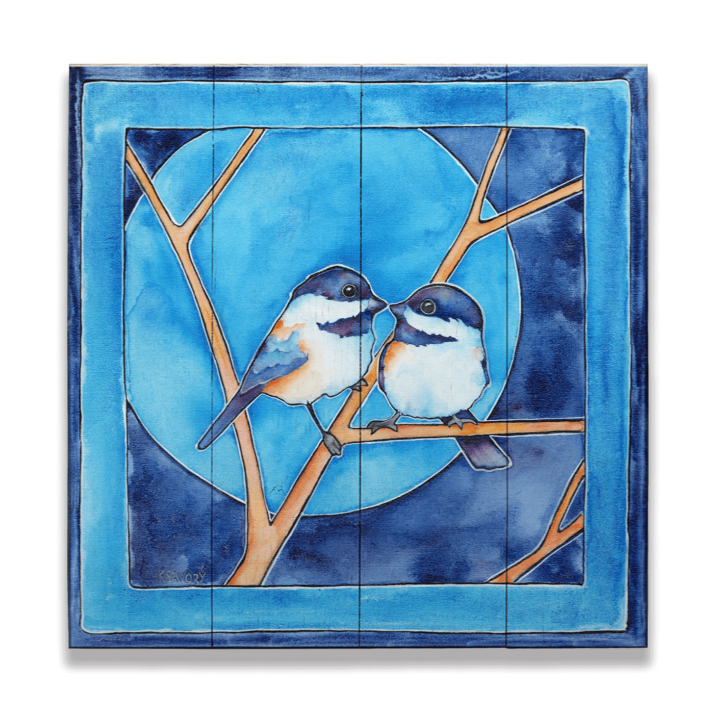 Bring a sense of charm and serenity to your space with this peaceful and timeless artwork featuring two chickadees perched lovingly on bare branches. Framed in calming shades of blue with a soft moonlit glow, this piece exudes tranquility and the quiet beauty of nature. Perfect for bird lovers or those seeking a soothing touch for their home, this artwork captures a tender moment of connection.