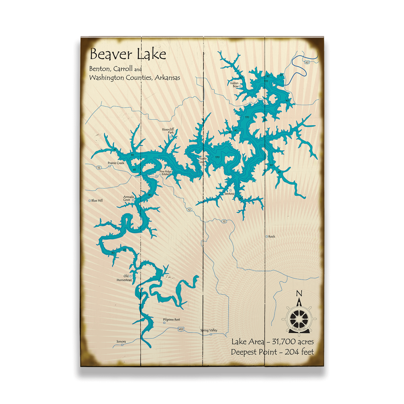 Introducing our stunning vintage map of Beaver Lake - a man-made reservoir nestled in the Ozark Mountains of Northwest Arkansas. Formed by a dam across the White River, this picturesque lake spans an impressive 487 miles (784 km) of shoreline, offering visitors breathtaking views of towering limestone bluffs, natural caves, and a wide variety of trees and flowering shrubs.
