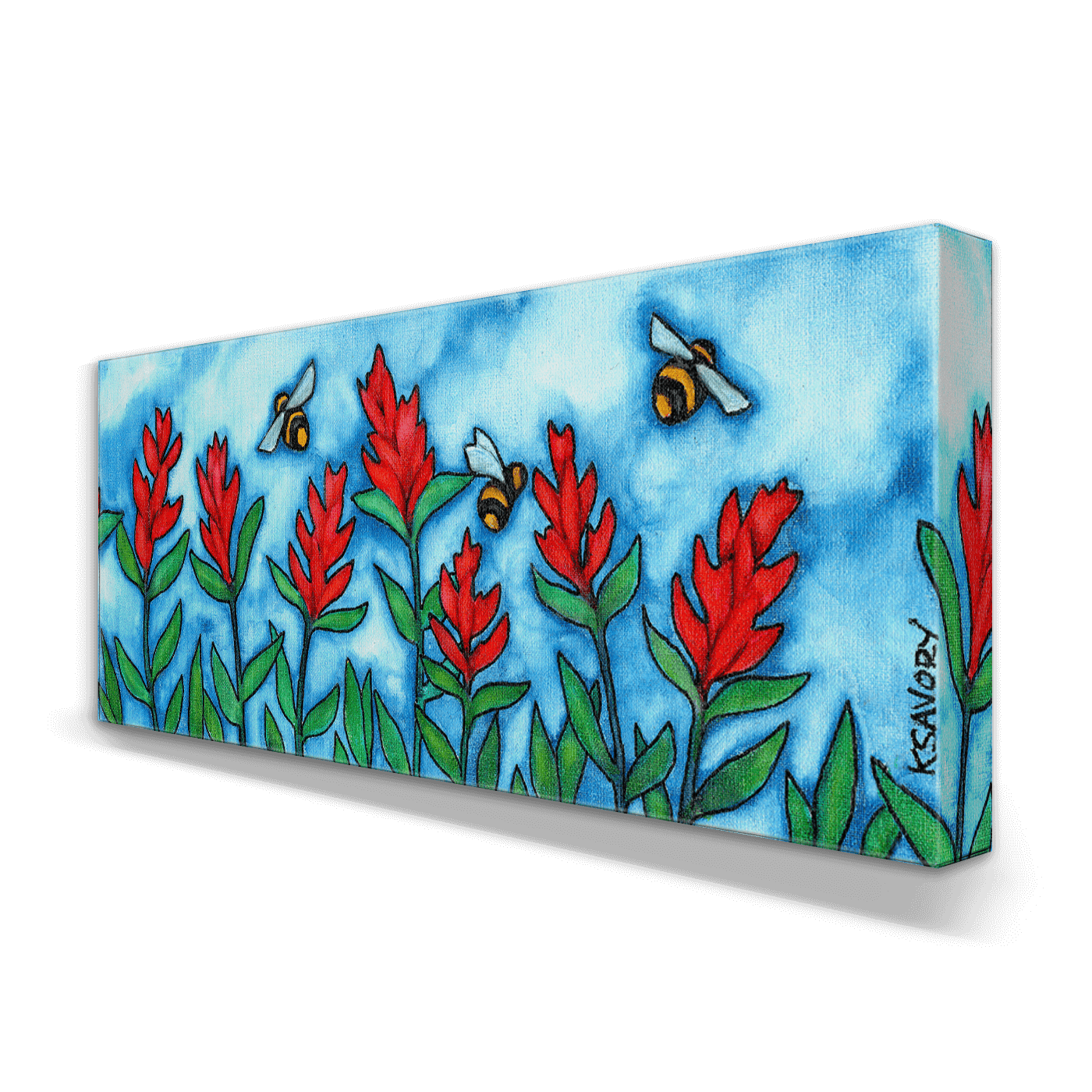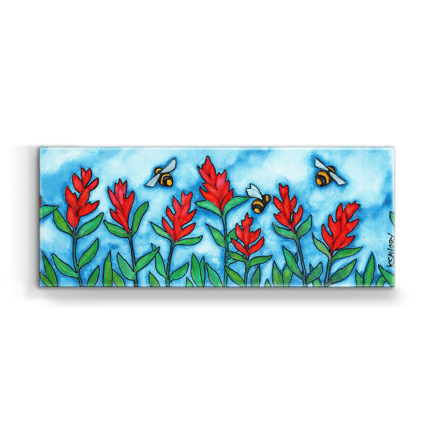 Inspire joy and connection with nature with this delightful artwork featuring vibrant red wildflowers and busy bees dancing under a blue sky. The cheerful composition captures the harmony of nature, with lush green leaves and the energy of pollinators at work. Perfect for brightening any room, this piece celebrates the beauty and vitality of our natural world.