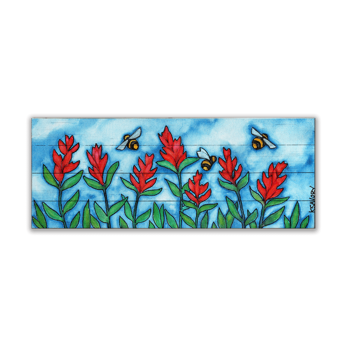 Inspire joy and connection with nature with this delightful artwork featuring vibrant red wildflowers and busy bees dancing under a blue sky. The cheerful composition captures the harmony of nature, with lush green leaves and the energy of pollinators at work. Perfect for brightening any room, this piece celebrates the beauty and vitality of our natural world.