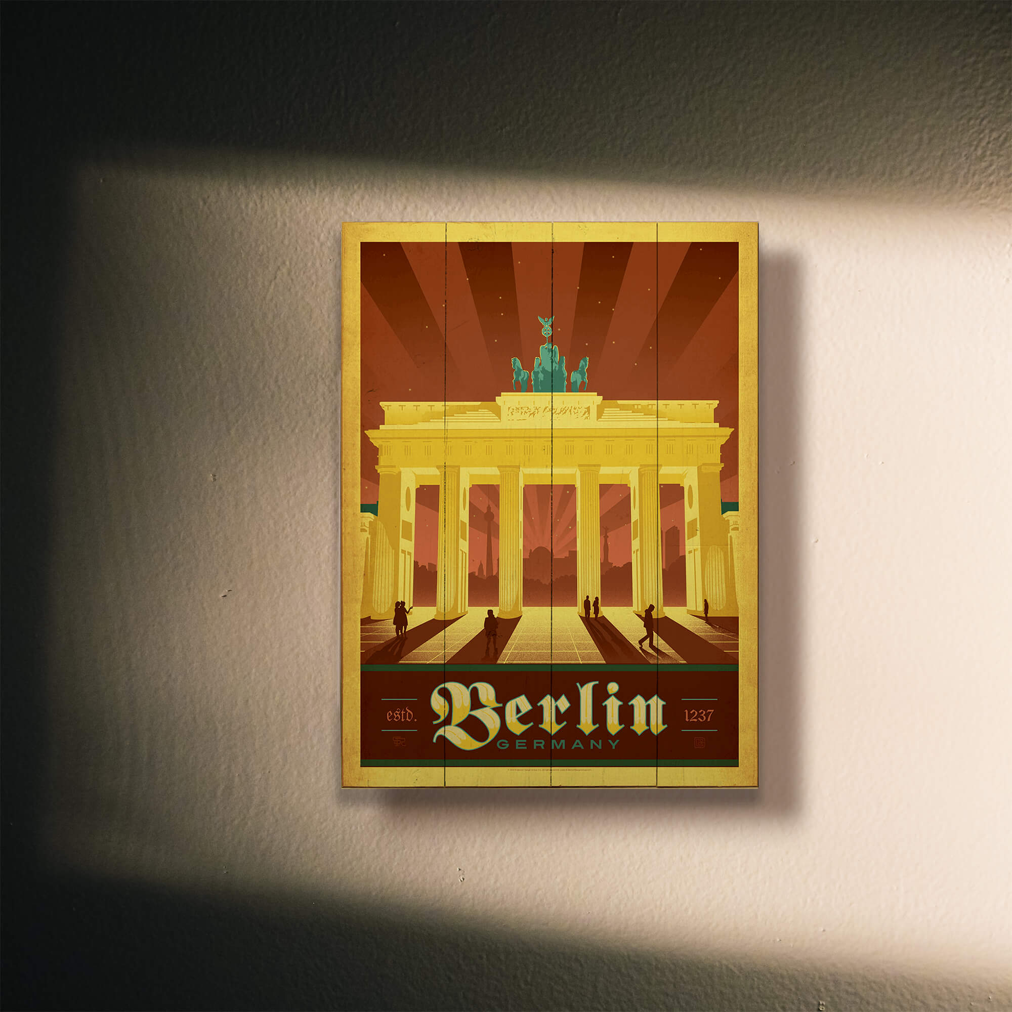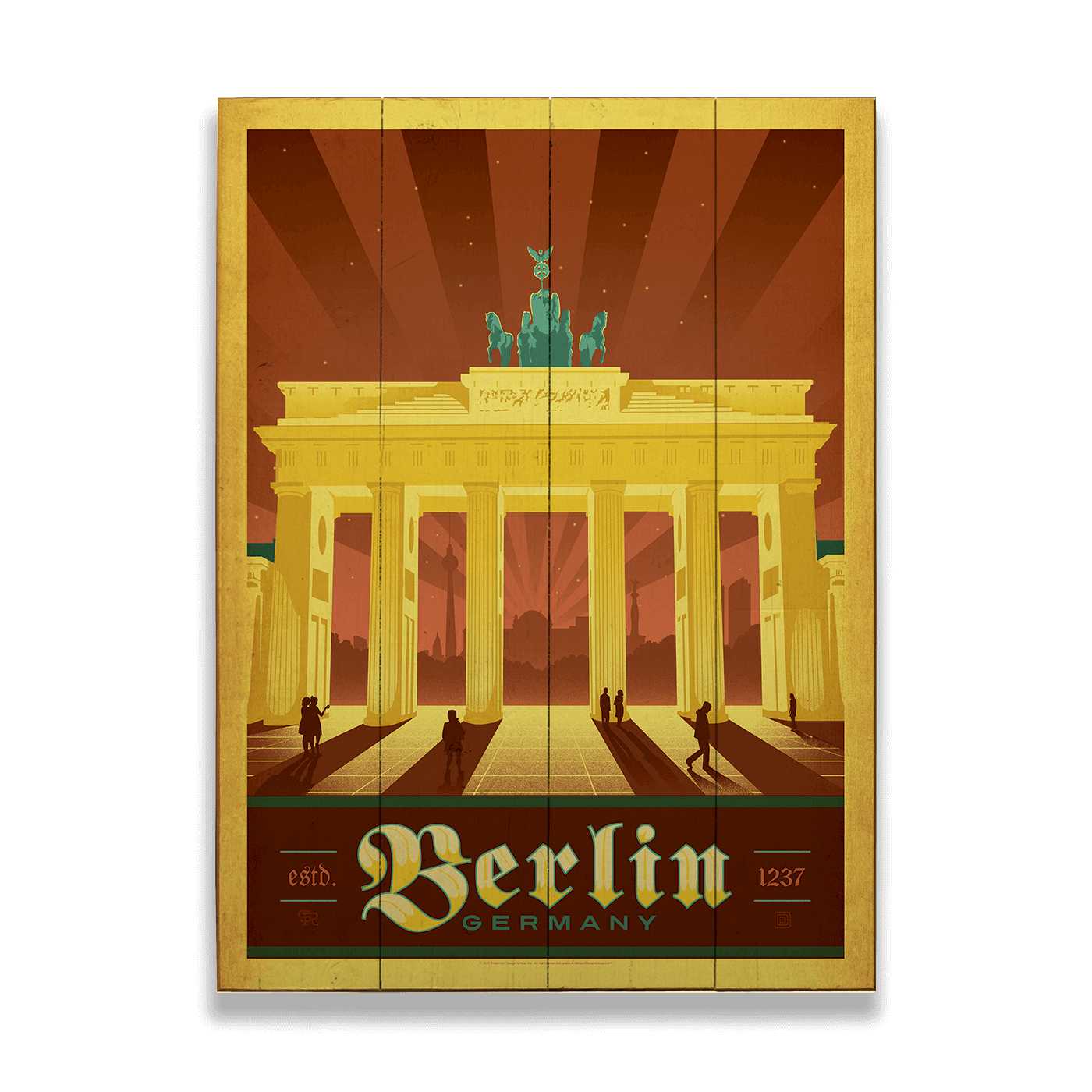 Capture the essence of Germany's vibrant capital with this exquisite travel print of Berlin. Highlighting the majestic Brandenburg Gate, a symbol of unity and history, this piece brings to life the cultural heartbeat of the city. Crafted with warm colors and a sense of nostalgic elegance, it's a perfect homage to Berlin's storied past and dynamic present. Ideal for history buffs, urban explorers, and art lovers, this Berlin poster is a splendid way to commemorate the city's enduring spirit and would make a sophisticated addition to any collection.