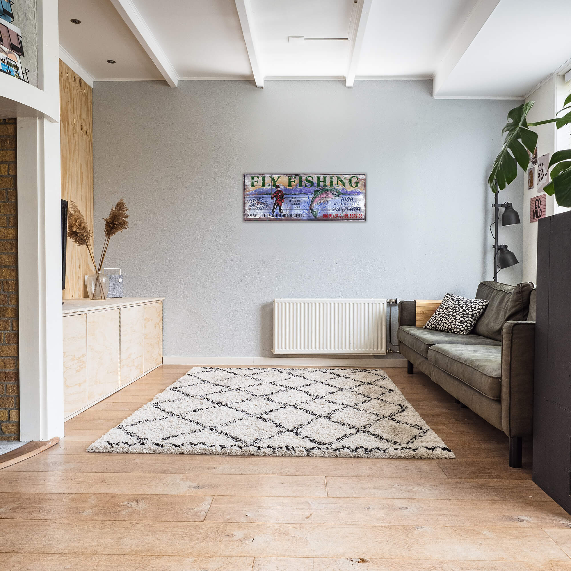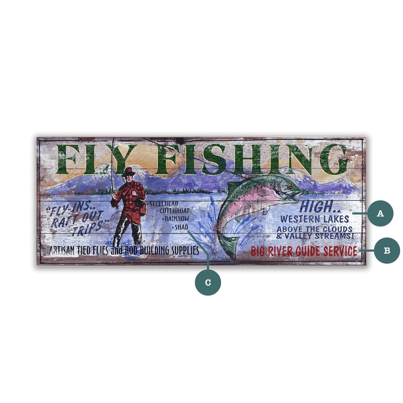 Celebrate the timeless thrill of the cast with this vintage-style fly fishing sign, illustrated in a bold, painterly style that evokes the hand-painted charm of classic outdoor advertisements. Featuring a well-outfitted angler and a vivid rainbow trout, the scene conjures up memories of remote rivers and expertly tied flies. Whether you're drawn to fly-in backcountry adventures or quiet valley streams, this piece captures the enduring spirit of the sport. Customizable with the names of your preferred catches and location, this sign makes a fitting addition to cabins, fishing lodges, outfitters, or rustic retreats.