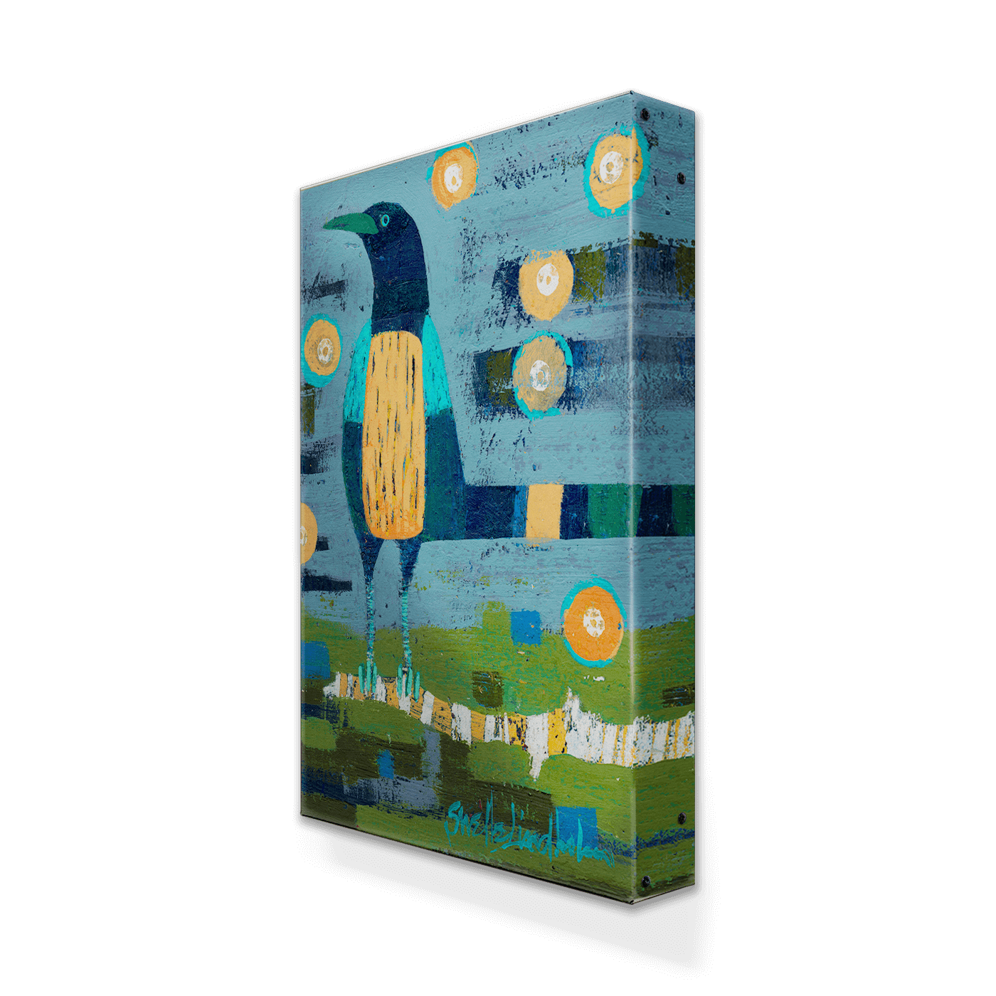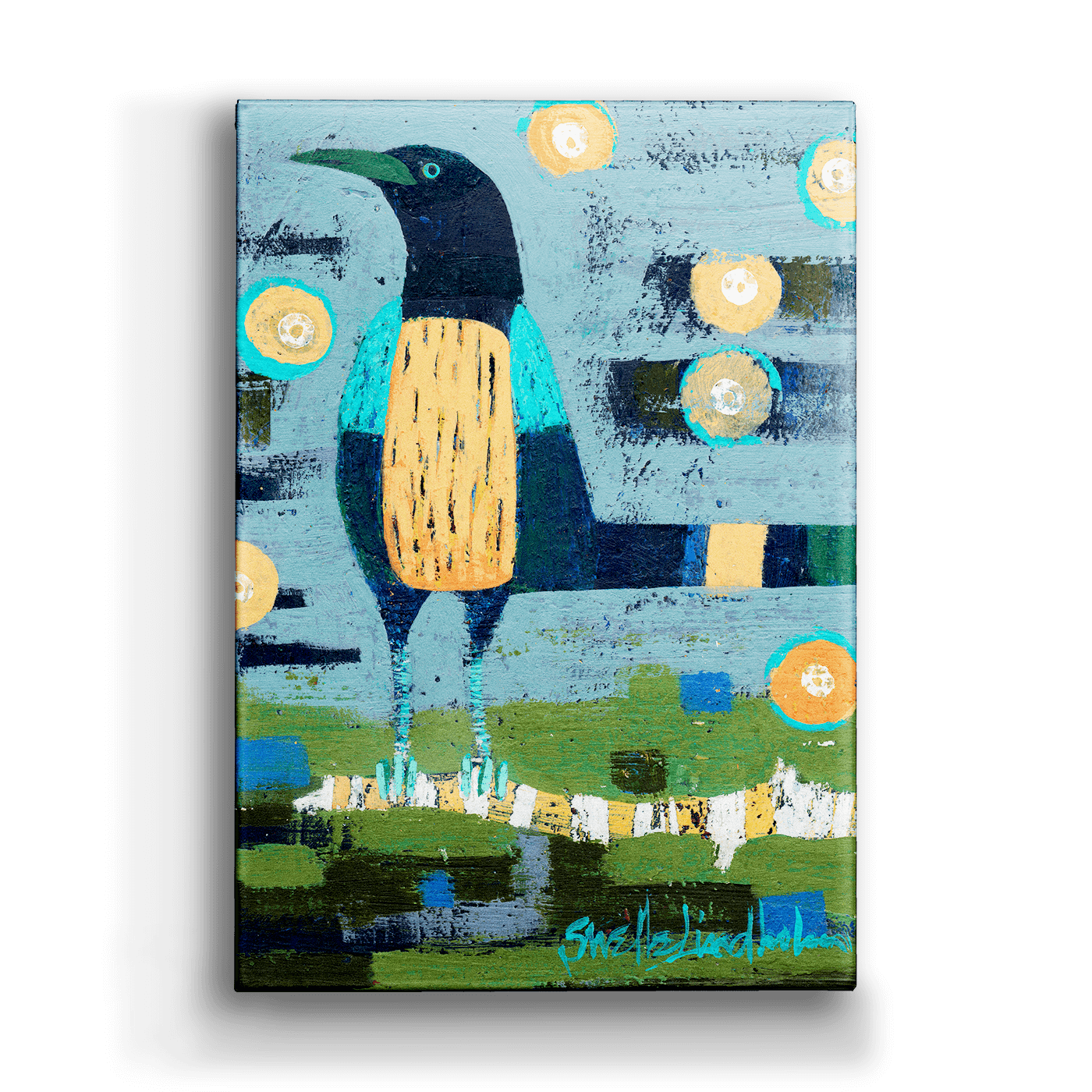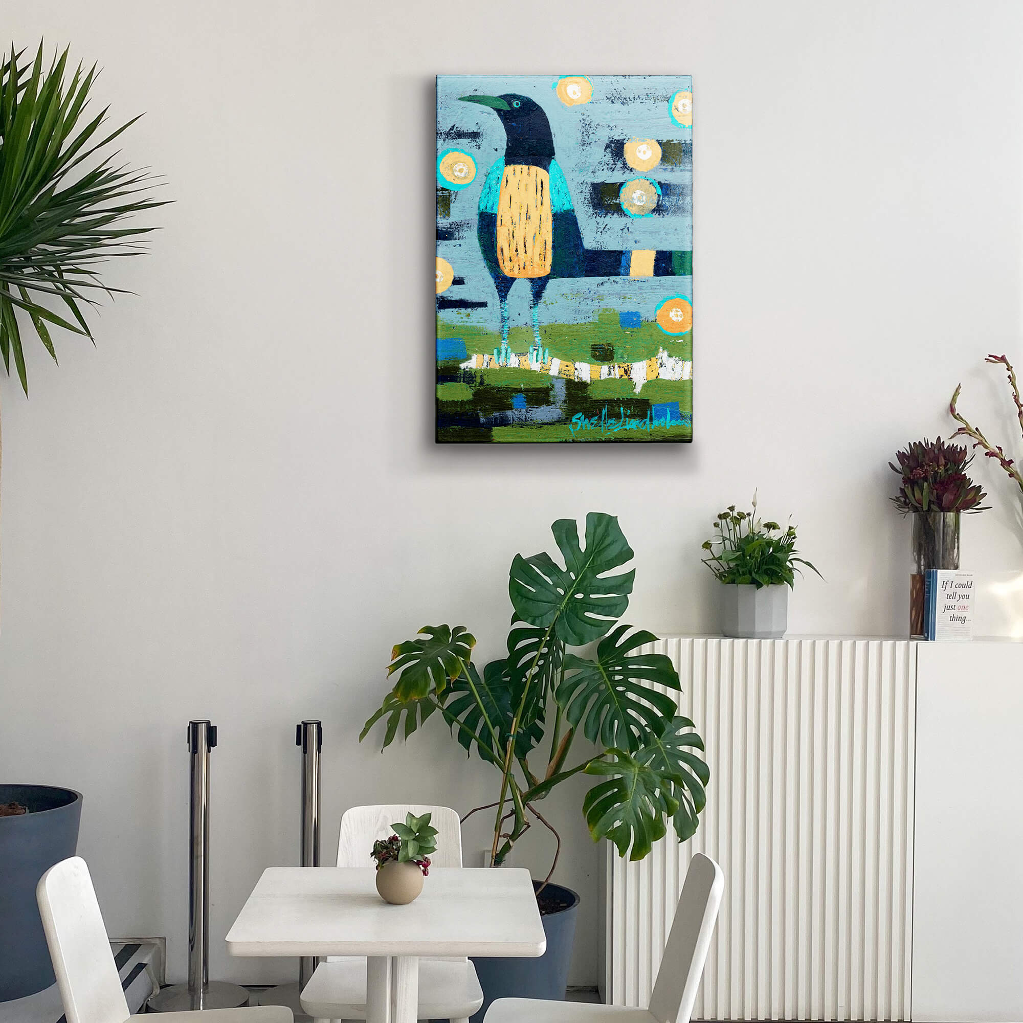 This modern and whimsical artwork features a bold bird standing proudly amidst a textured, abstract background of soft blues, greens, and pops of warm yellow. The bird's striking black, teal, and golden hues create a captivating contrast, making it a vibrant focal point. With its unique, layered brushstrokes and playful design, this piece is perfect for contemporary spaces or nature-inspired decor. Ideal for art enthusiasts seeking a blend of creativity and charm, this artwork brings a dynamic, joyful energy to any room.