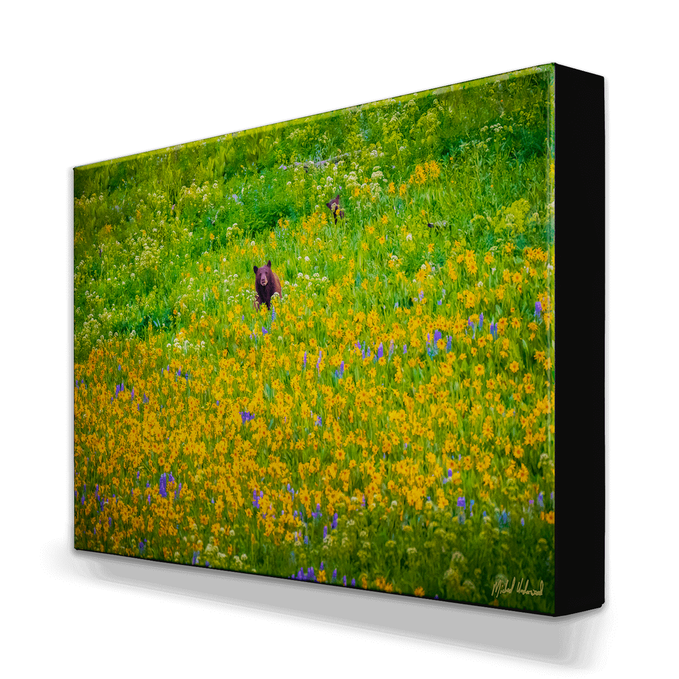 Nestled within a vibrant tapestry of wildflowers, a black bear and its companion become unexpected yet harmonious elements of a lush meadow. Swathes of yellow blooms punctuated by dashes of blue and white create a dazzling natural mosaic. As the bear's gaze meets the viewer, it seems to embody the wisdom of the wilderness.