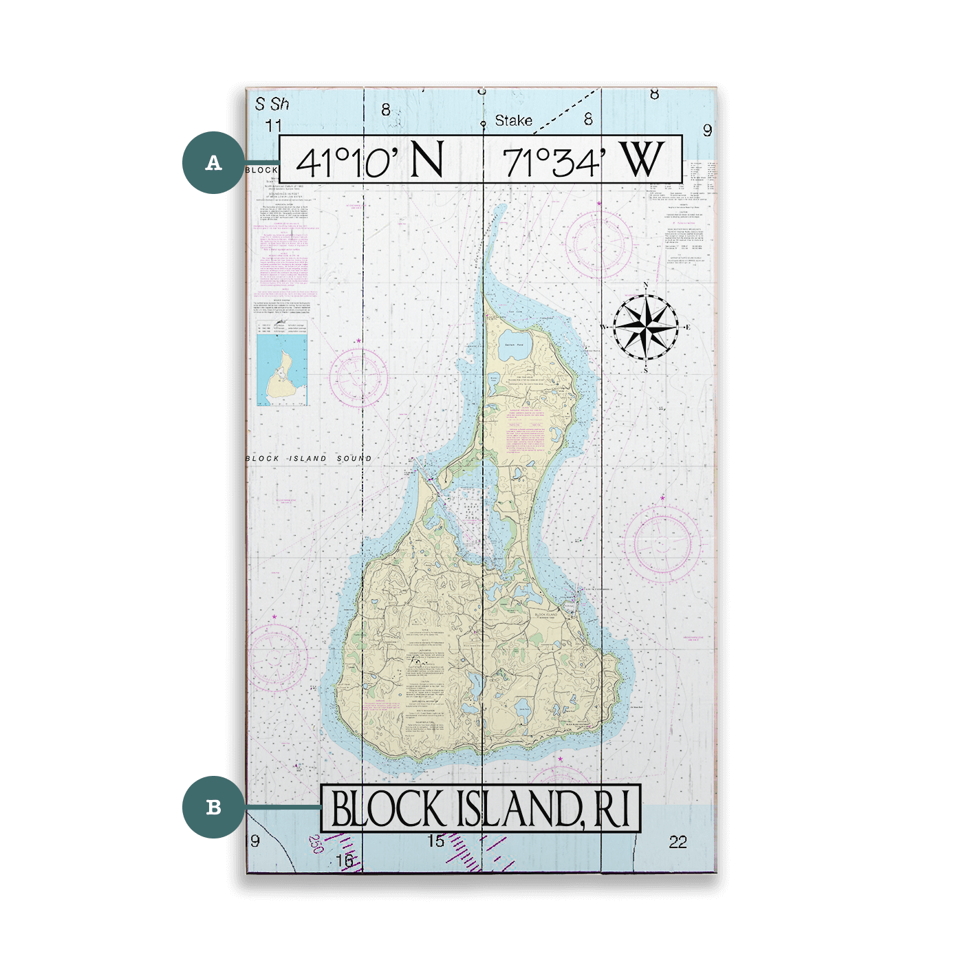 This artwork features a detailed chart of Block Island, Rhode Island, capturing the island's distinctive shape along with coordinates (41°10' N, 71°34' W) and a decorative compass rose. Known for its dramatic bluffs, sandy beaches, and historic lighthouses, Block Island is a hidden gem in New England’s coastal landscape. A favorite retreat for sailors, nature lovers, and history enthusiasts, the island offers breathtaking ocean views, serene hiking trails, and a rich maritime heritage. With customizable coordinates and name options, this artwork is a timeless way to celebrate Block Island’s natural beauty and seafaring spirit in any home or coastal-inspired space.