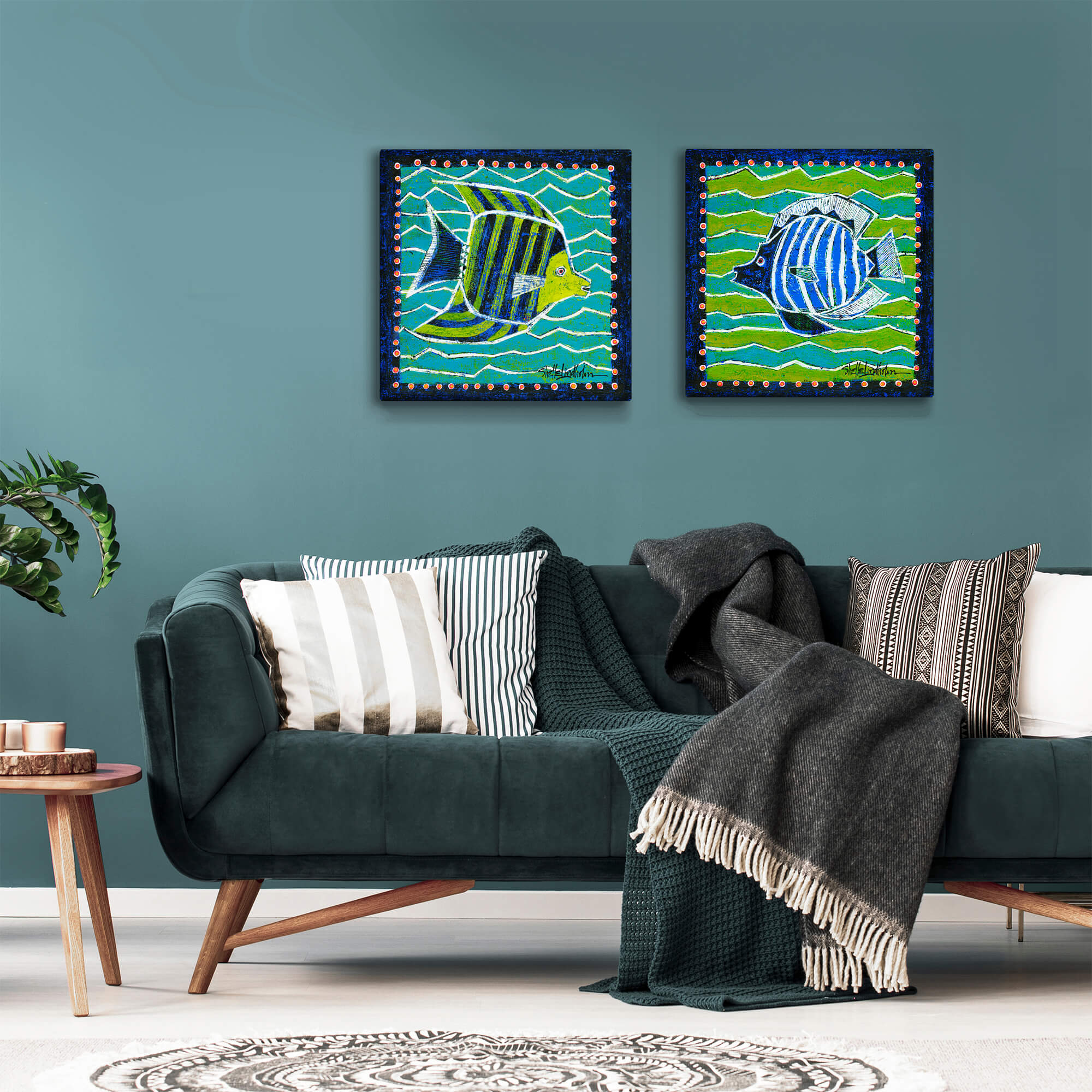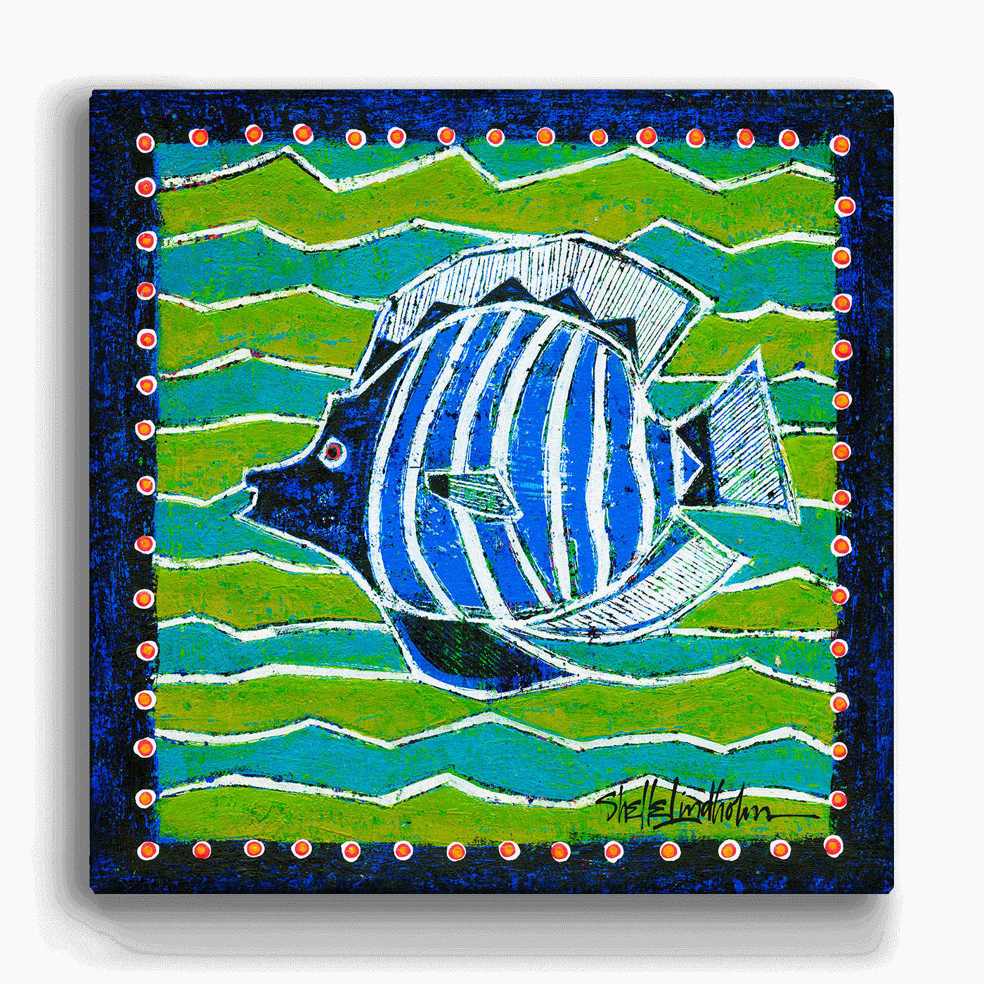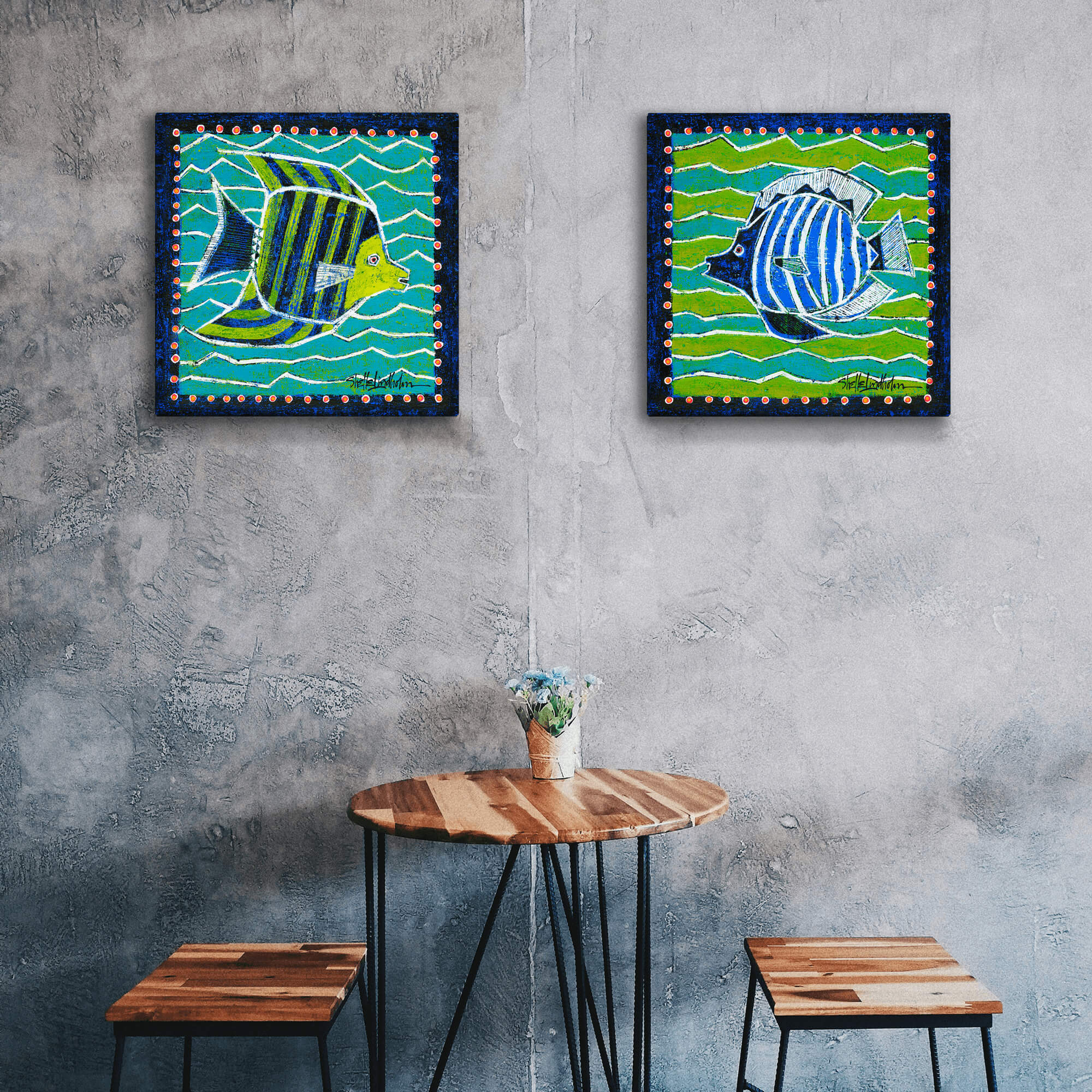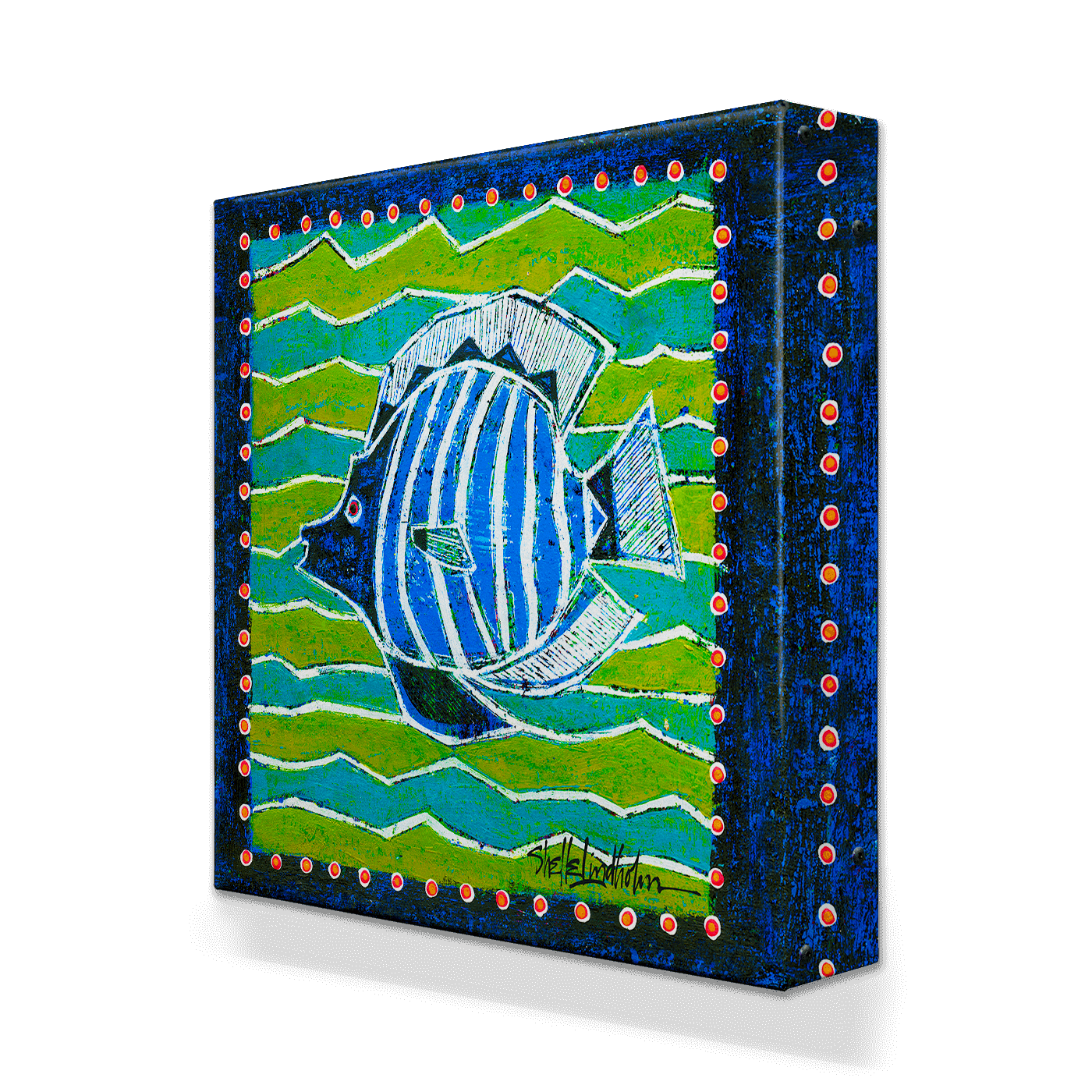 Dive into the vibrant world of aquatic art with this striking blue and white angelfish painting. Showcasing a lively fish in motion against a dynamic pattern of blue and green waves, this artwork brings a splash of color and energy to any room. It can be paired with its companion piece, featuring another angelfish in green and blue, for a harmonious look or enjoyed on its own for a distinct marine-inspired statement.