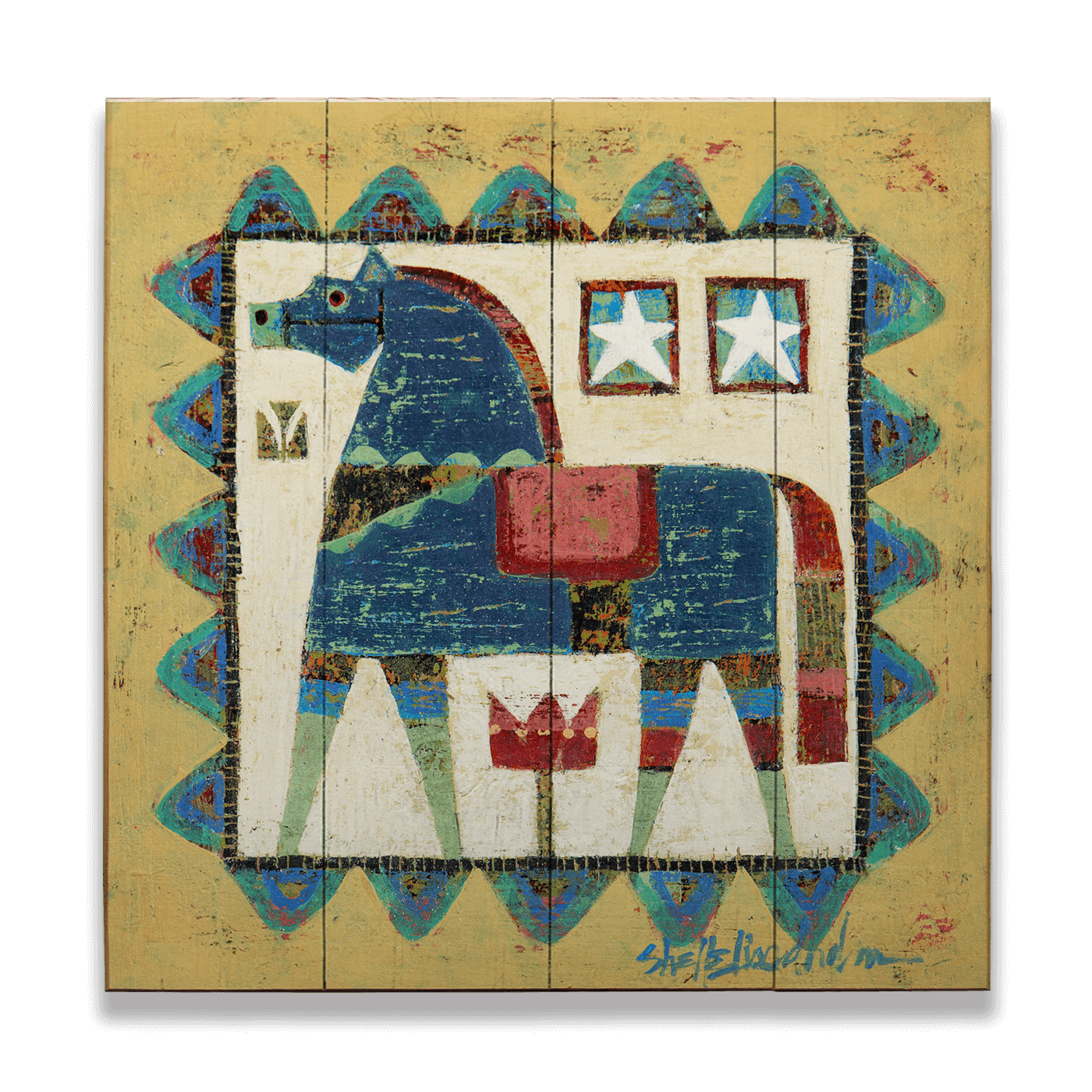 Part of our collection of four Swedish Dala horse-inspired paintings, this charming artwork features a striking blue horse, framed by a vibrant border of geometric patterns. The symbolic motifs of stars and a tulip add a touch of whimsy and tradition, evoking the charm of Scandinavian design. Perfect for adding a rustic, cultural flair to any space, this piece is a timeless tribute to heritage and craftsmanship.