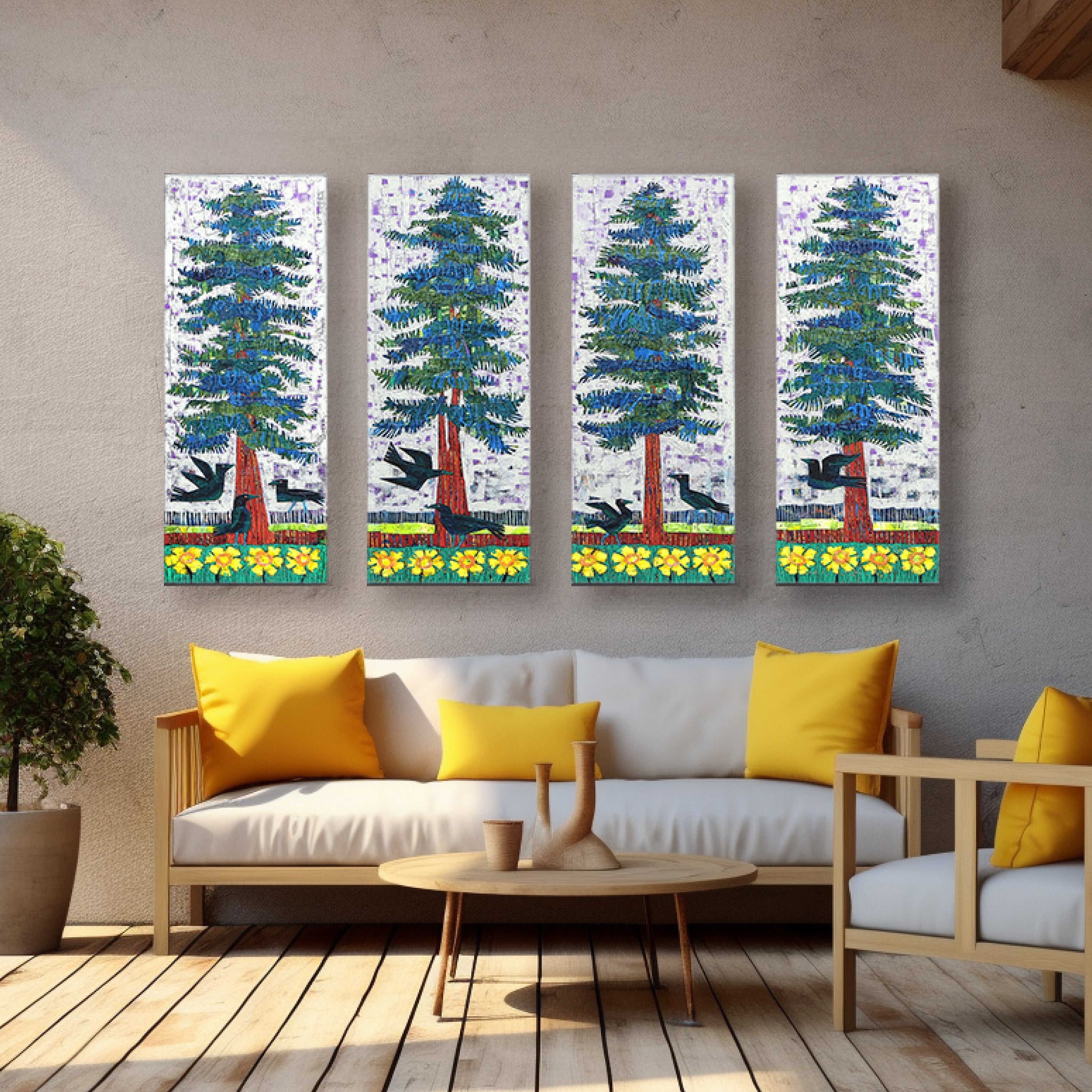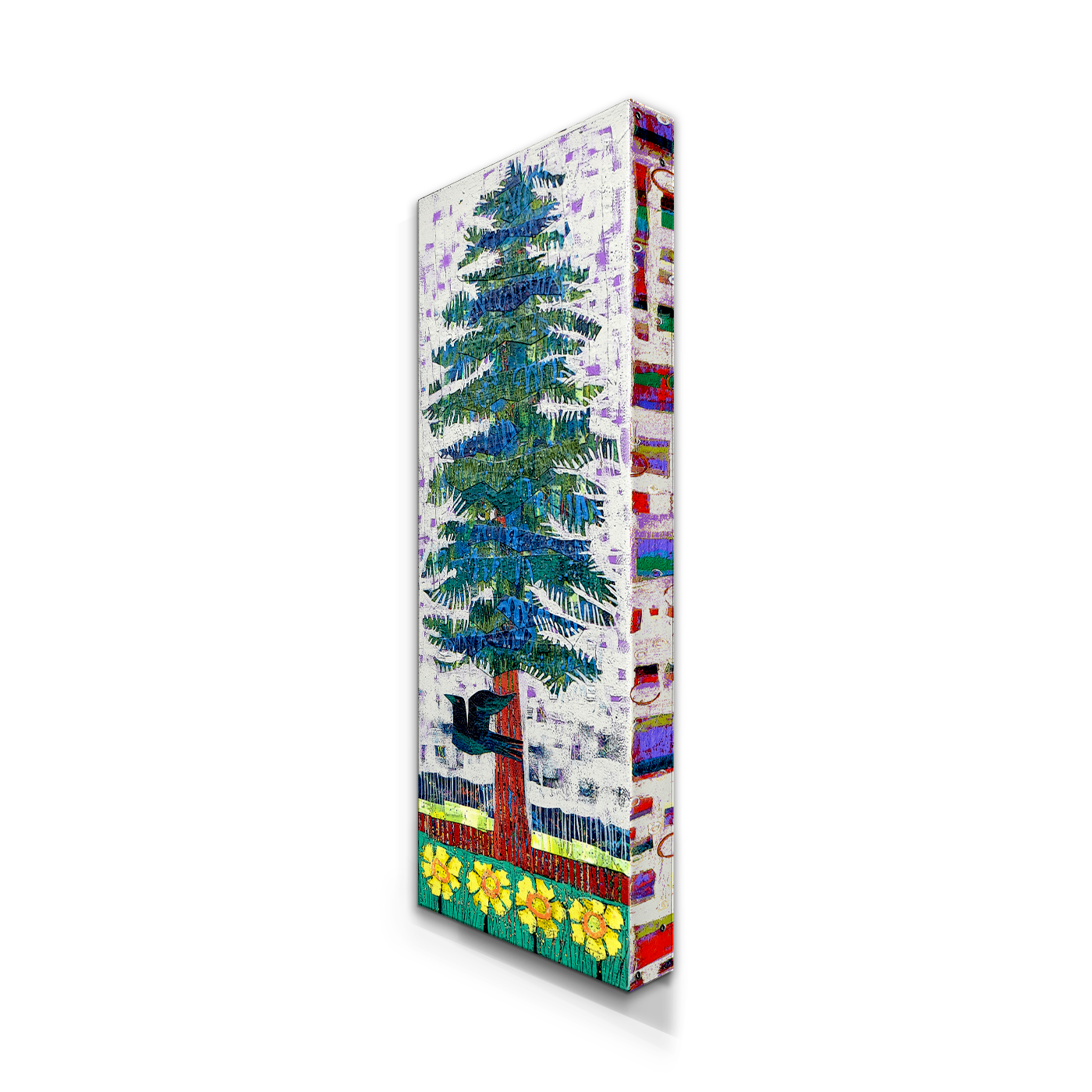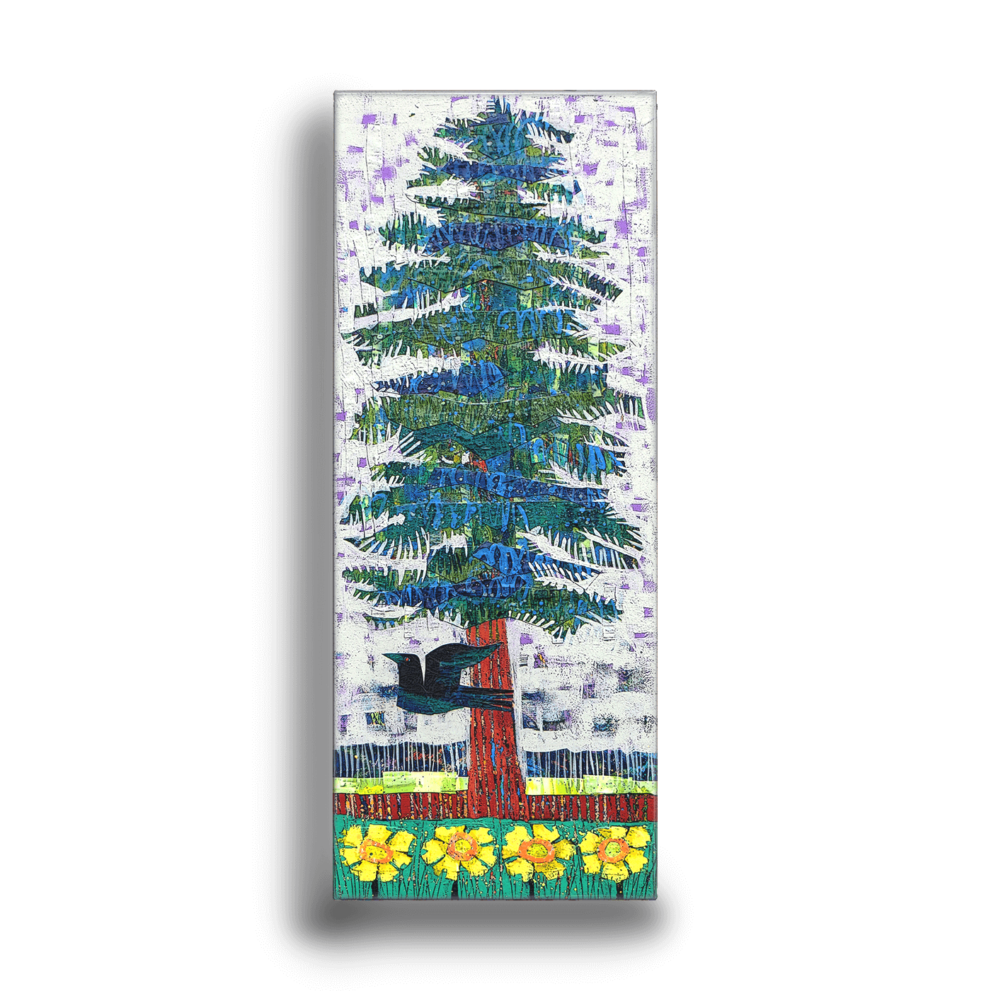 This vibrant artwork celebrates the majesty of the towering evergreen tree, surrounded by a playful bird and colorful carpet of bright yellow flowers. The intricate details of the foliage, paired with the lively movement of the bird, create a dynamic composition full of life and energy. With its bold use of color and whimsical style, this piece captures the essence of nature's beauty and interconnectedness, making it a striking addition to any space. Perfect for those who appreciate the charm of the outdoors and the artistry of the natural world.
