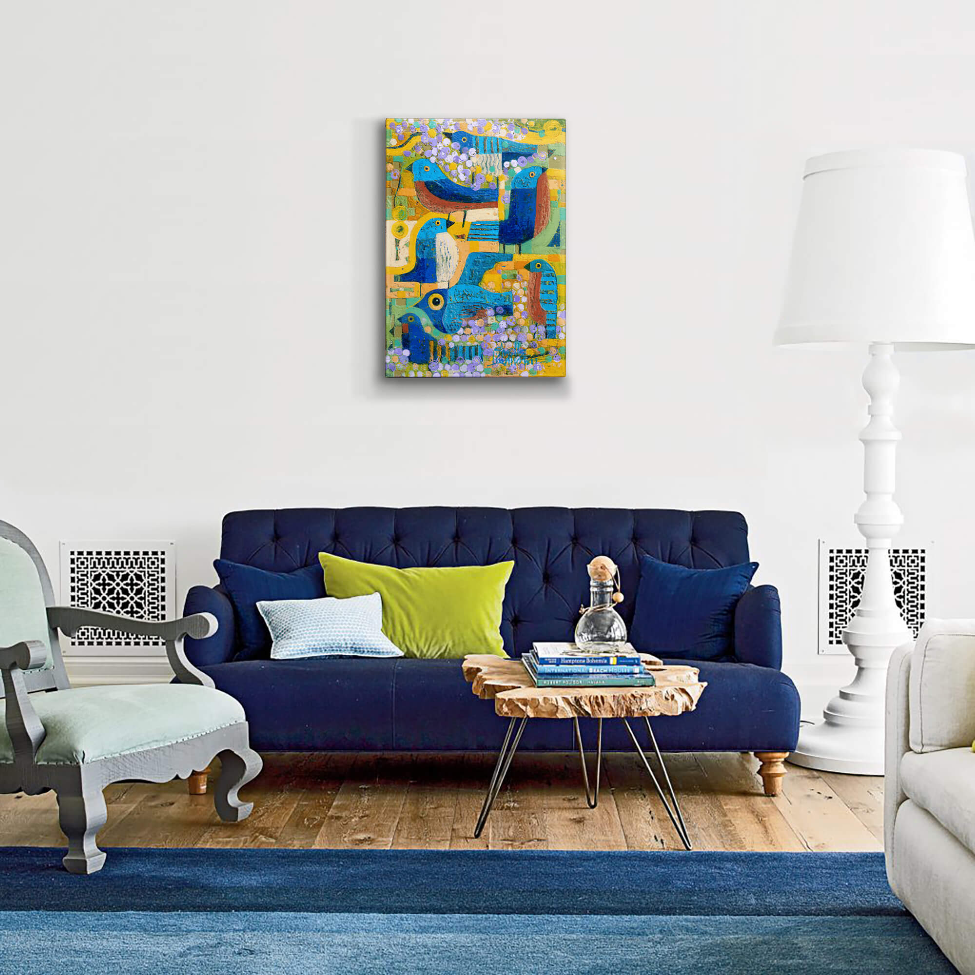 This vibrant and whimsical artwork features a delightful collection of abstract birds in rich blues and warm earthy tones. Accented with lilacs and a golden and green patchwork background, the piece creates a harmonious and lively composition. The layered textures and geometric patterns add depth, while the playful arrangement of the birds evokes a sense of community and joy. Perfect for bird enthusiasts and art lovers, this artwork is an uplifting celebration of color and creativity.