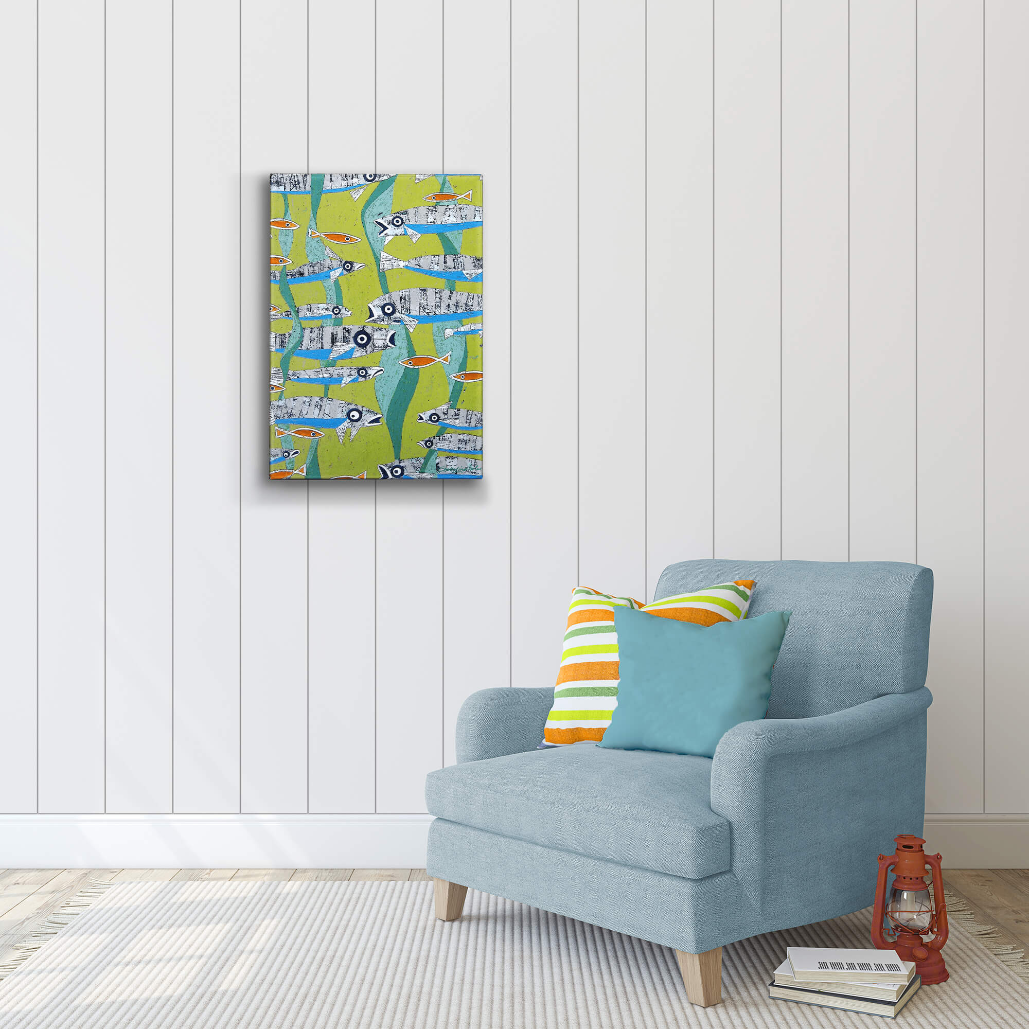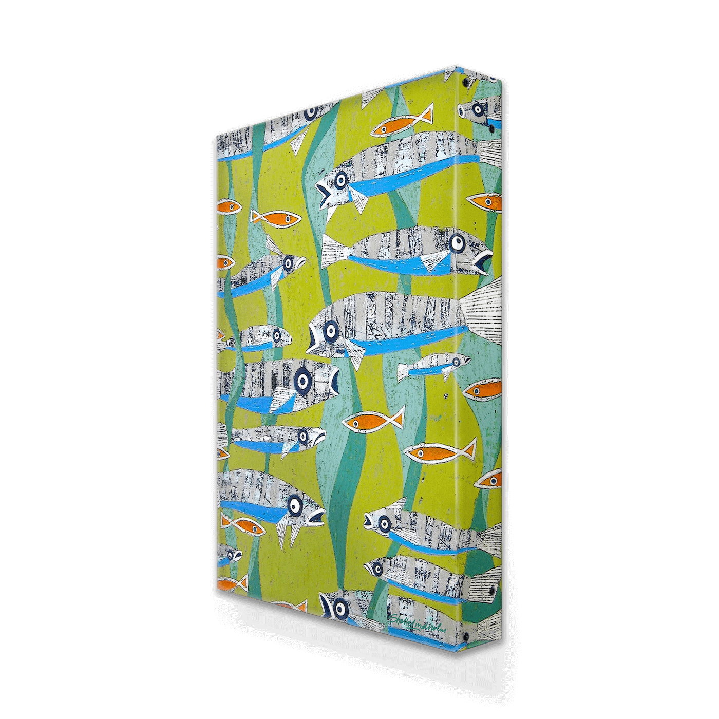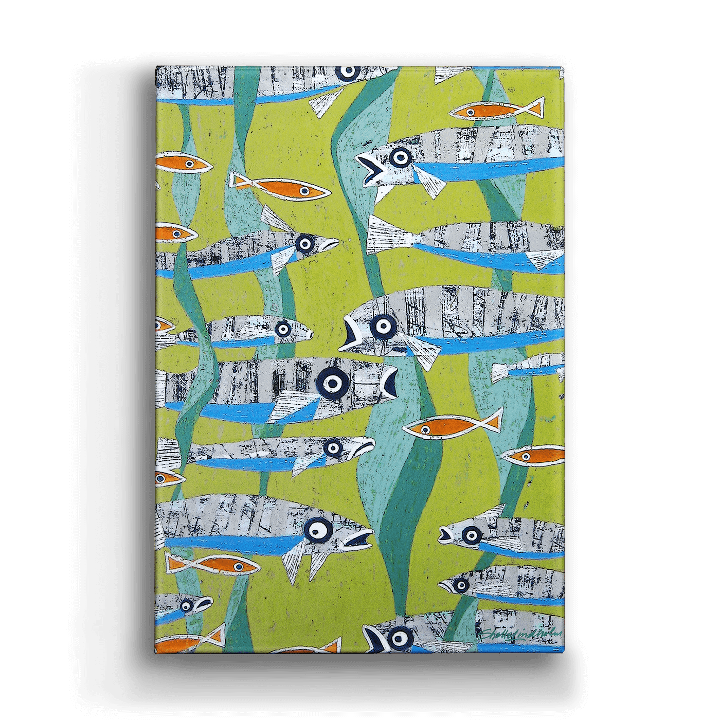 Bring a bold and unique statement to your home or office with this artwork, featuring a school of stylized fish swimming against a vibrant lime green and teal backdrop. The intricate details of the black and white fish, interspersed with small orange accent fish, create a dynamic and whimsical composition that celebrates underwater life. Perfect for fishing enthusiasts or lovers of nature-inspired art, this piece adds a splash of color and movement to any space.