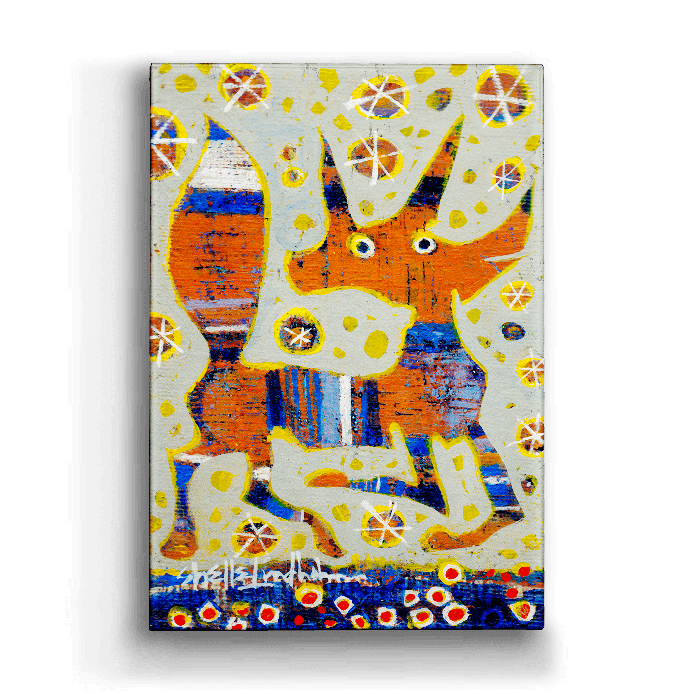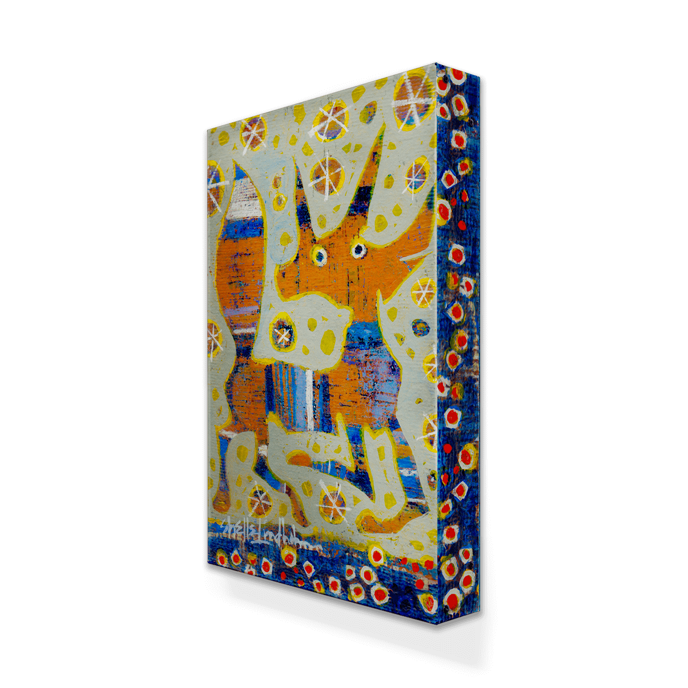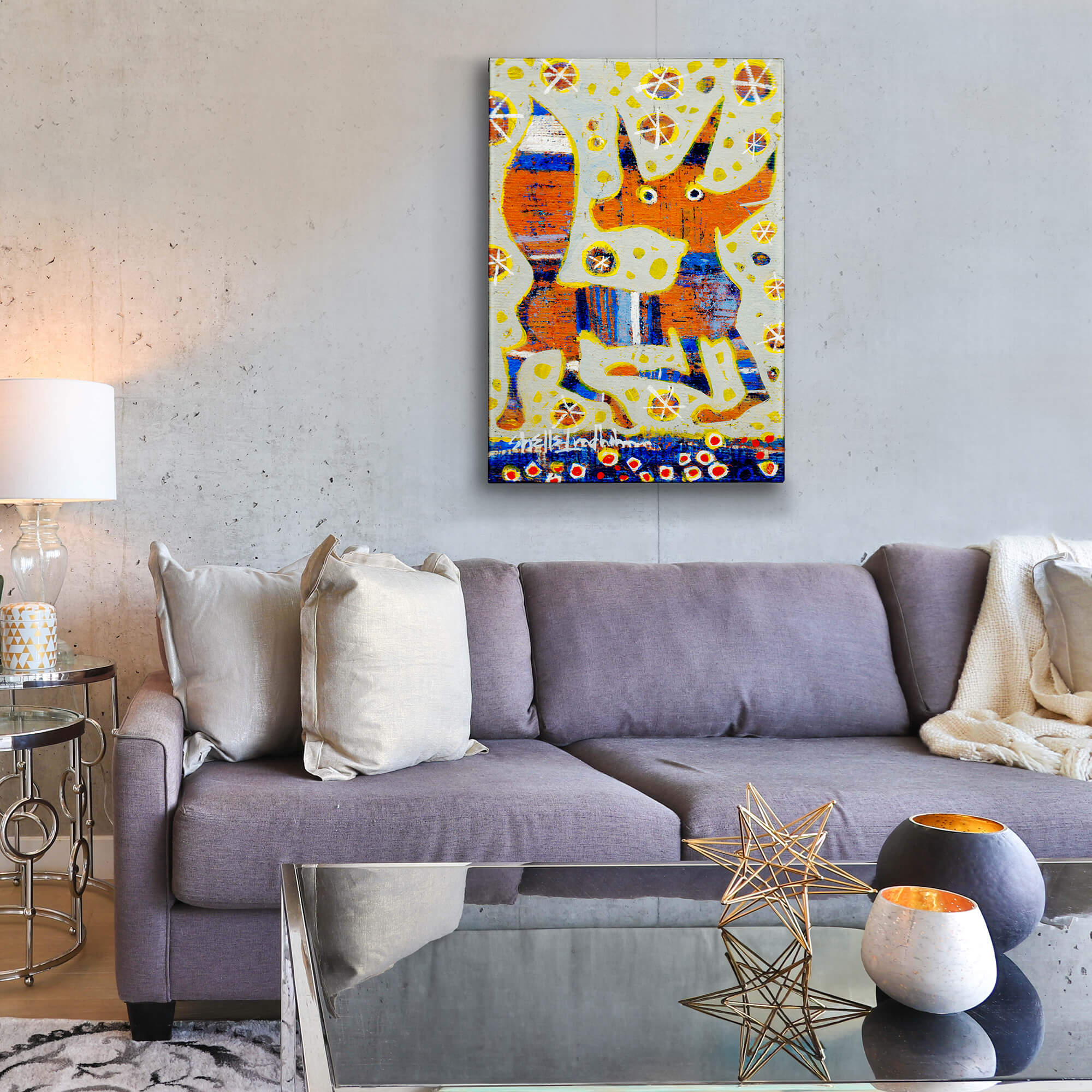 This vibrant and whimsical artwork showcases a playful abstract fox in bold orange and blue hues, surrounded by lively patterns in yellow and orange. The textured layers and contrasting colors bring a sense of energy and joy to the composition, making it a striking centerpiece for any modern or eclectic decor. Perfect for art lovers who enjoy imaginative and thought-provoking designs, this piece adds personality and a splash of color to any space.